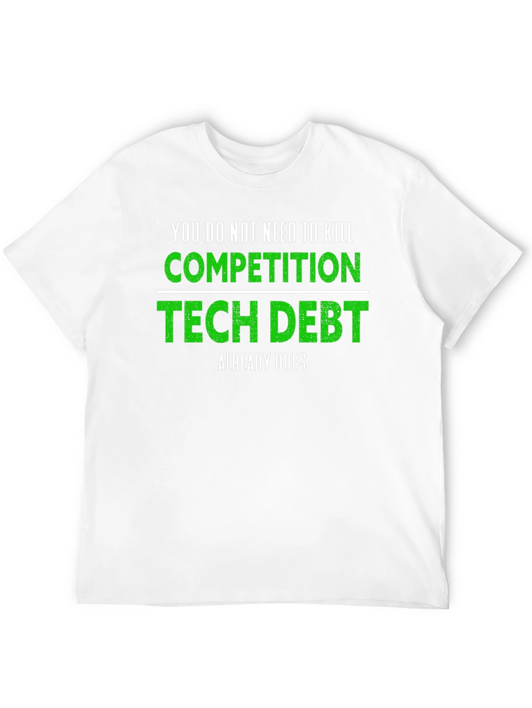 This black t-shirt features a witty statement perfect for tech enthusiasts. The bold white text reads, "YOU DO NOT NEED TO KILL" above a vibrant green "COMPETITION" and "TECH DEBT", separated by a solid white line. The shirt concludes with "ALREADY DOES" in smaller white font. Made from a comfortable-looking material, this tee is ideal for casual wear, tech conferences, or simply showcasing your coding humor. It's a great conversation starter and a unique addition to any techie's wardrobe. Show off your understanding of the challenges of technical debt with this fun and stylish t-shirt!