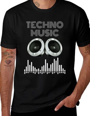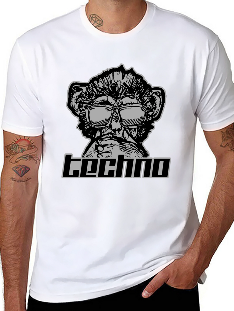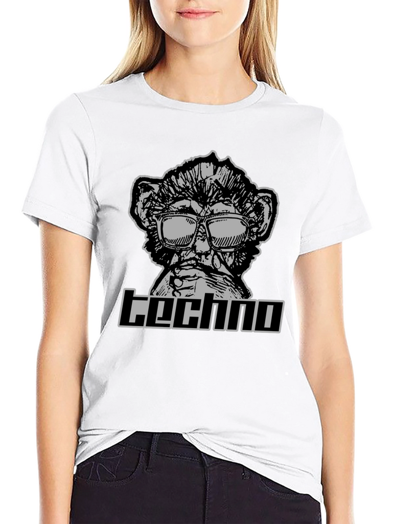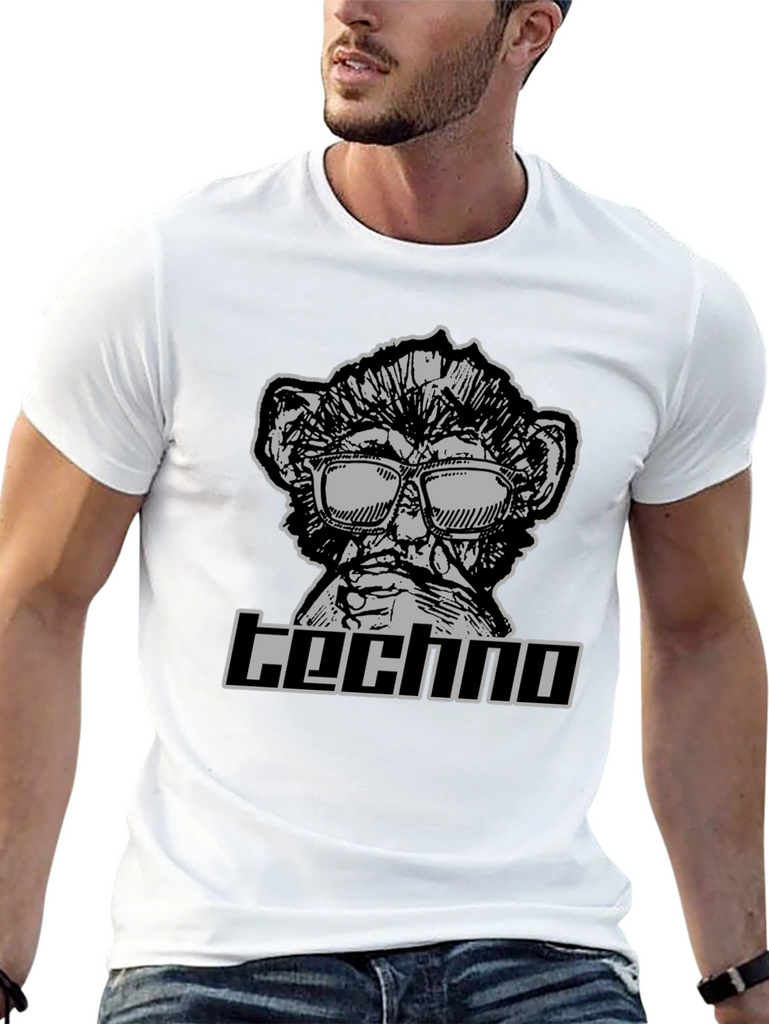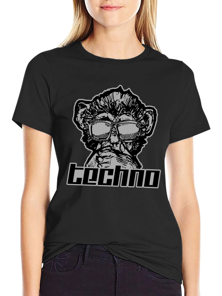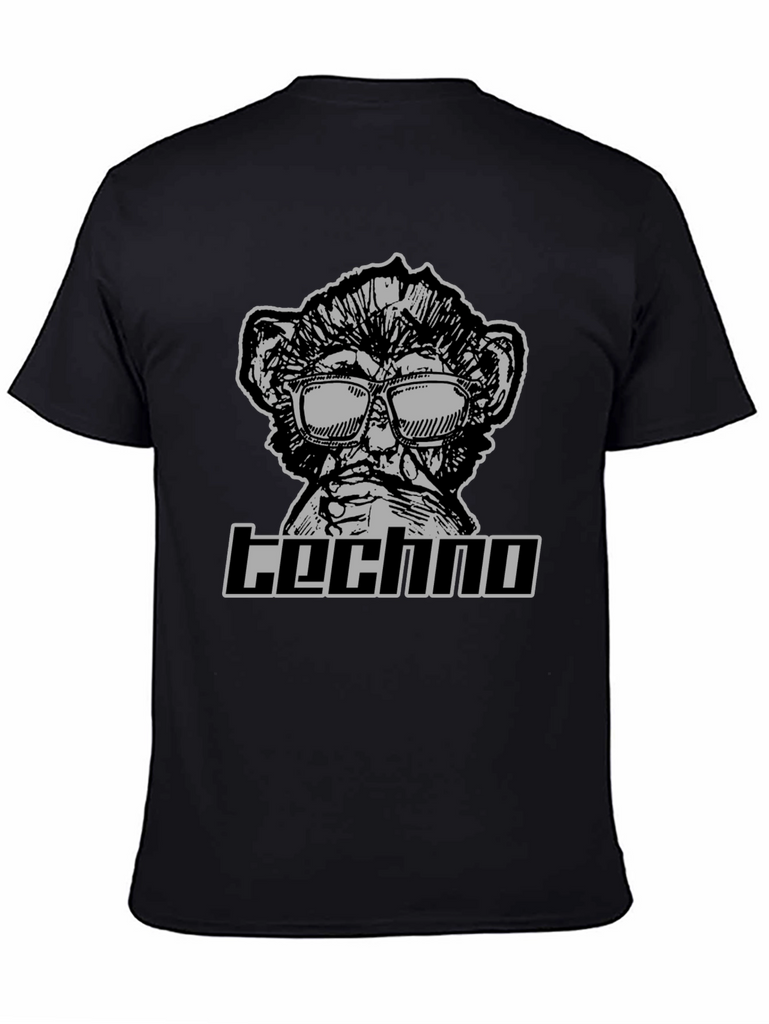 Rock a unique vibe with this black Techno Monkey graphic tee. Featuring a stylized monkey design sporting cool sunglasses and the word "Techno", this t-shirt is perfect for electronic music fans and anyone with a bold sense of style. The design is high-quality and eye-catching. Made from a comfortable-looking fabric, this casual top is ideal for club nights, music festivals, or everyday wear. Show off your love for techno music with this trendy and standout t-shirt. A must-have addition to any music lover's wardrobe!