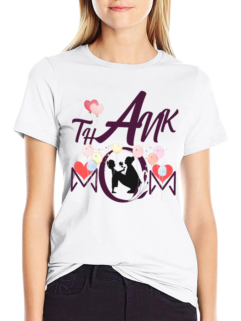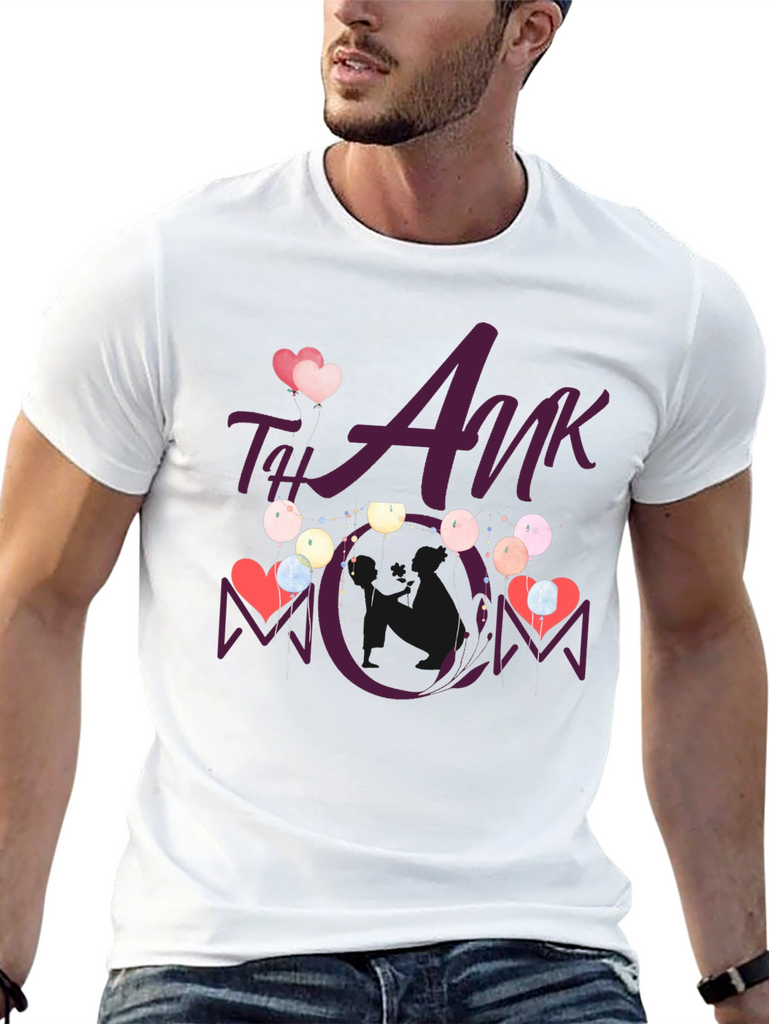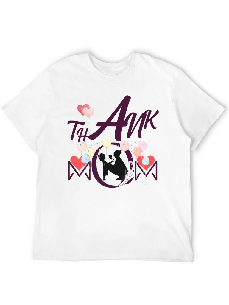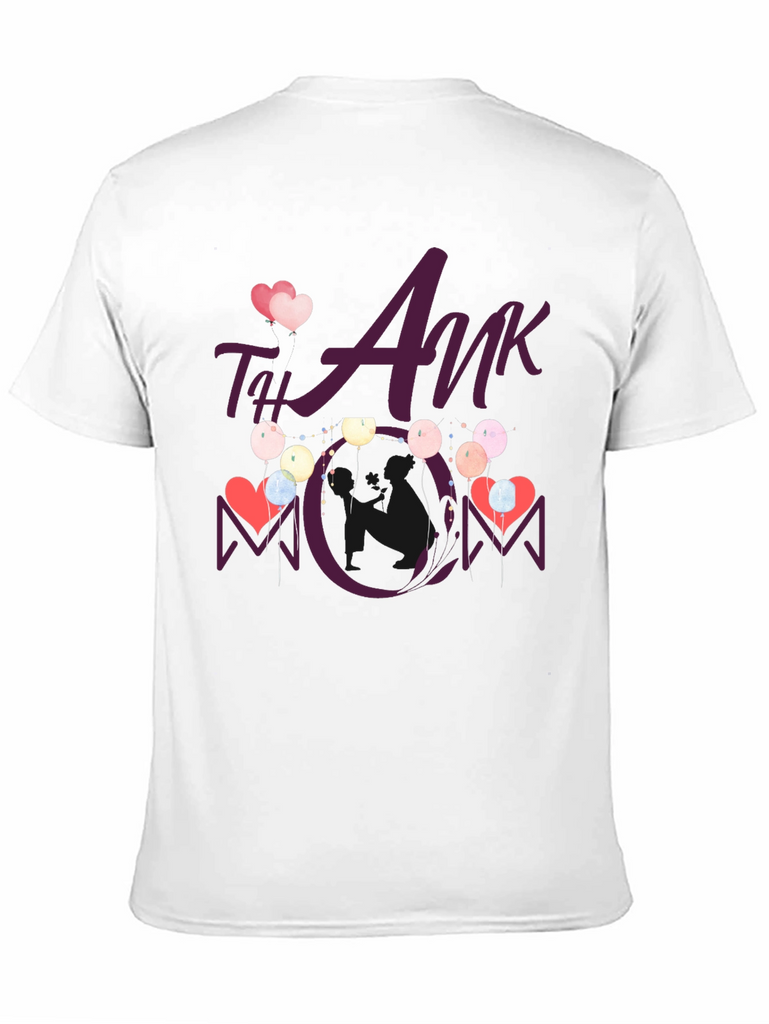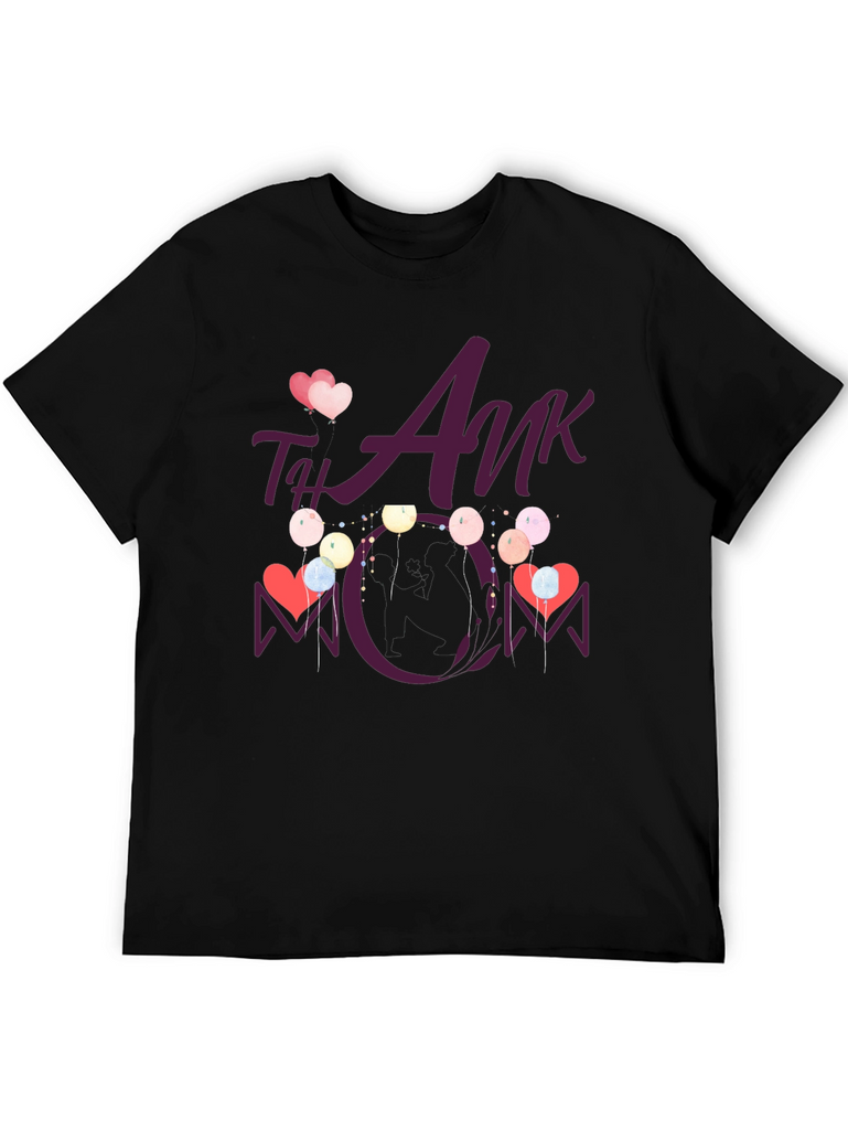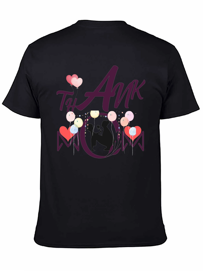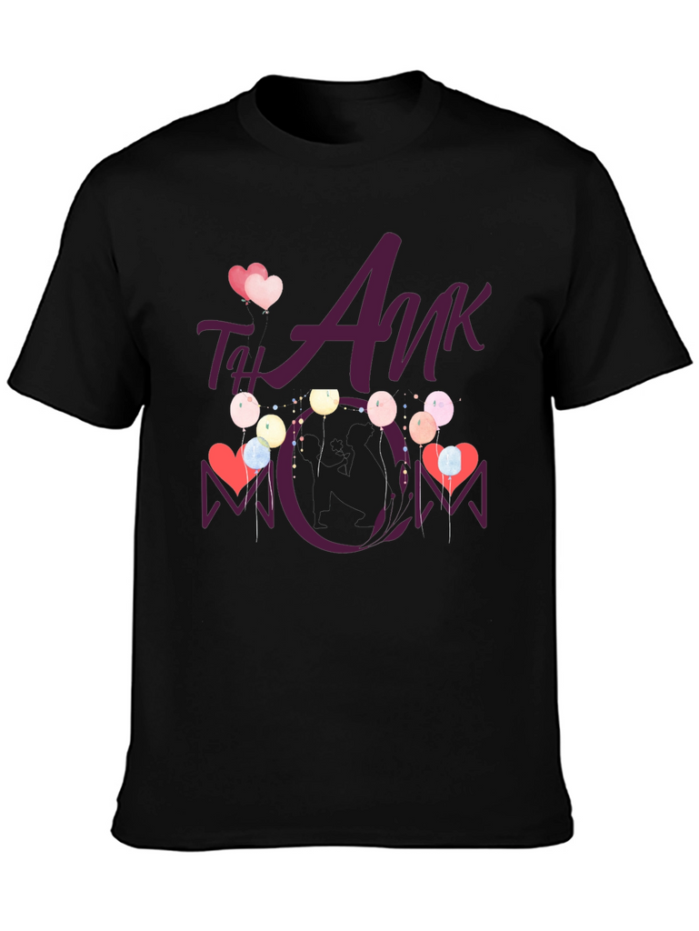 Show your appreciation with this stylish black t-shirt featuring a heartwarming "Thank You Mom" design. This tee showcases a playful graphic with hearts and balloons, making it a perfect gift for Mother's Day or any occasion to celebrate mom. The design is vividly printed, ensuring it stands out. Comfortable and casual, this t-shirt is ideal for everyday wear, family gatherings, or as a thoughtful present. Made from soft fabric, it offers both style and comfort, making it a cherished addition to any wardrobe.