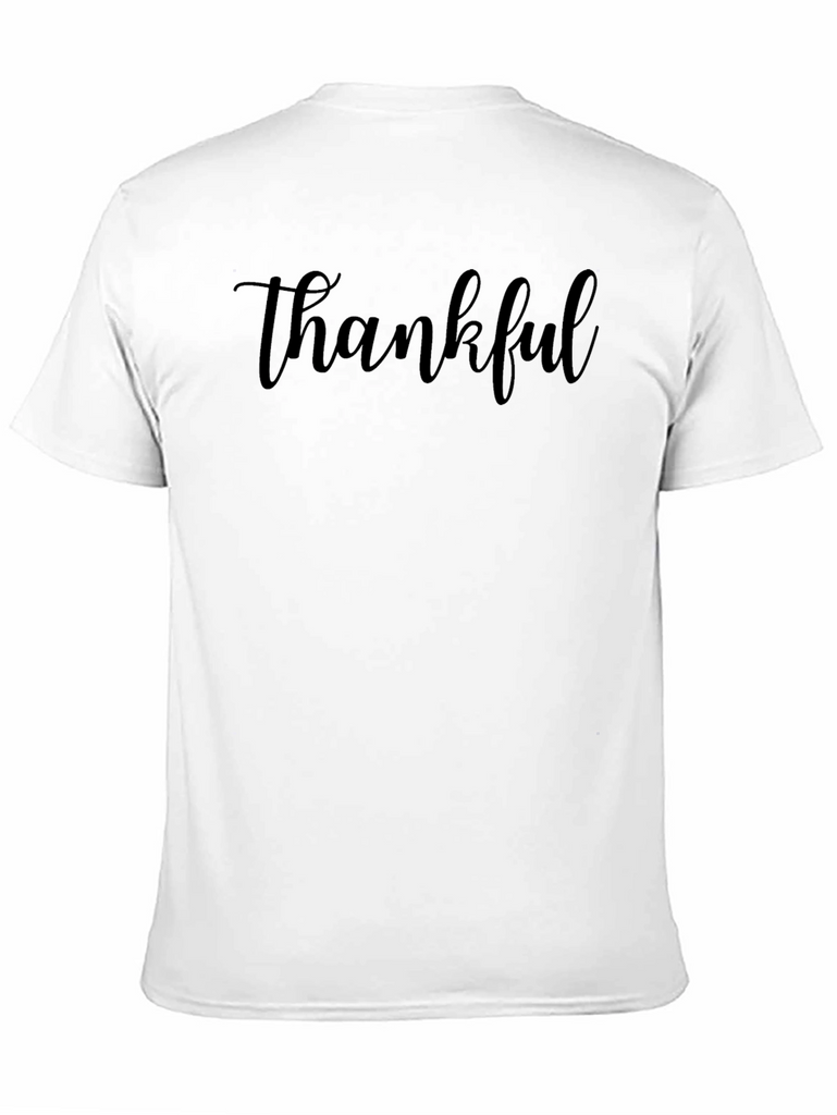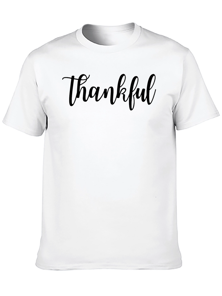 Show your gratitude with this stylish black "Thankful" graphic tee. Crafted from comfortable, breathable fabric, this short-sleeve crew neck t-shirt offers a relaxed fit, perfect for everyday wear. The simple yet elegant "Thankful" design across the chest adds a touch of positivity to your outfit, making it an ideal choice for casual outings, Thanksgiving gatherings, or simply expressing your appreciation. Pair it with jeans, shorts, or a skirt for a versatile look. A must-have addition to your wardrobe, this tee combines comfort and style with a meaningful message.