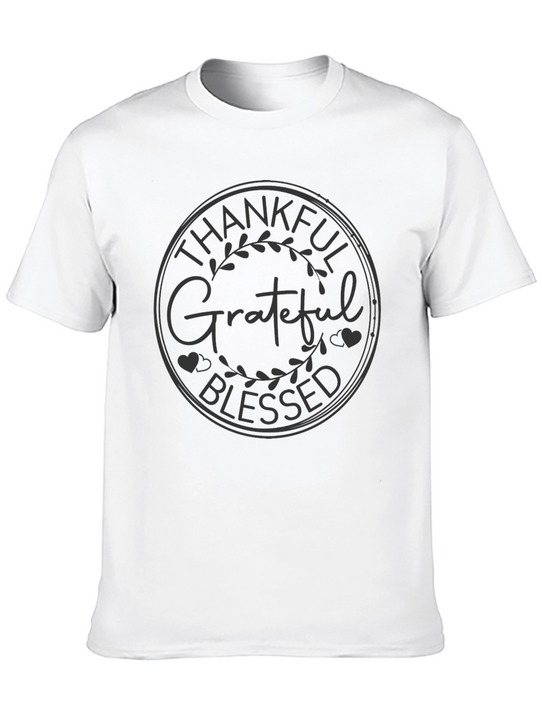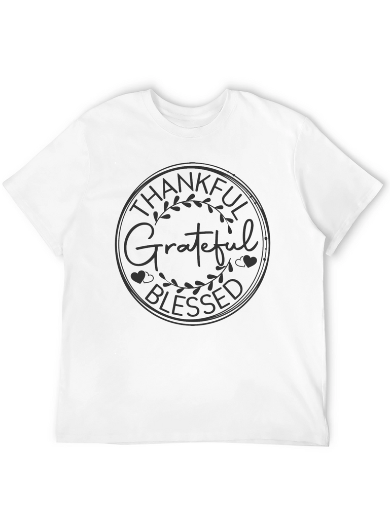 This classic black t-shirt features a striking circular graphic with the words "Thankful," "Grateful," and "Blessed" elegantly arranged within a decorative wreath design. The subdued gray color of the print contrasts subtly against the dark background, creating a sophisticated and understated look. Crafted from a soft-looking material, this shirt appears comfortable and ideal for everyday wear. Its versatile style makes it perfect for casual outings, family gatherings, or simply expressing a positive outlook. Show your gratitude and style with this unique t-shirt!