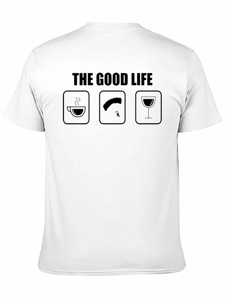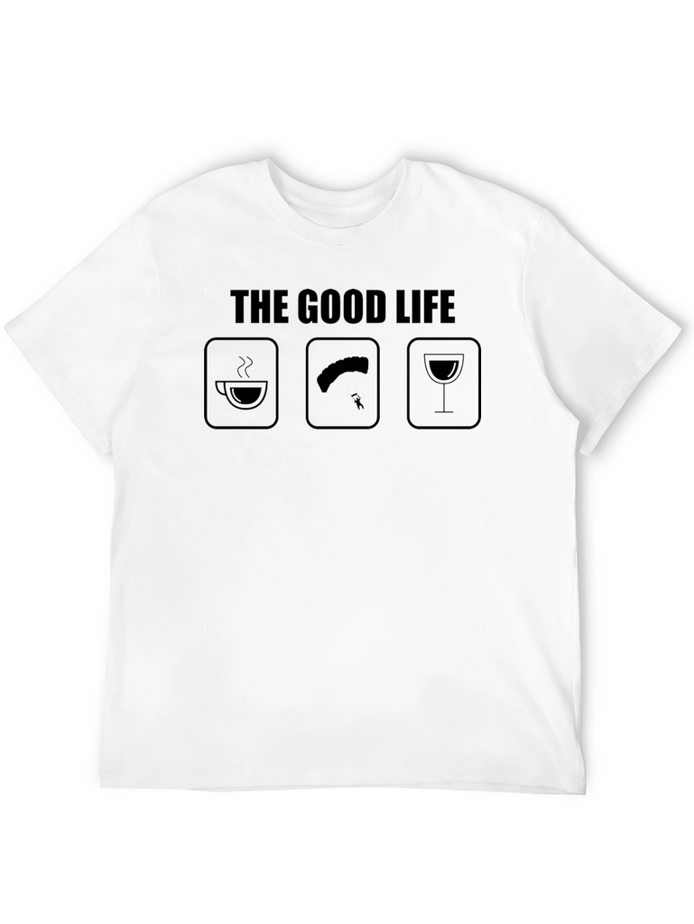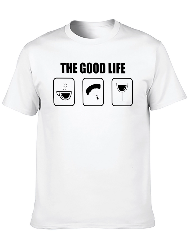 Embrace 'The Good Life' with this stylish black t-shirt. It features a humorous design depicting the essentials of a fulfilling day: a steaming cup of coffee, an exhilarating skydiving adventure, and a relaxing glass of wine. The design is printed in a crisp, clean style, making it easily readable. Made from comfortable material, this tee is perfect for casual wear, expressing your adventurous and laid-back personality. Ideal for skydiving enthusiasts, coffee lovers, wine aficionados, or anyone who appreciates the finer things in life. Show off your unique sense of humor and passion with this eye-catching t-shirt.
