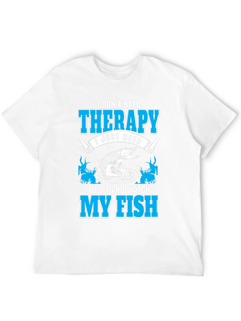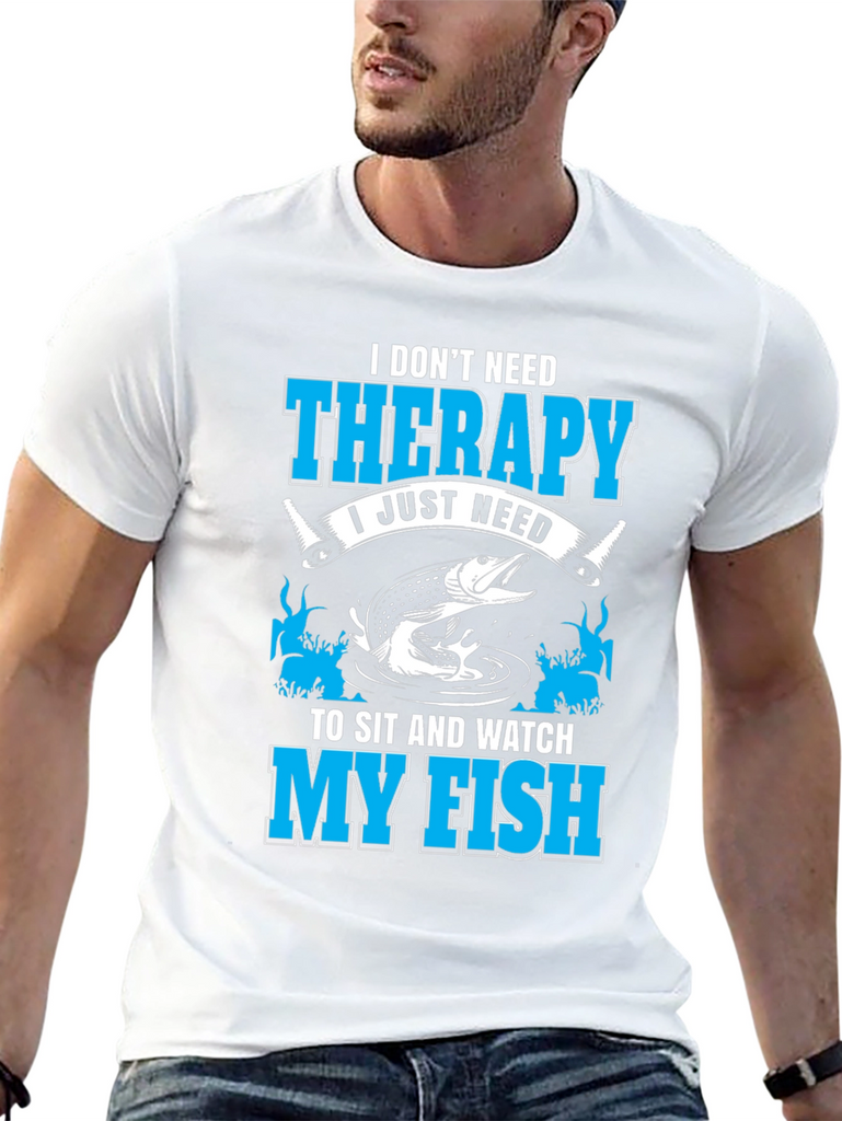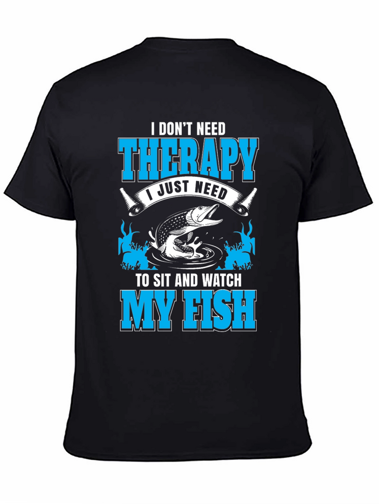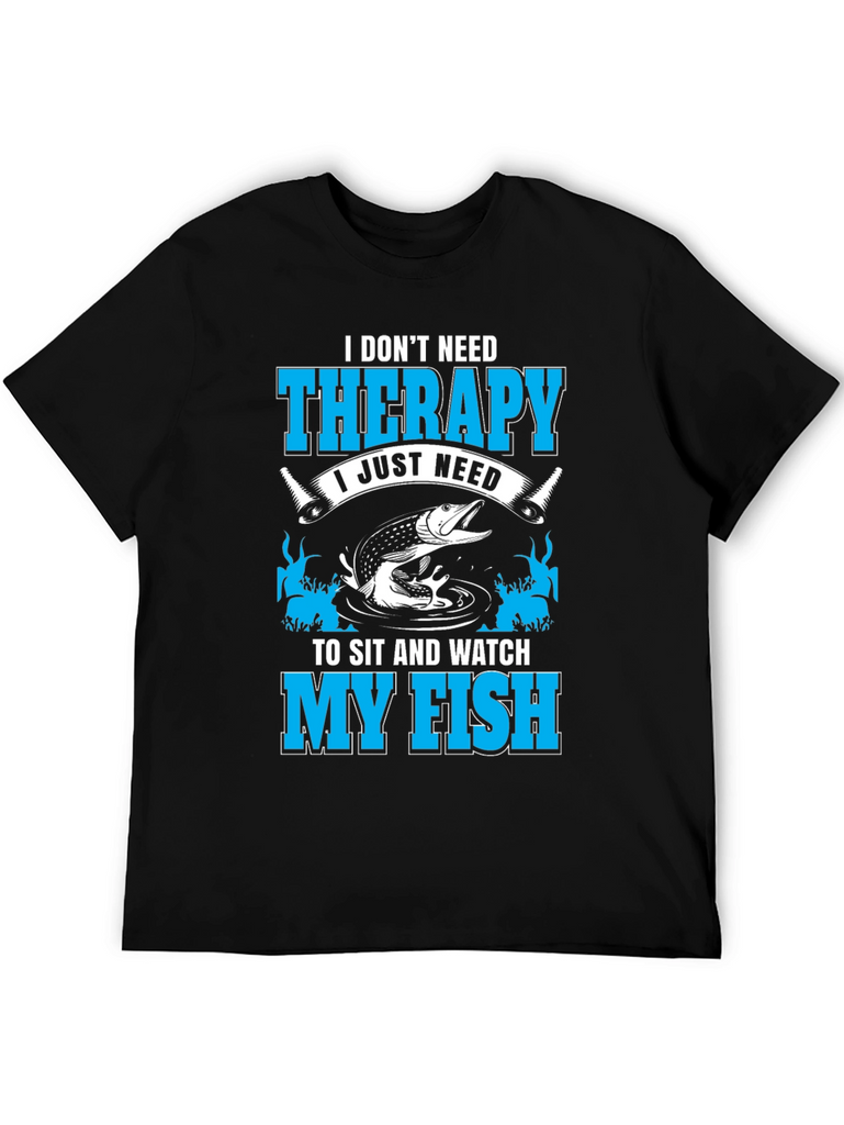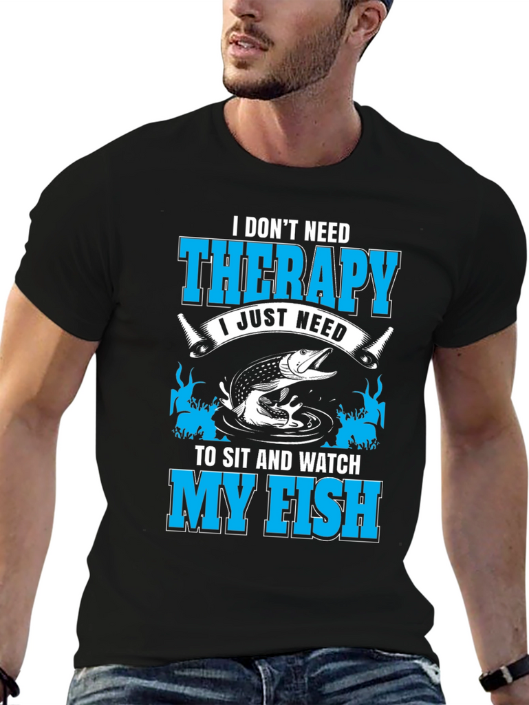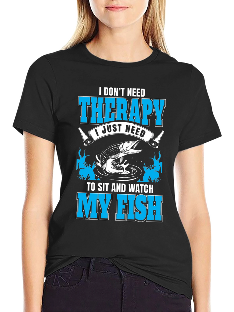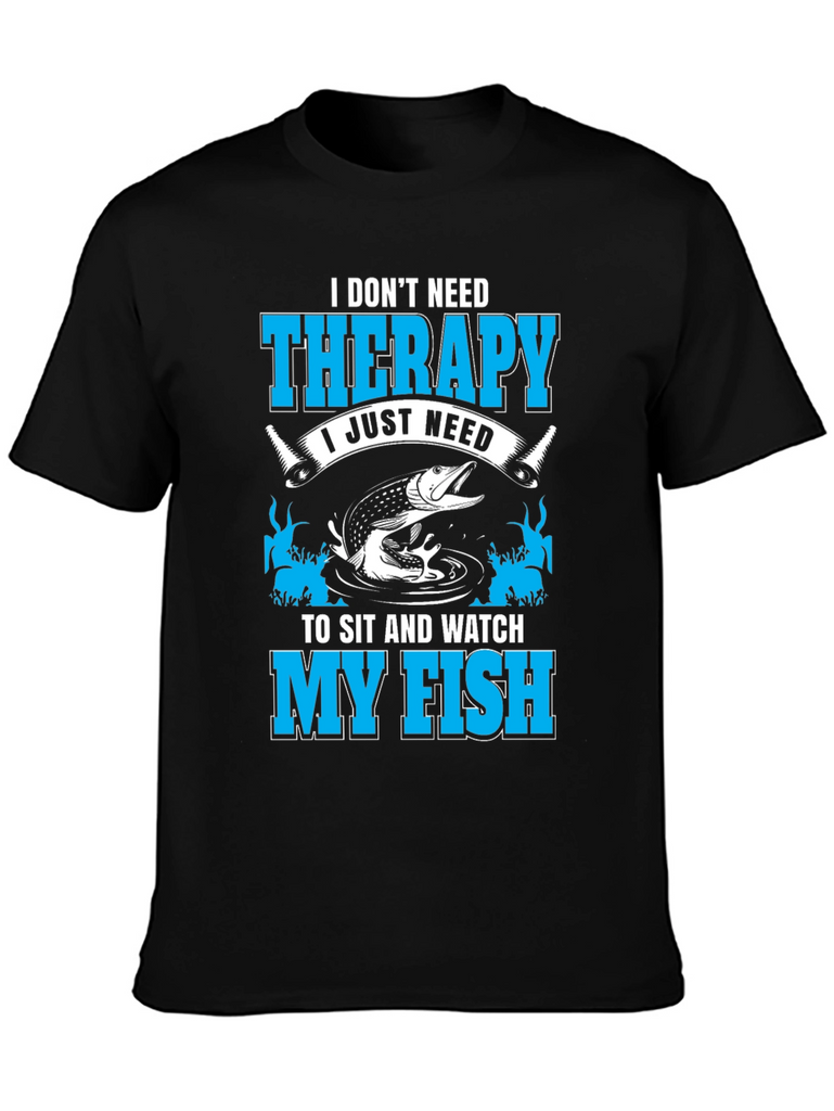 This classic black t-shirt features a unique and humorous graphic design. The shirt reads 'I DON'T NEED THERAPY I JUST NEED TO SIT AND WATCH MY FISH' in a bold, eye-catching blue font. An artistic illustration of a fish adds a touch of character to the design, making it perfect for fishing enthusiasts or anyone with a good sense of humor. Made from a comfortable-looking fabric, this t-shirt would be ideal for casual wear, fishing trips, or as a gift for the angler in your life.