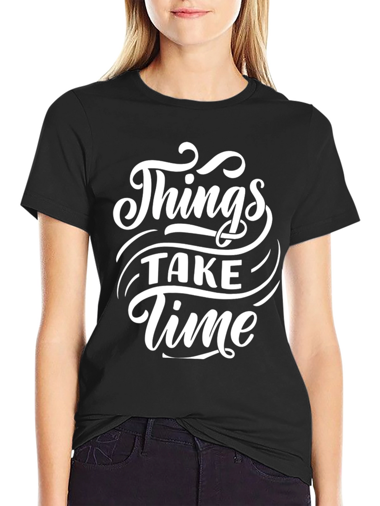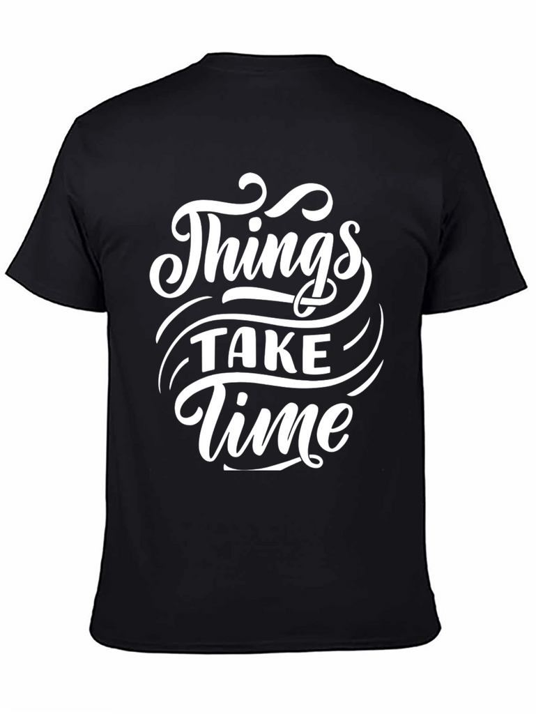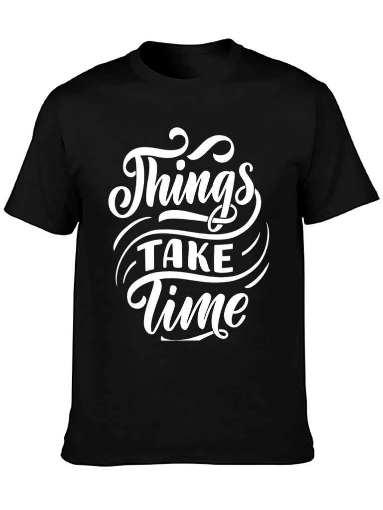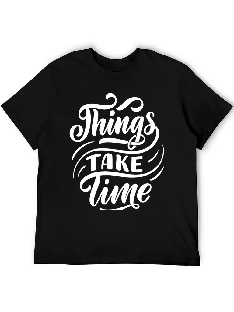 This classic black tee features a stylish white graphic print that reads "Things Take Time". Made from a comfortable-looking fabric, this t-shirt is ideal for casual wear. The bold font and design make it a standout piece, perfect for expressing a laid-back yet optimistic attitude. Whether you're running errands, hanging out with friends, or just relaxing at home, this tee offers both comfort and style. A great addition to any wardrobe for its simple yet meaningful message.