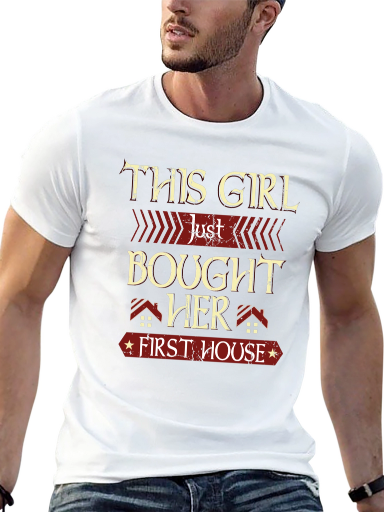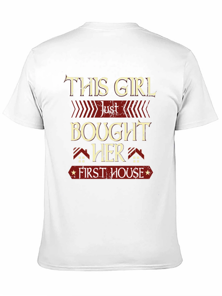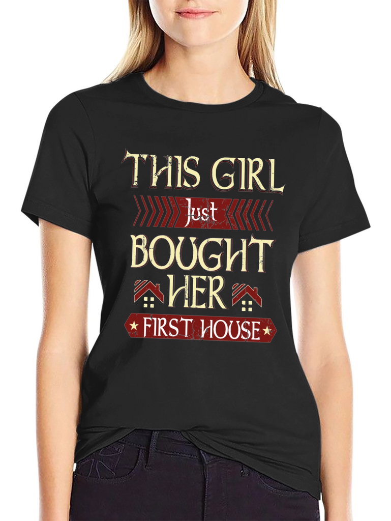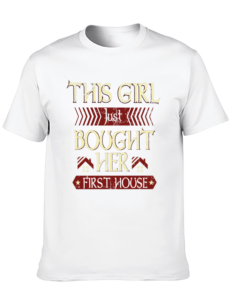 Celebrate a major milestone with this fun novelty t-shirt. The design features the words "THIS GIRL Just BOUGHT HER FIRST HOUSE" in a decorative font. The shirt is made of a comfortable, soft fabric. This would make a thoughtful gift for someone who has just purchased their first home. Wear it while unpacking, decorating, or celebrating this huge achievement. This tee makes a great conversation starter. Get yours today and show off your new homeownership!