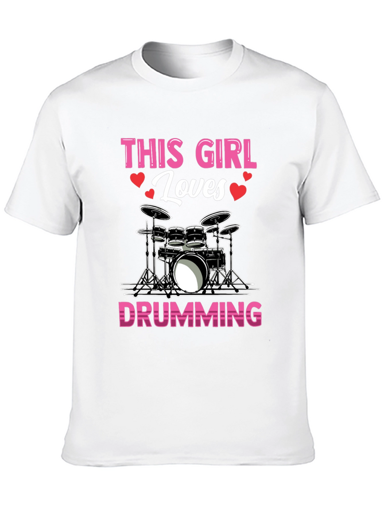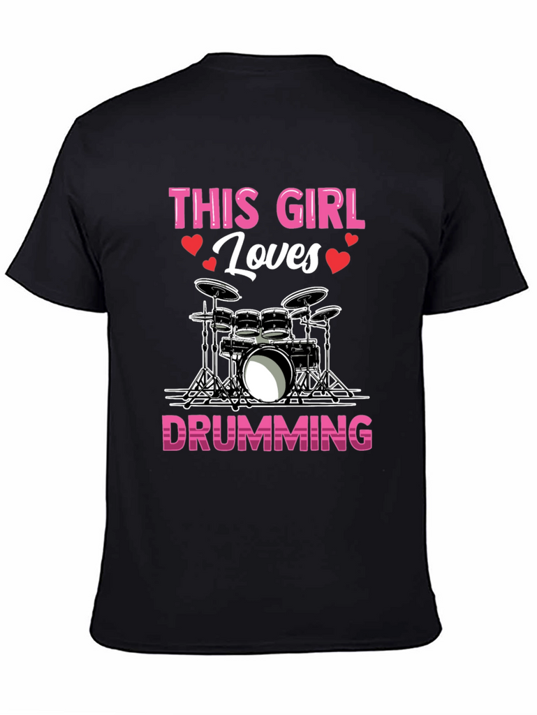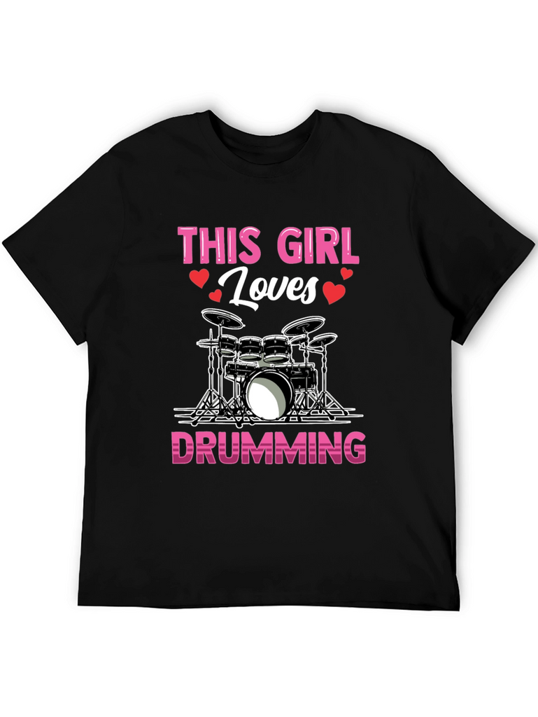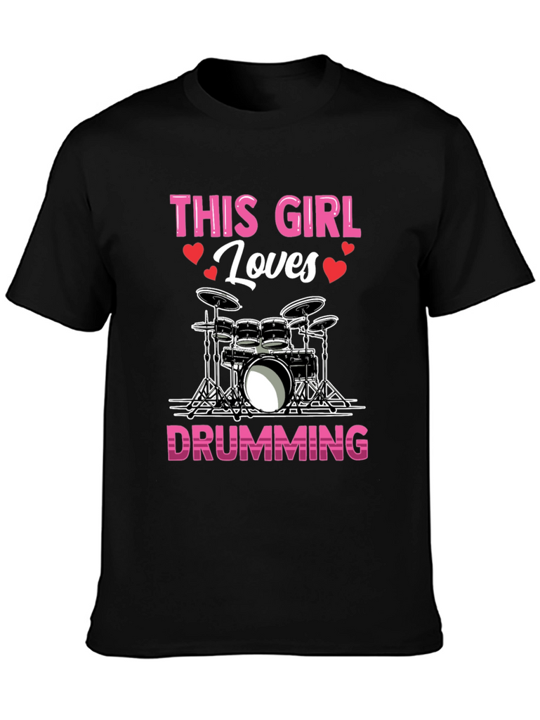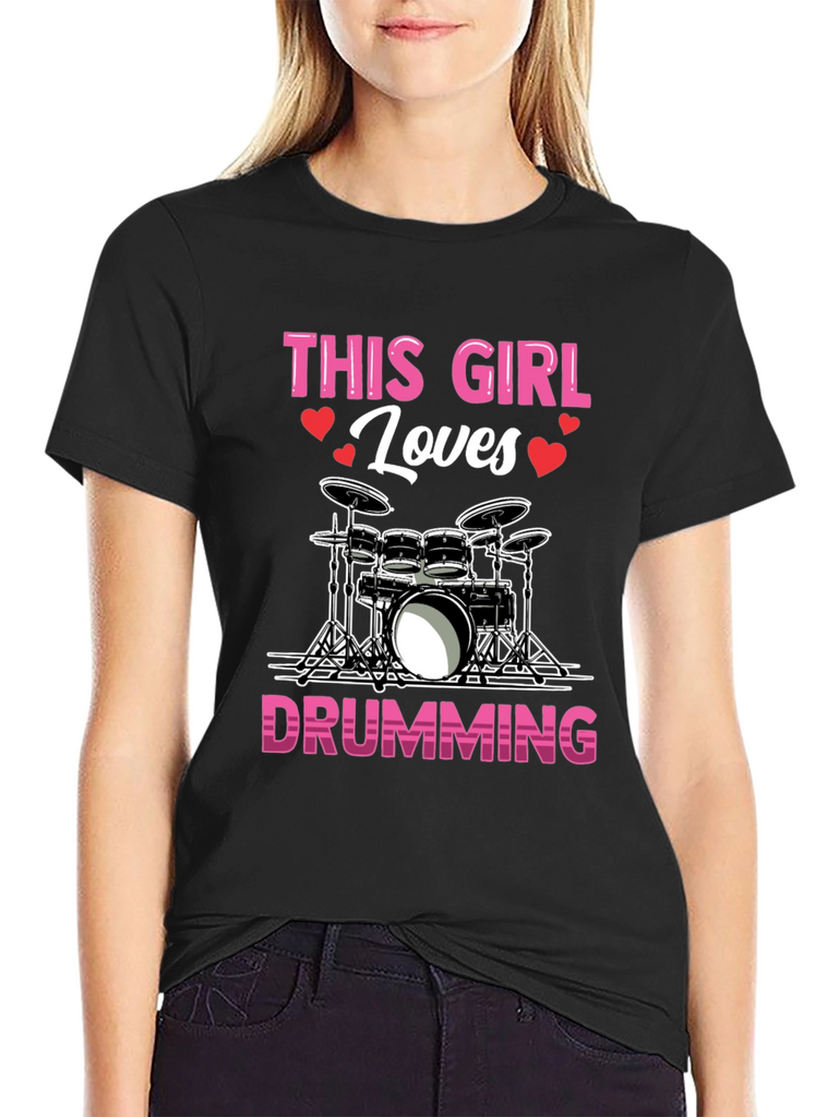 Show your passion for drumming with this stylish black t-shirt. Featuring a graphic print of a drum kit and the phrase "This Girl Loves Drumming" in a playful pink font with heart accents, this tee is perfect for any female drummer or music enthusiast. The design is printed on a comfortable, presumably cotton blend fabric, suitable for everyday wear. Ideal for band practice, casual outings, or as a gift for the drummer girl in your life. Rock your style and let the world know you love drumming!