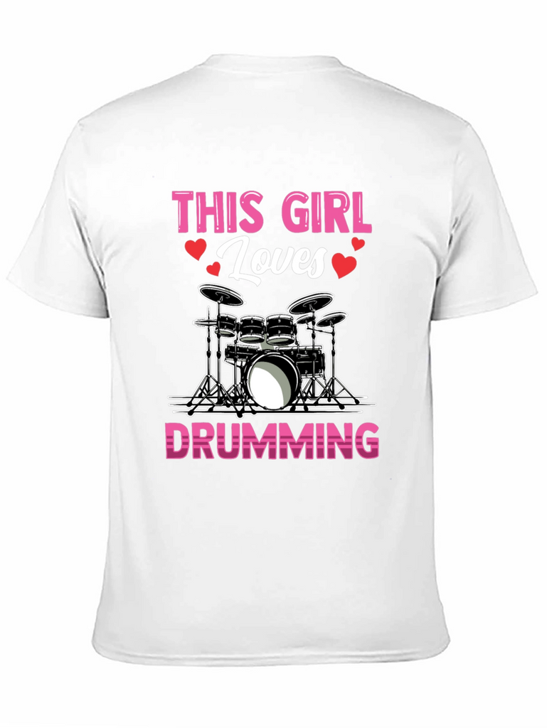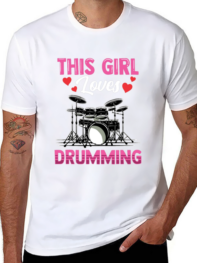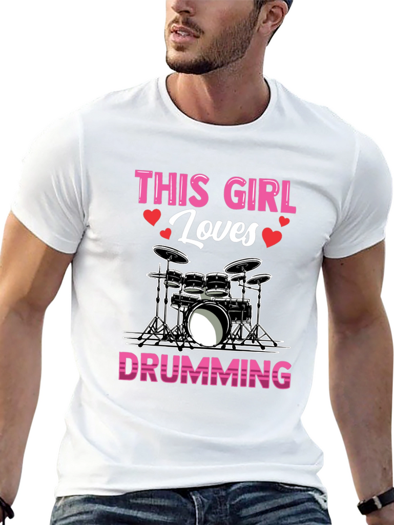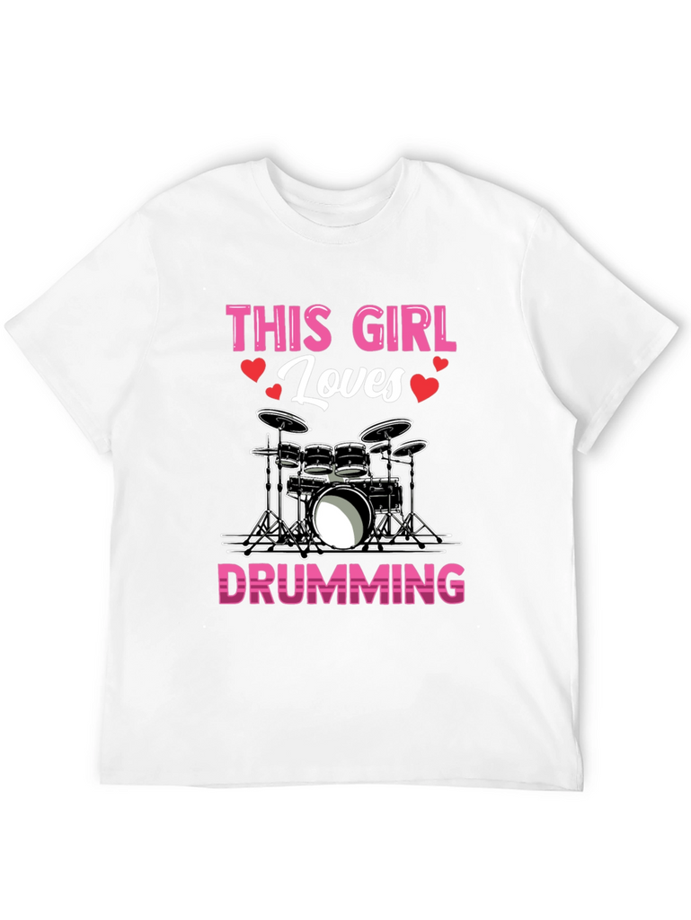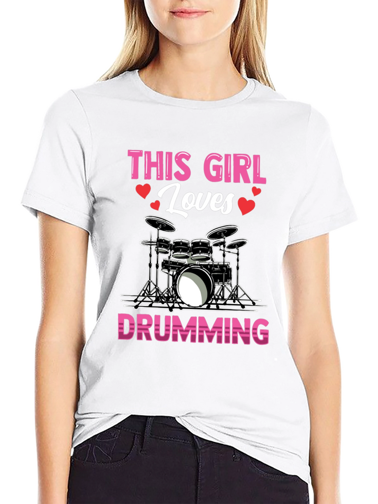 Show your passion for drumming with this stylish black t-shirt. Featuring a graphic print of a drum kit and the phrase "This Girl Loves Drumming" in a playful pink font with heart accents, this tee is perfect for any female drummer or music enthusiast. The design is printed on a comfortable, presumably cotton blend fabric, suitable for everyday wear. Ideal for band practice, casual outings, or as a gift for the drummer girl in your life. Rock your style and let the world know you love drumming!