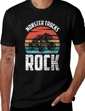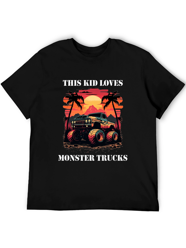 Show off your child's love for monster trucks with this awesome t-shirt! The shirt features a vibrant graphic of a monster truck set against a backdrop of palm trees and a sunset. The words "THIS KID LOVES" and "MONSTER TRUCKS" are printed in bold, white letters above and below the graphic. Made from a soft, comfortable material, this t-shirt is perfect for everyday wear or as a gift for the monster truck enthusiast in your life. Ideal for casual outings, school events, or simply lounging at home, this eye-catching tee is sure to become a favorite in any young monster truck fan's wardrobe.