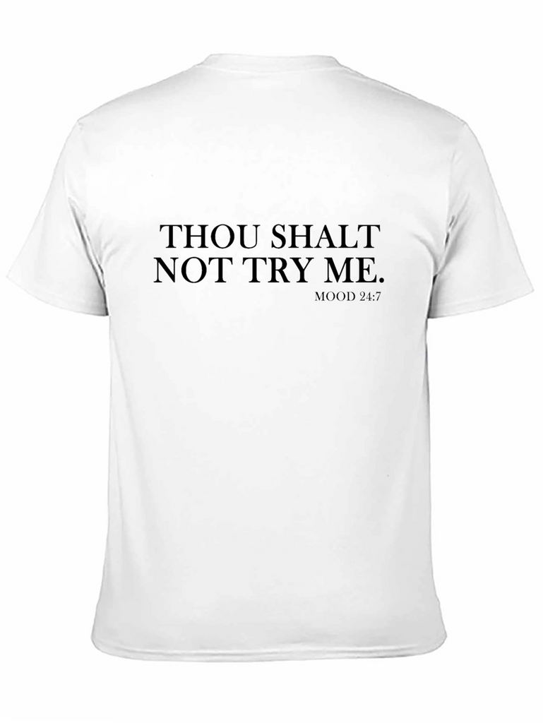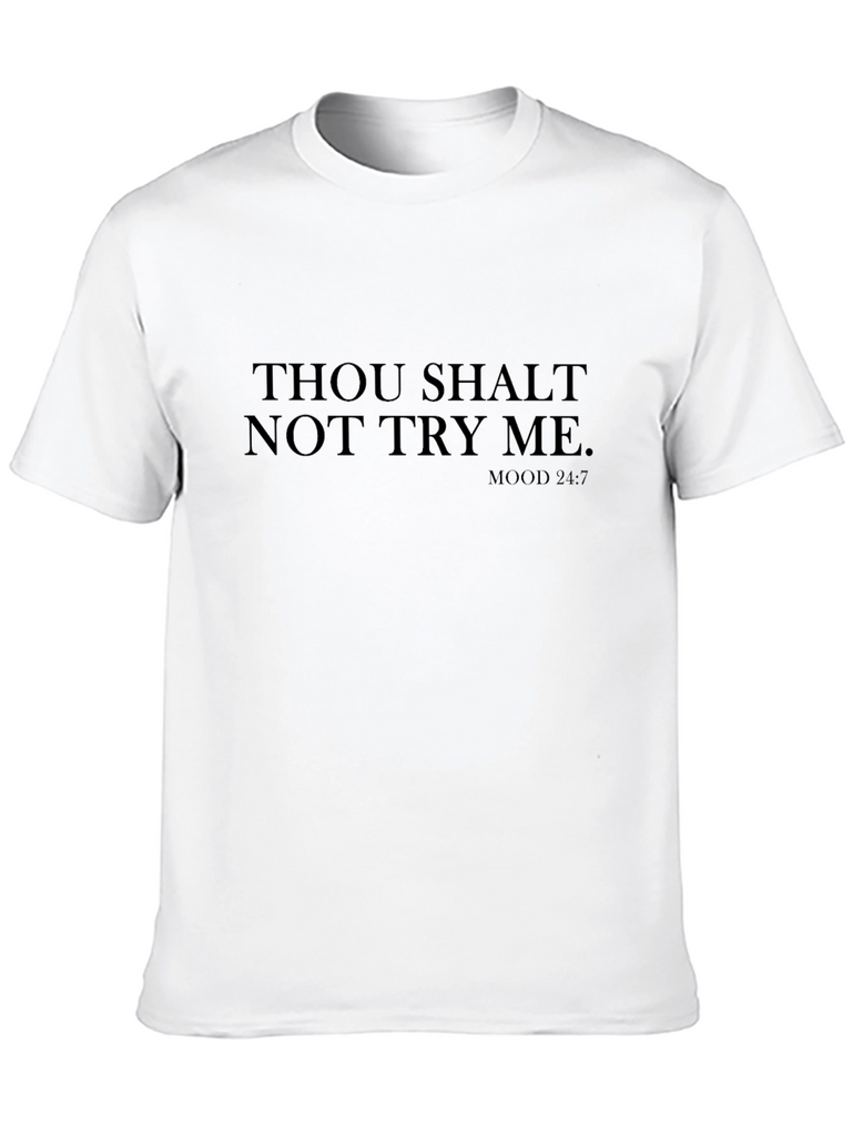 Make a statement with this bold black t-shirt. Featuring the amusing phrase "Thou Shalt Not Try Me", this tee is perfect for expressing your personality with a touch of wit. The shirt has a classic crew neck and short sleeves, offering a comfortable and stylish fit. Made from soft, breathable fabric, it's ideal for everyday wear. Pair it with jeans or shorts for a casual look. A fun and expressive addition to any wardrobe.