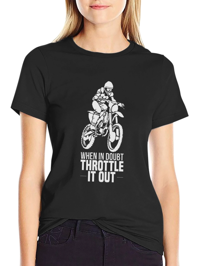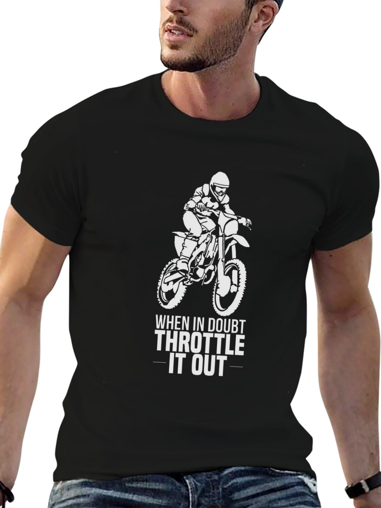 This classic black t-shirt features a striking white graphic design perfect for motocross enthusiasts. The bold image showcases a rider on a dirt bike, paired with the phrase "WHEN IN DOUBT THROTTLE IT OUT." Made from a comfortable material, this tee is ideal for casual wear, showcasing your passion for motorsports. Its eye-catching design and motivational slogan make it a great conversation starter and a must-have addition to any rider's wardrobe. Wear it to the track, out with friends, or simply while relaxing at home. A statement piece for anyone who loves the thrill of the ride!