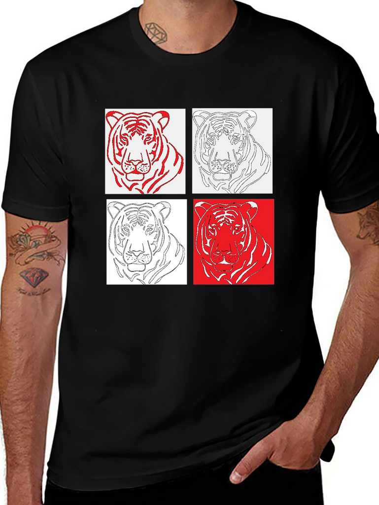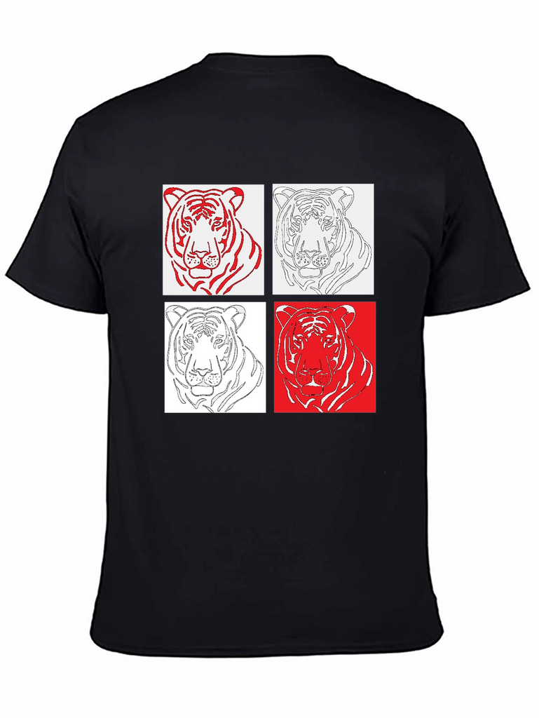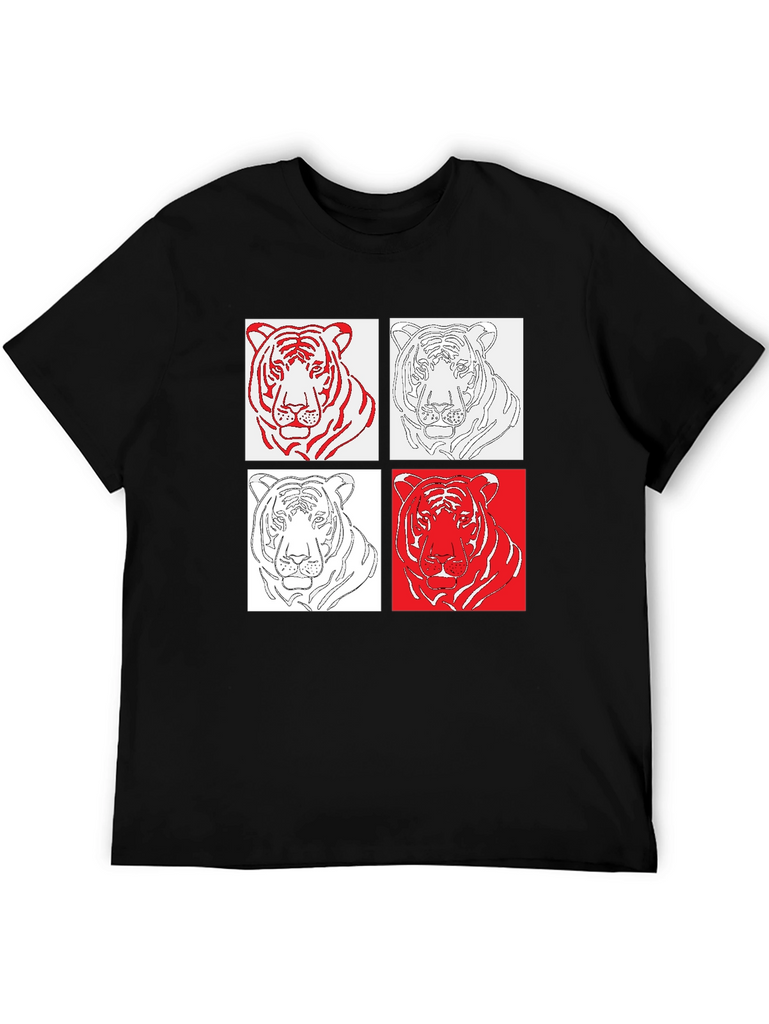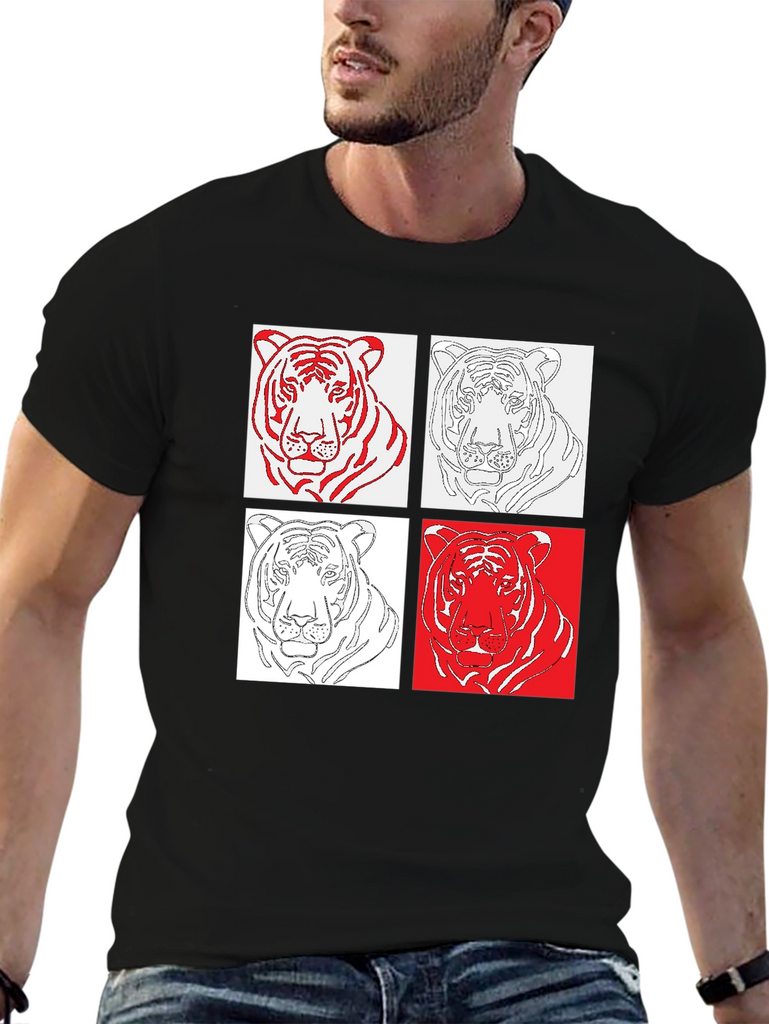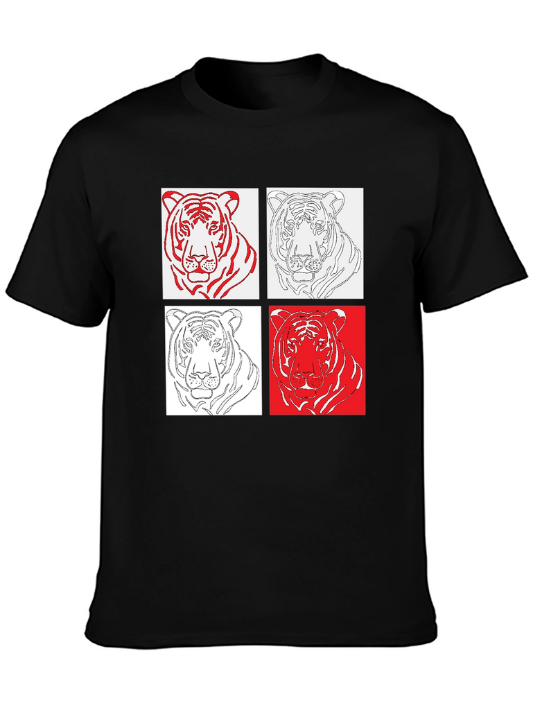 Show off your wild side with this stylish black t-shirt featuring a unique graphic design! The shirt displays four different tiger head illustrations in a square pattern. Two of the tiger images are in striking red, while the other two are in white. This eye-catching contrast adds a bold and artistic touch to a classic wardrobe staple. Made from what looks like comfortable cotton blend, this tee is perfect for casual wear, concerts, or making a statement wherever you go. A great conversation starter, this shirt is a must-have for animal lovers and art enthusiasts alike. Upgrade your wardrobe today!