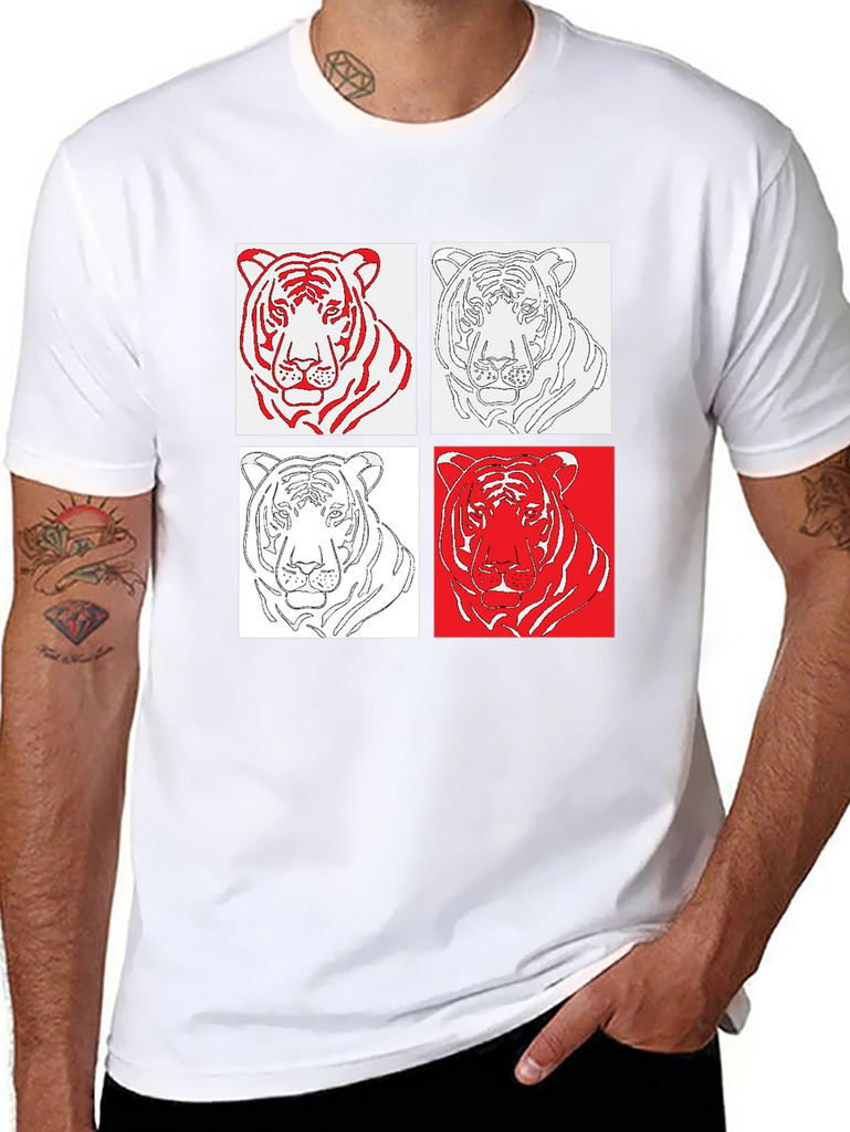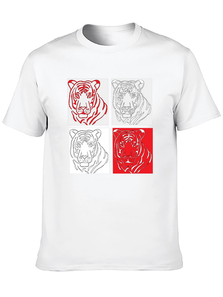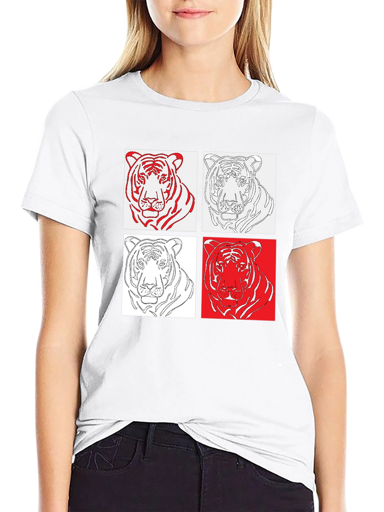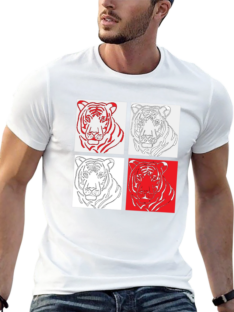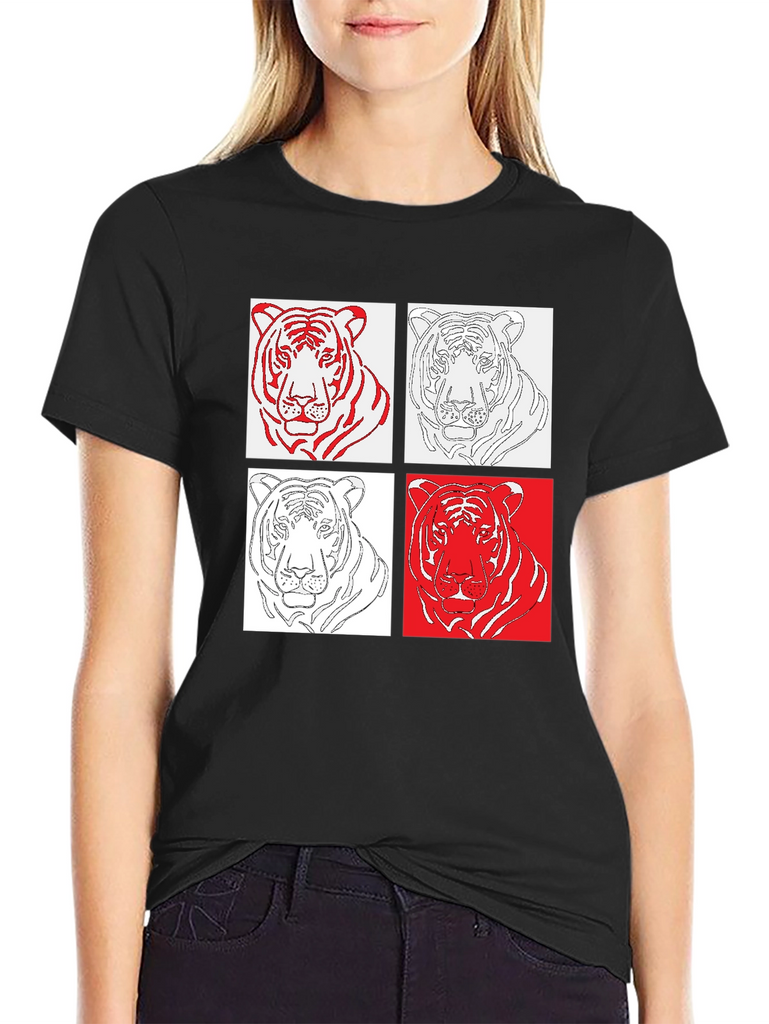 Show off your wild side with this stylish black t-shirt featuring a unique graphic design! The shirt displays four different tiger head illustrations in a square pattern. Two of the tiger images are in striking red, while the other two are in white. This eye-catching contrast adds a bold and artistic touch to a classic wardrobe staple. Made from what looks like comfortable cotton blend, this tee is perfect for casual wear, concerts, or making a statement wherever you go. A great conversation starter, this shirt is a must-have for animal lovers and art enthusiasts alike. Upgrade your wardrobe today!