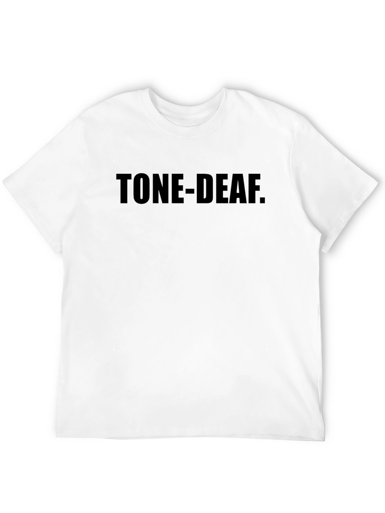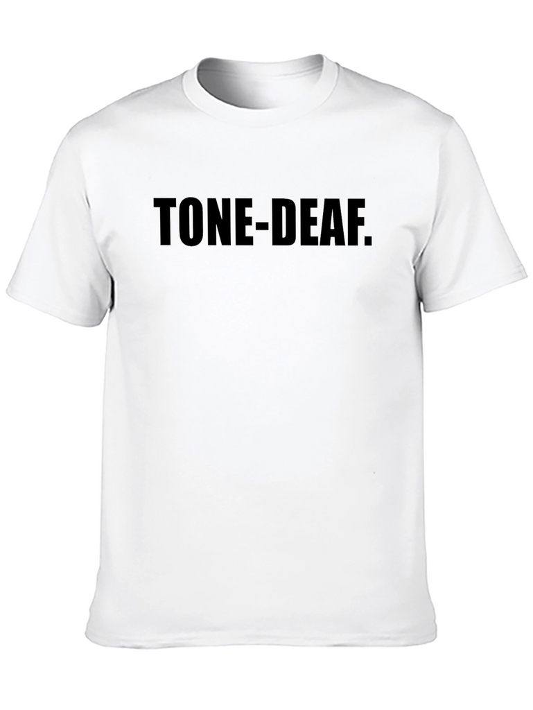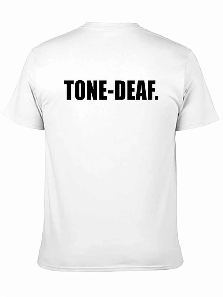Express your unique sense of humor with this bold 'Tone-Deaf' graphic tee. The shirt features a clean, classic design with the phrase prominently displayed across the chest in a strong, sans-serif font. Made from a comfortable, likely cotton blend fabric, this tee offers a relaxed fit perfect for everyday wear. Its solid black color ensures versatility, easily pairing with jeans, shorts, or casual trousers. Ideal for making a statement or sparking conversation, this t-shirt is a must-have addition to any wardrobe. Show off your personality with confidence and style.