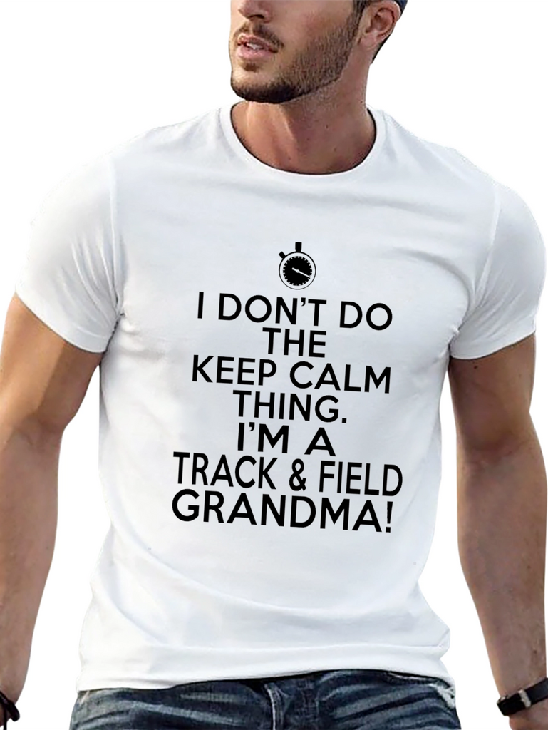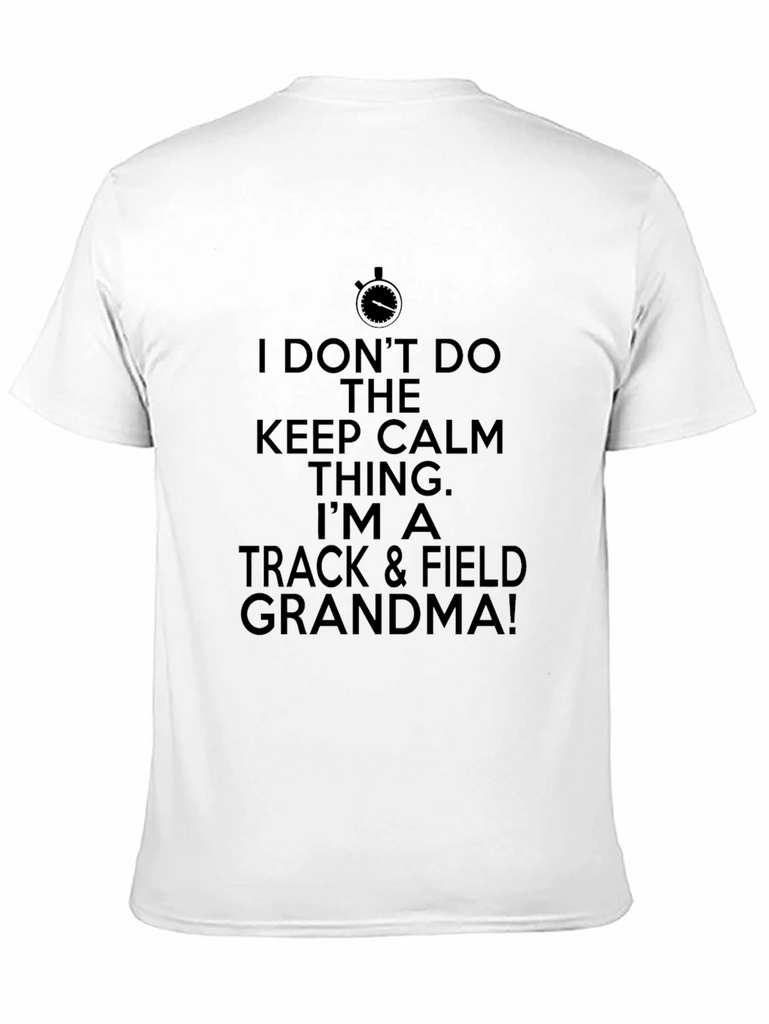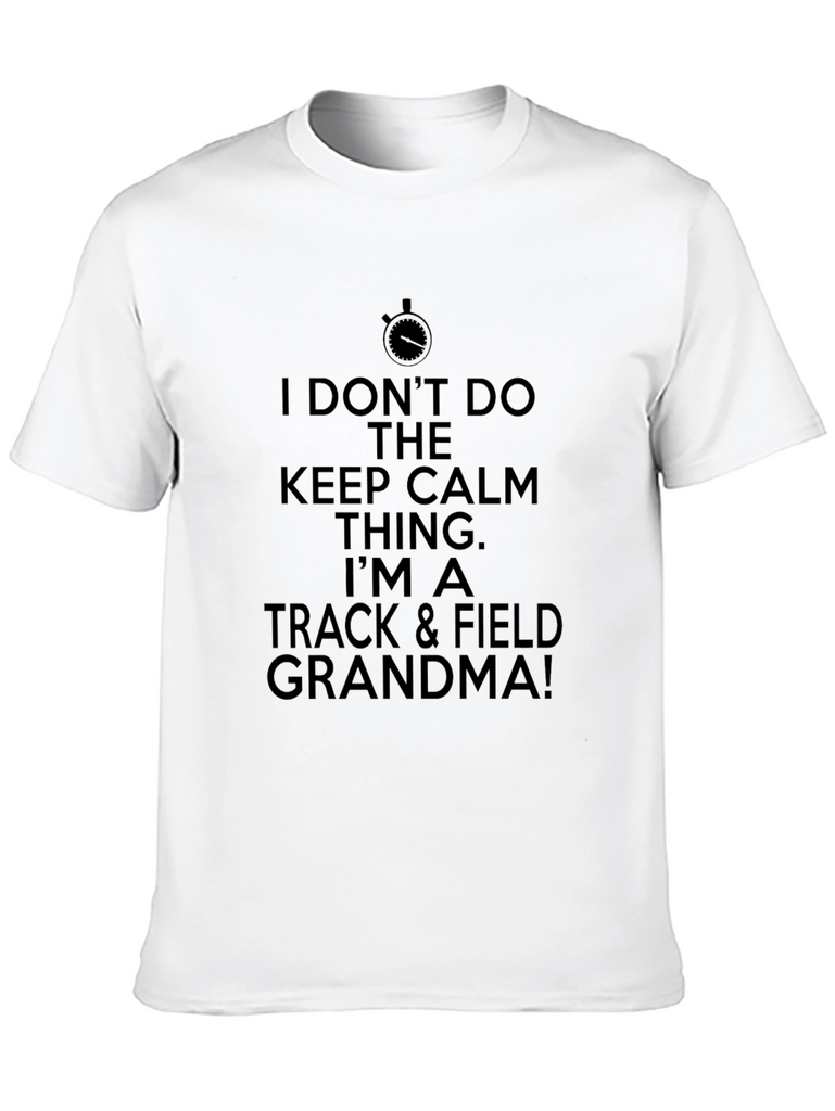 Show off your love for track and field with this unique graphic t-shirt! The shirt features bold text reading "I DON'T DO THE KEEP CALM THING. I'M A TRACK & FIELD GRANDMA!" along with a small stopwatch graphic. Made from a comfortable, breathable fabric, this tee is perfect for wearing to track meets, casual outings, or just lounging around the house. Its classic fit makes it ideal for both men and women. Makes a great gift for the proud track and field grandma in your life! Get yours today and showcase your passion!