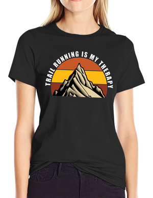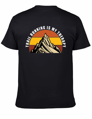 Show off your love for trail running with this stylish black t-shirt! Featuring a striking graphic design in shades of blue, the shirt displays the words "Trail Running" above a mountain and forest silhouette, evoking the spirit of outdoor adventure. The classic crew neck and short sleeves offer a comfortable and relaxed fit, making it ideal for everyday wear or your next outdoor excursion. Made from a soft, breathable fabric, this t-shirt is perfect for hitting the trails or simply showing off your passion for the sport. Get yours today and embrace the freedom of trail running!