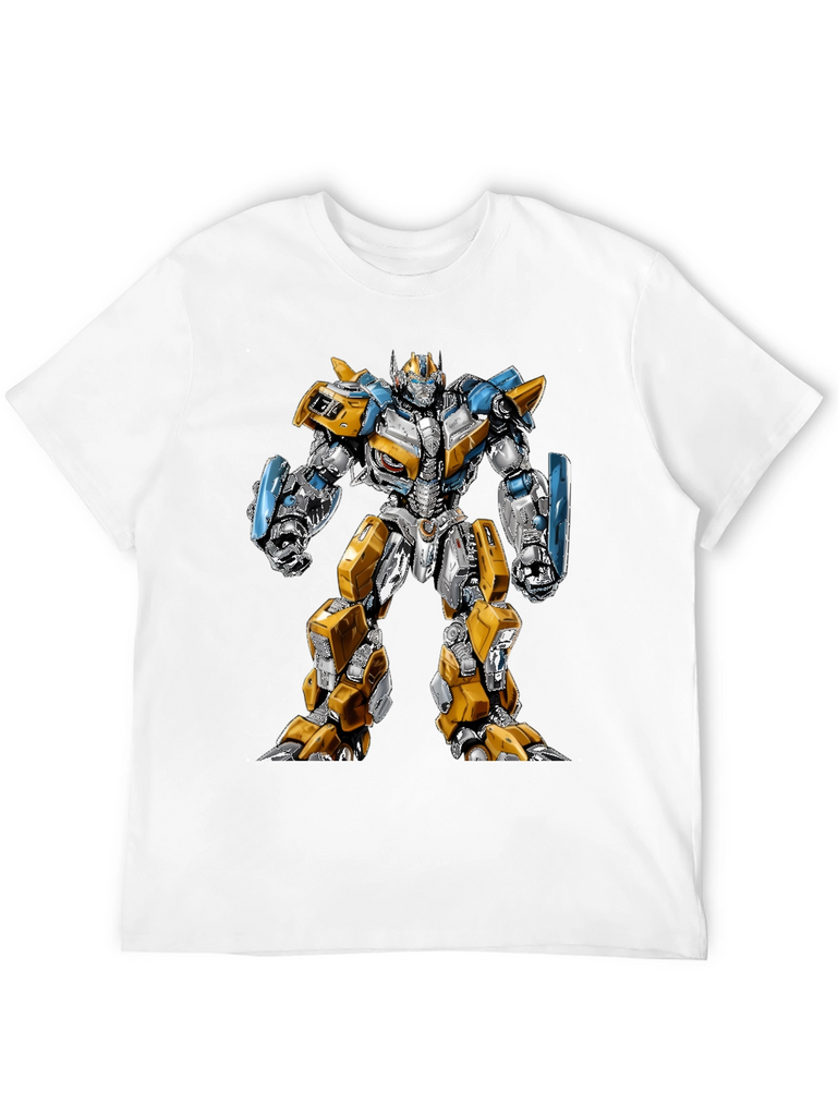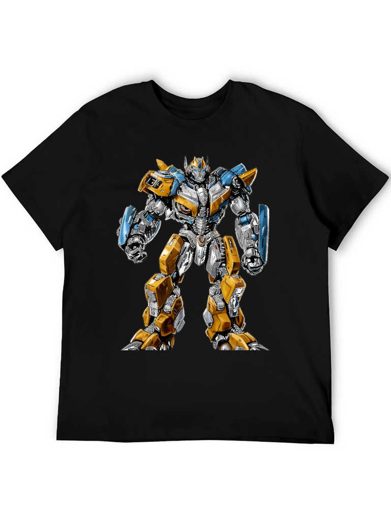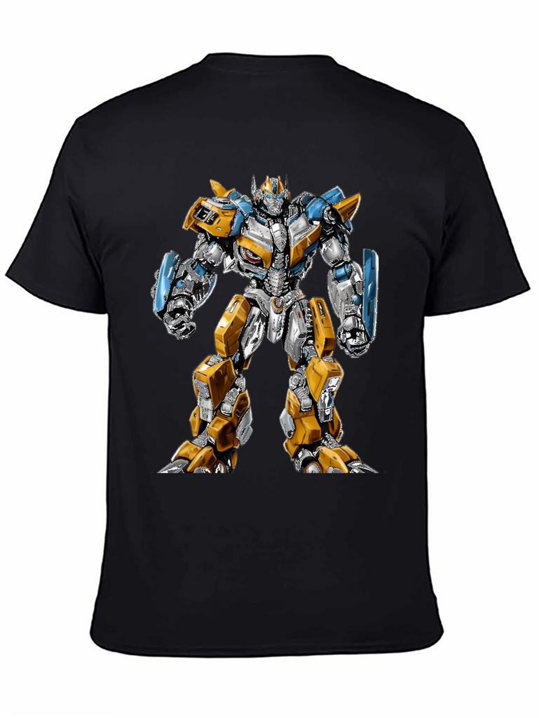 Show off your love for the Transformers franchise with this eye-catching black t-shirt. Featuring a bold and detailed graphic of Bumblebee, this tee is sure to turn heads. The design showcases Bumblebee in full robot form, with striking yellow, silver, and blue accents, giving it a modern and dynamic look. Made from a comfortable, breathable fabric, this shirt is perfect for everyday wear, comic conventions, or casual outings. The vibrant print stands out against the classic black backdrop, making it a versatile addition to any wardrobe. Whether you're a die-hard Transformers fan or simply appreciate unique designs, this t-shirt is a must-have. Grab yours and let everyone know you're ready to roll out!
