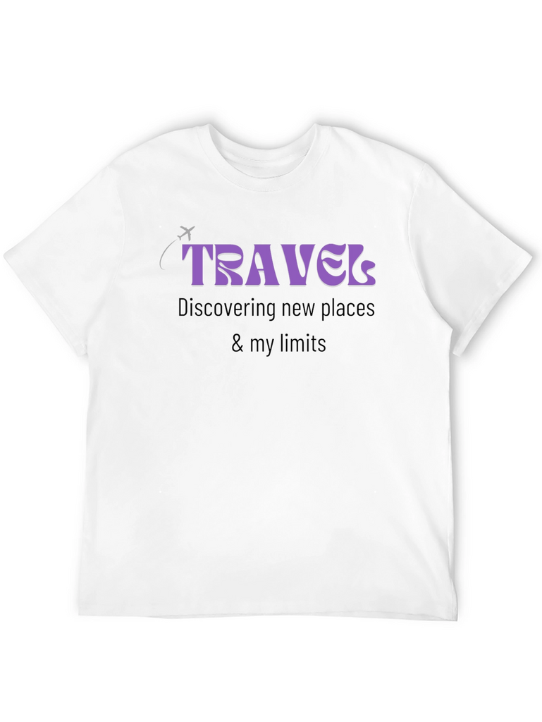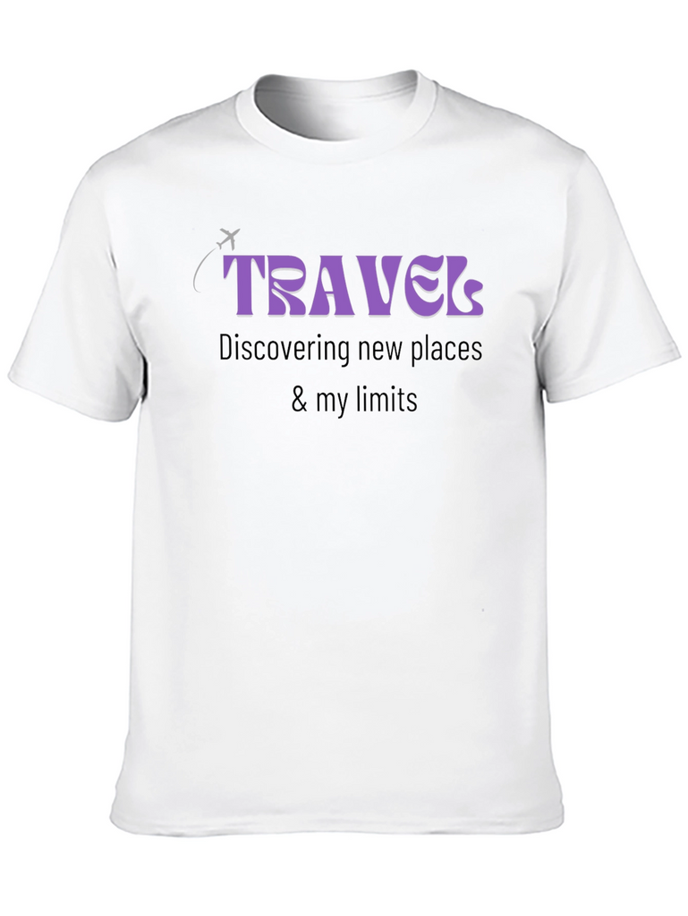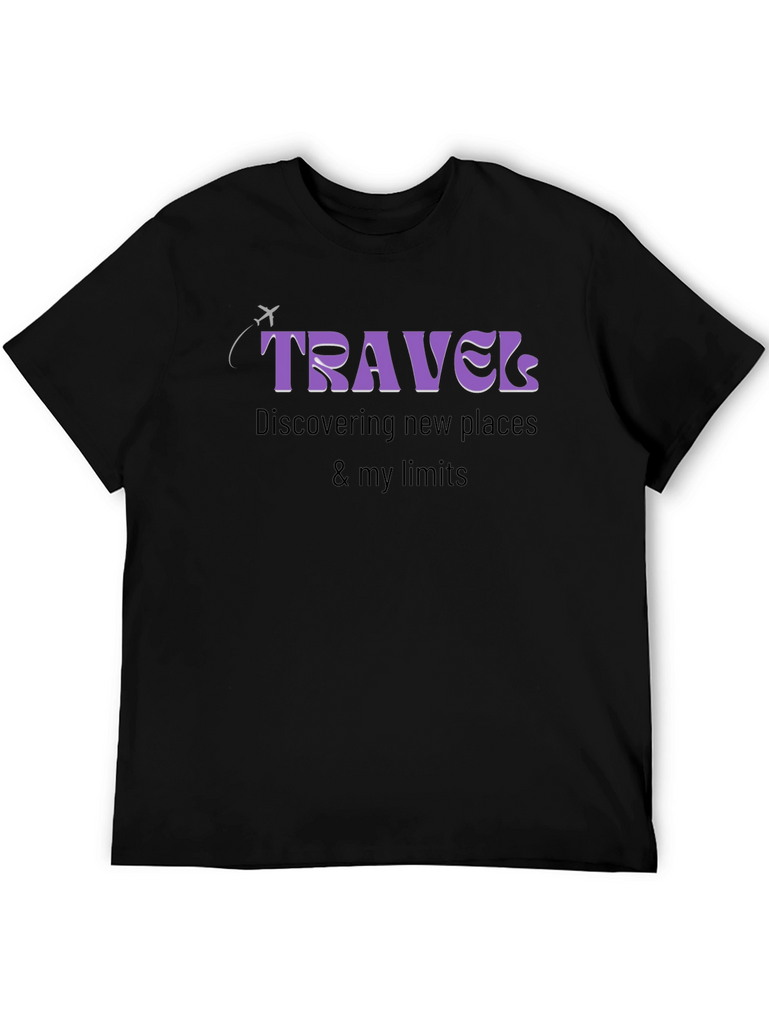 Embark on your next adventure with this stylish black travel t-shirt. The shirt features the word "TRAVEL" in a bold purple font, accompanied by a subtle airplane graphic, creating a wanderlust-inspired aesthetic. Below the main design, you'll find the phrase "Discovering new places & my limits", subtly printed on the front, adding a personal touch to this wearable piece of art. Crafted from a comfortable material, this t-shirt is perfect for everyday wear, exploring new cities, or simply expressing your passion for travel. Make a statement without saying a word, and let this t-shirt be a conversation starter for your next journey. Ideal for travel enthusiasts and adventurers at heart.