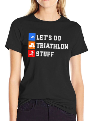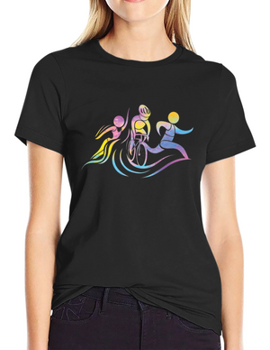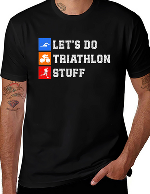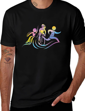 This black graphic t-shirt features a vibrant design perfect for triathletes. The central image showcases silhouettes of a swimmer, cyclist, and runner against a retro sunset backdrop. Bold red text proclaims 'TRIATHLETES' above, while the phrase 'DON'T GET OLD. THEY JUST CHANGE THEIR AGE GROUP' adds a humorous touch. Crafted from a comfortable-looking fabric, this tee is ideal for casual wear, workouts, or showing off your passion for triathlon. It's a great conversation starter and a fun gift for athletes who embrace aging with a sense of humor.
