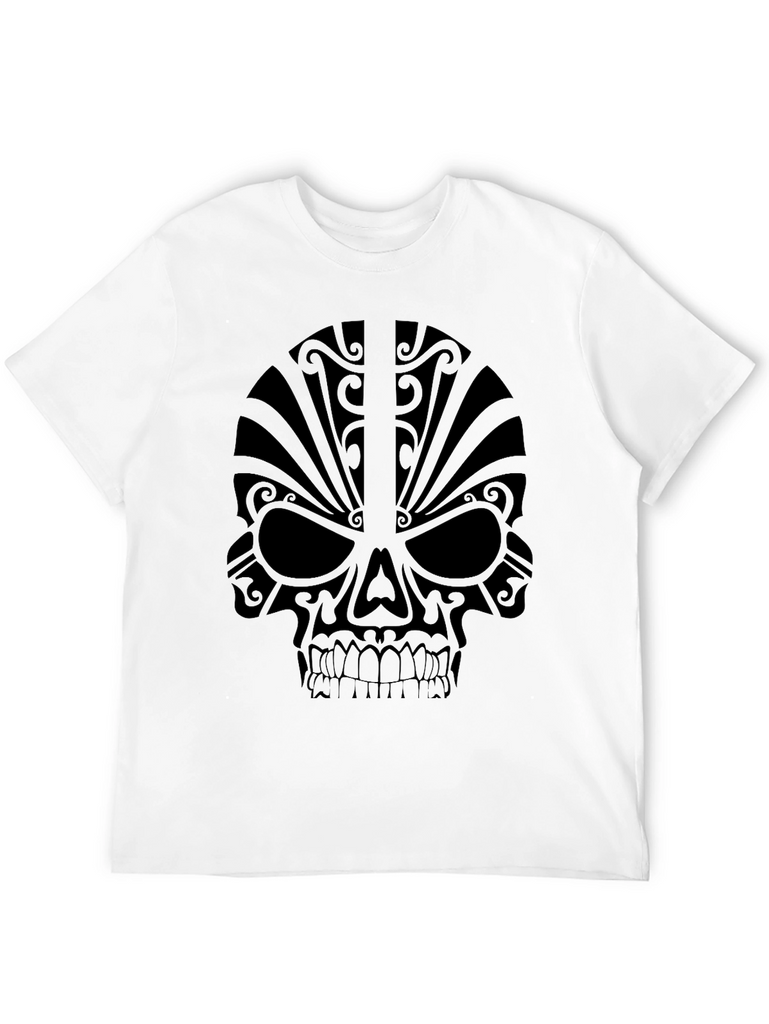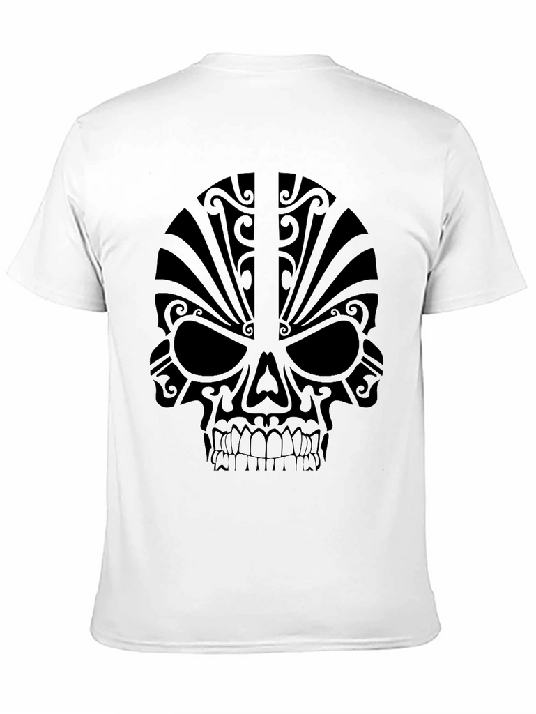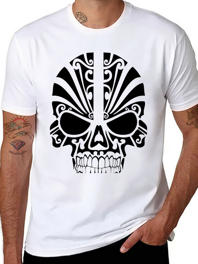 Make a bold statement with this striking black t-shirt featuring a tribal skull graphic. The design is printed in a matching black tone, creating a subtle yet eye-catching effect. Crafted from what appears to be a soft, comfortable cotton blend, this tee is perfect for everyday wear. The detailed skull design incorporates tribal-inspired elements, adding a touch of edgy style to your wardrobe. Whether you're going for a casual look or want to add some personality to your outfit, this unique t-shirt is a perfect choice. Pair it with jeans, shorts, or layer it under a jacket for a versatile style. This skull tee is great for those who love tattoo-inspired designs and modern graphics.