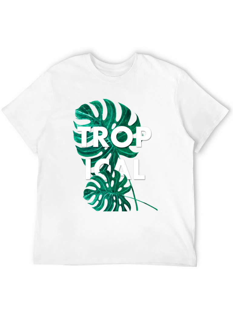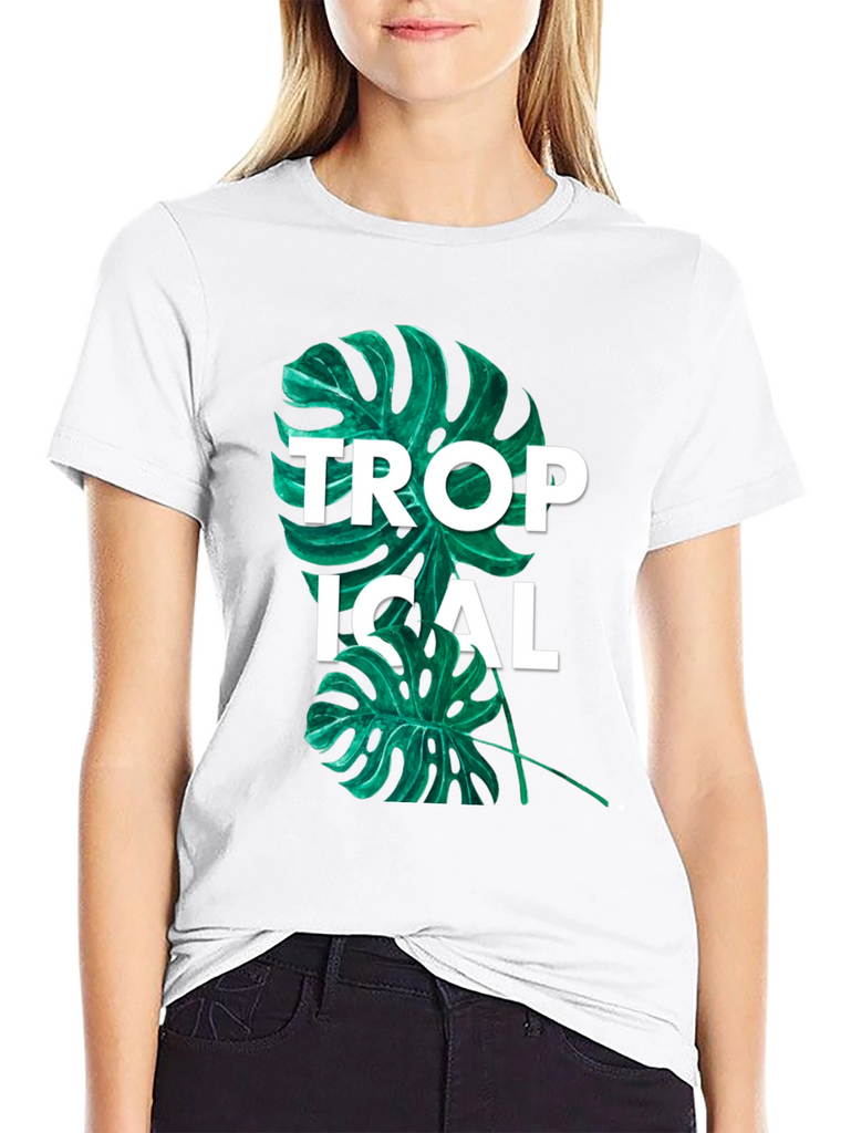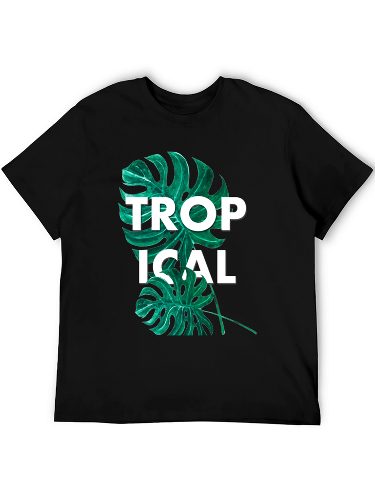 This stylish black t-shirt features a vibrant "TROPICAL" graphic design with lush green leaves. The design is eye-catching and perfect for adding a touch of nature-inspired flair to your wardrobe. Made from a comfortable-looking fabric, this tee is ideal for casual wear, whether you're lounging at home or out and about. The classic crew neck and short sleeves offer a relaxed fit. Pair it with jeans, shorts, or even dress it up with a blazer for a versatile look. This t-shirt is a must-have for anyone who loves tropical vibes and wants to make a fashion statement.
