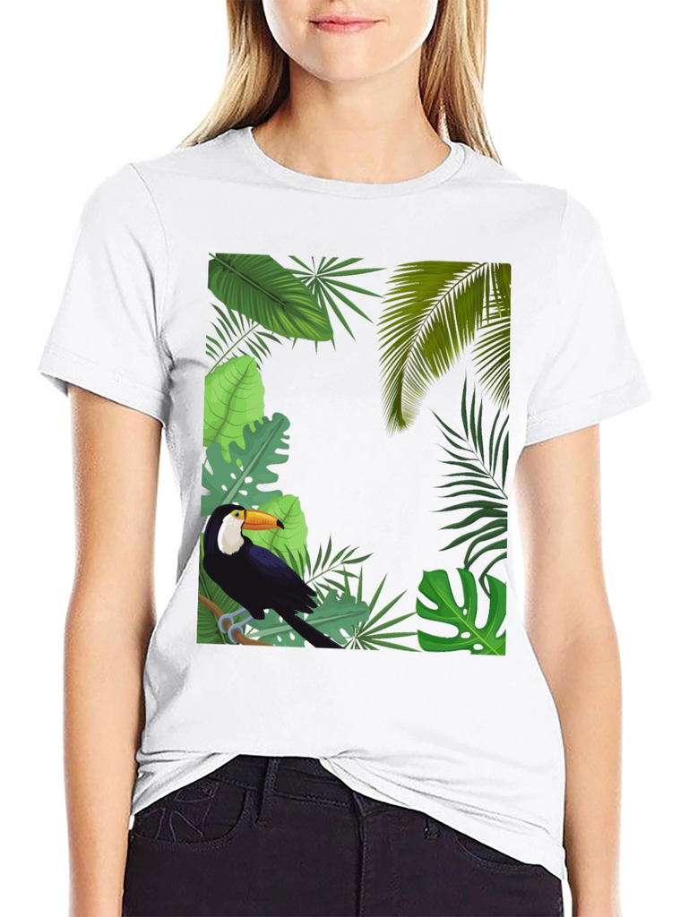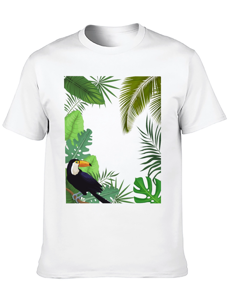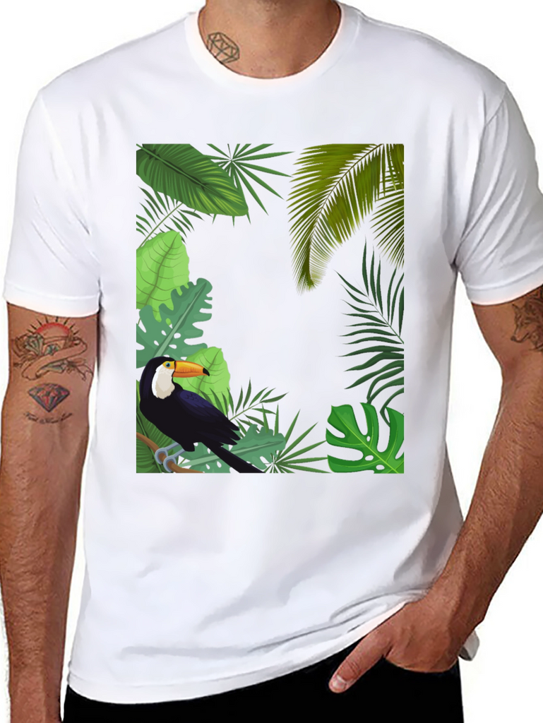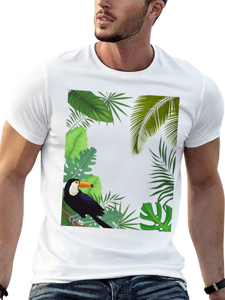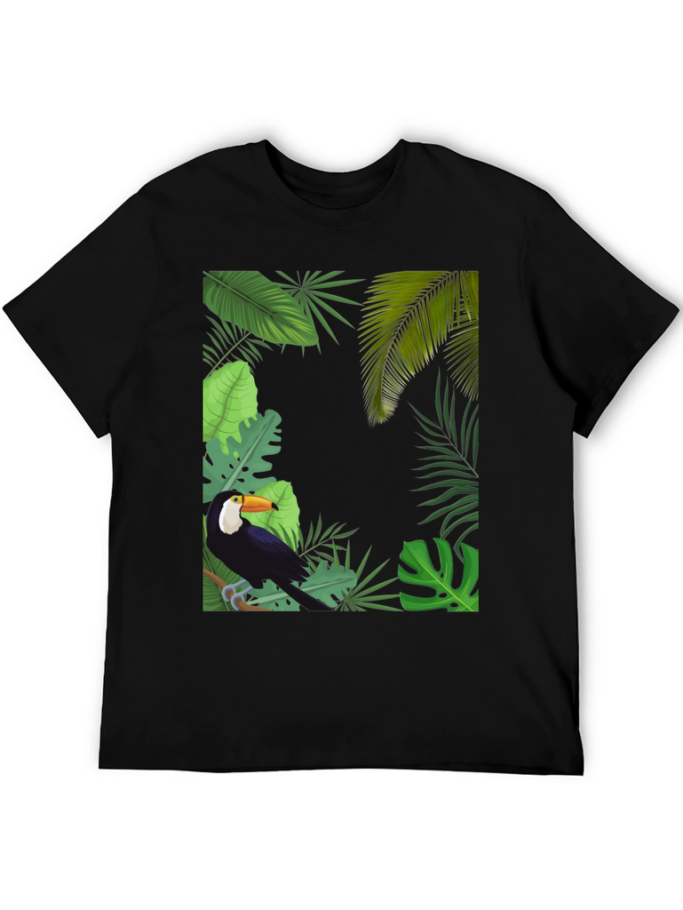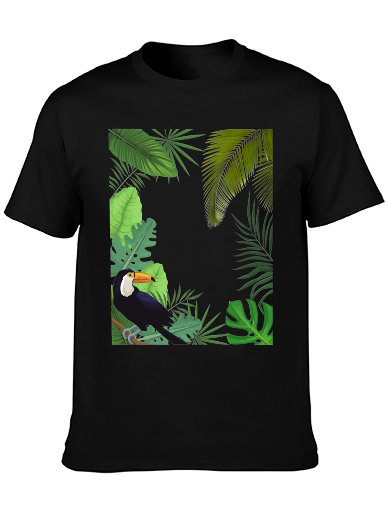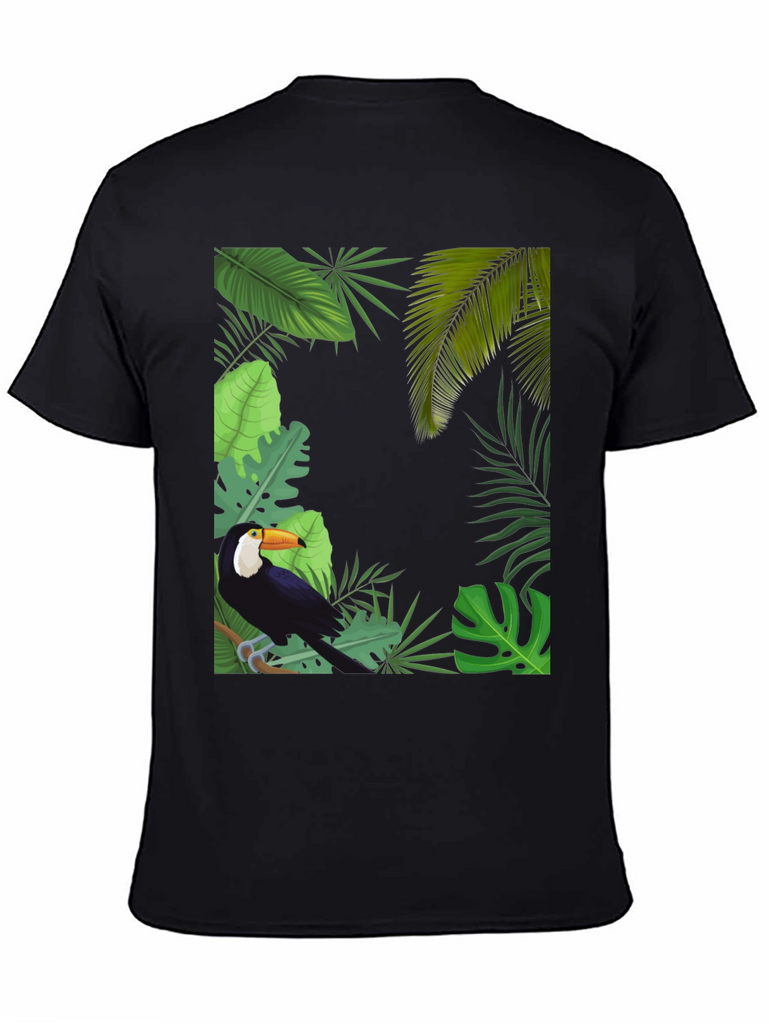 Embrace tropical vibes with this stylish black t-shirt. It features a vibrant graphic of a toucan perched amidst lush tropical foliage. The detailed design includes various green leaves, creating a captivating jungle scene. Made from a soft and breathable fabric, this tee offers superior comfort and is perfect for everyday wear. Showcase your love for nature and stand out in style. Ideal for casual outings, vacations, or adding a touch of the tropics to your wardrobe. Upgrade your look with this unique toucan tee today!