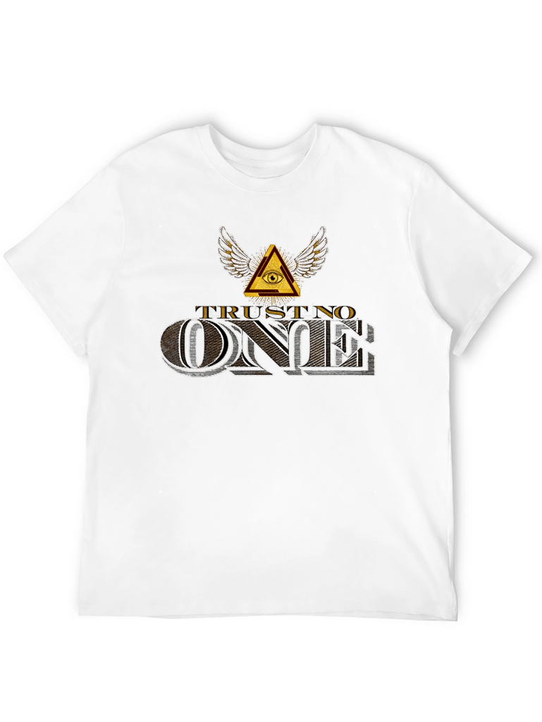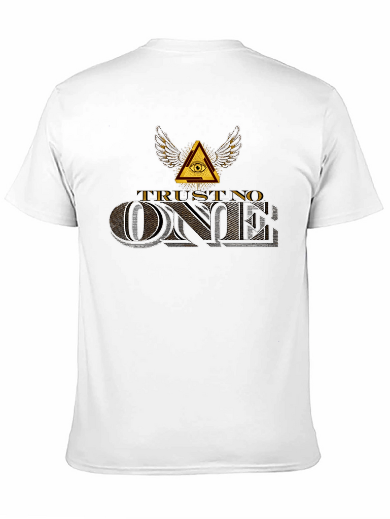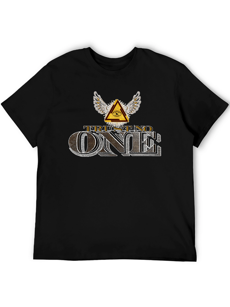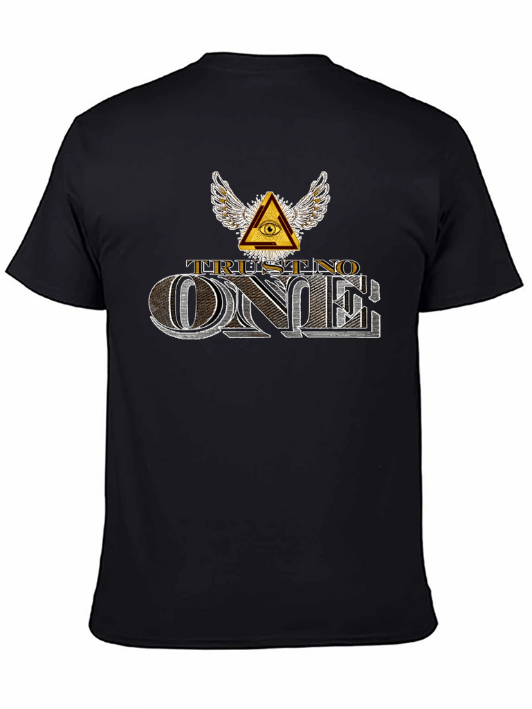 Embrace a bold statement with this black 'Trust No One' graphic t-shirt. Featuring a striking Illuminati-inspired design with a winged eye pyramid above the phrase 'TRUST NO ONE,' this tee exudes an edgy, mysterious vibe. The text is rendered in a stylized, dimensional font, giving it a vintage yet modern feel. Crafted from comfortable fabric, this short-sleeve shirt is perfect for casual wear, concerts, or making a statement. Pair it with jeans or shorts for an effortlessly cool look. A must-have for those who appreciate unique and thought-provoking designs.
