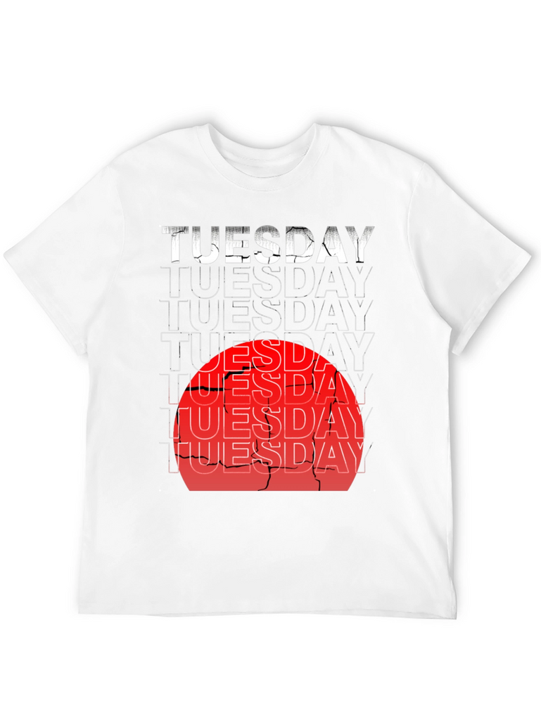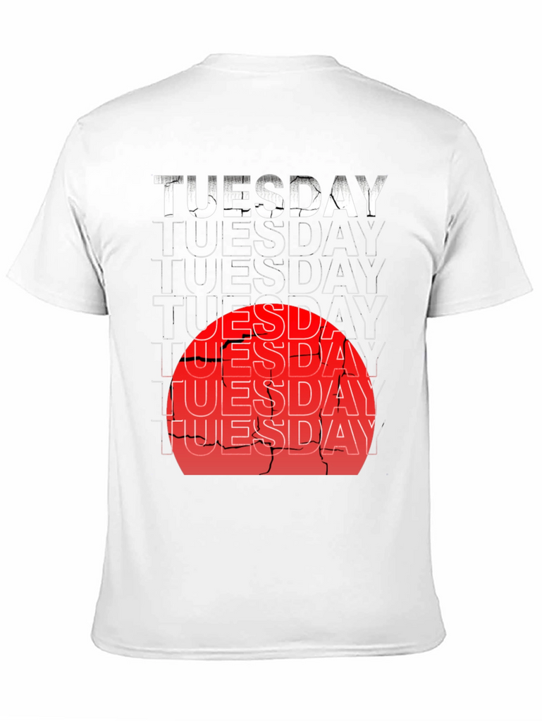 Rock this black tee featuring a stacked 'TUESDAY' graphic with a distressed, urban vibe. The bold white text at the top fades into outlines, overlaid with a red sun design for an eye-catching effect. Made from comfortable, breathable fabric, this shirt is perfect for casual wear, concerts, or hitting the streets in style. Show off your unique style with this edgy and expressive tee. Make a statement, whatever the day of the week! Grab yours today and make every Tuesday unforgettable.