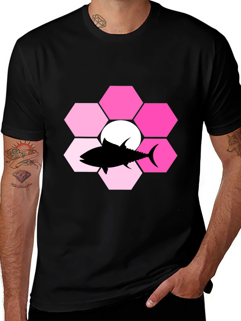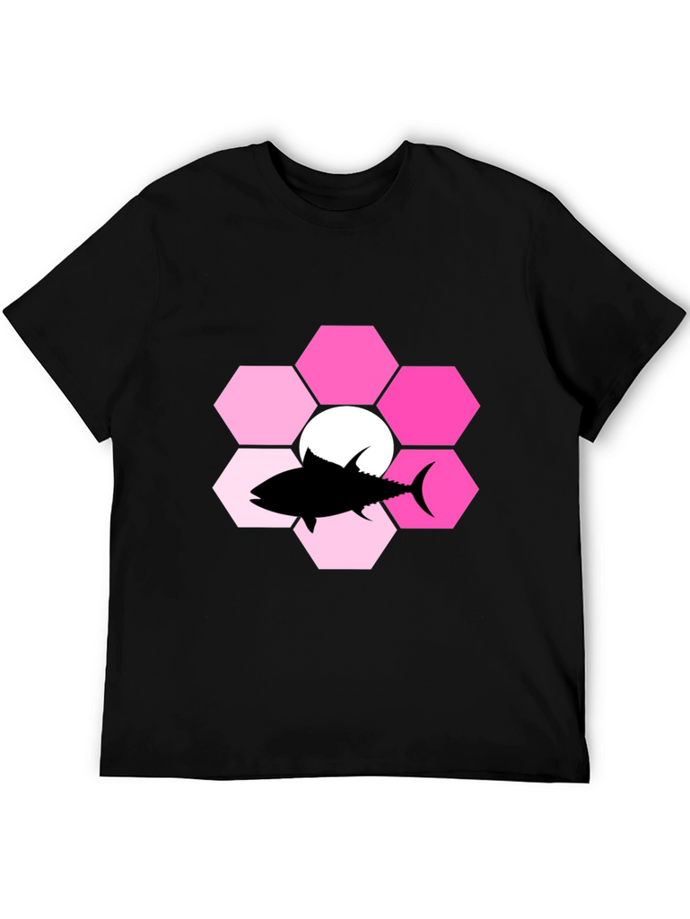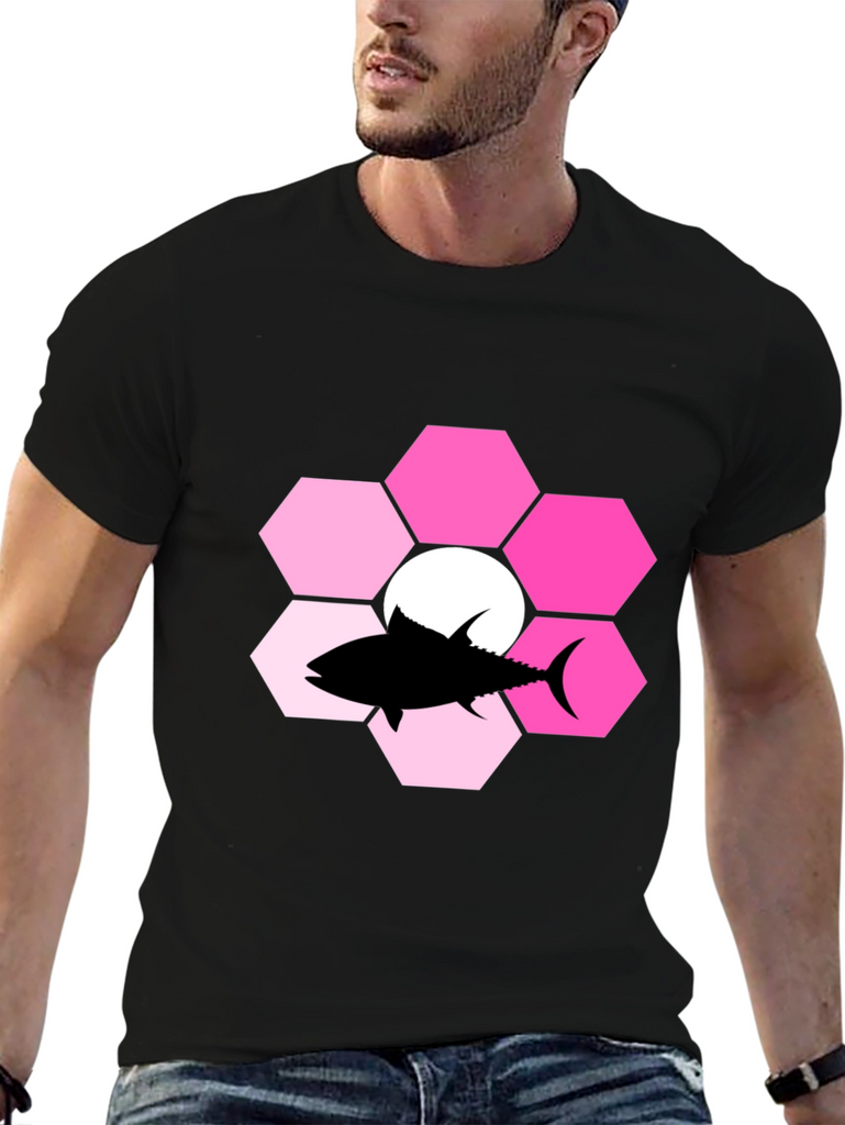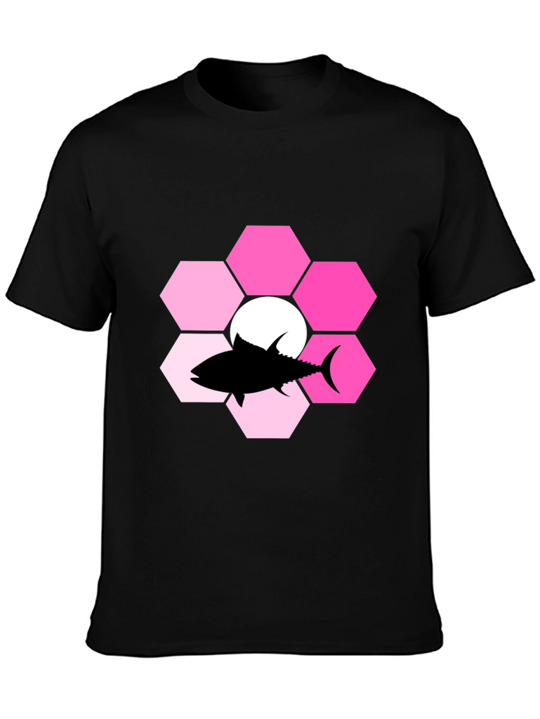 This eye-catching black t-shirt features a unique design of a tuna silhouette overlaid on a hexagon flower pattern. The flower petals are colored in shades of pink, surrounding a white circle that creates a modern and stylish aesthetic. Crafted from comfortable, breathable fabric, this tee is perfect for casual wear. The bold graphic makes it a standout piece, ideal for expressing individuality. Wear it on a day out or as a statement piece at your next social gathering. This unique tee combines art and comfort, making it a must-have for any wardrobe. This t-shirt would make a great gift for anyone who enjoys fishing or just likes a unique t-shirt.