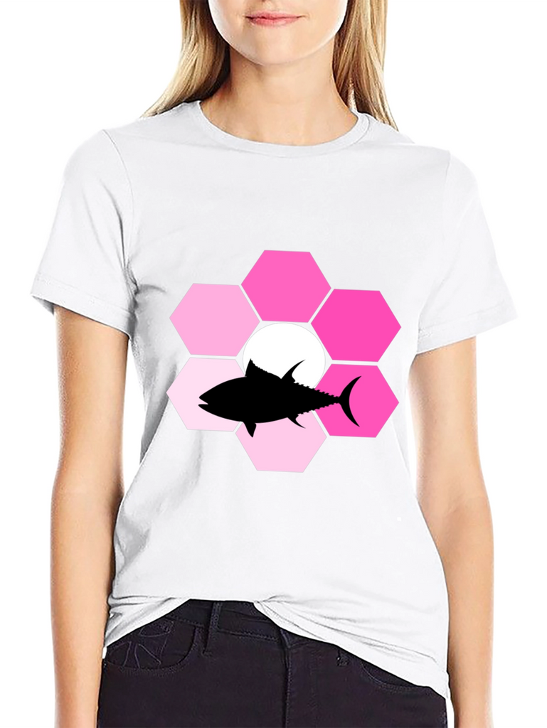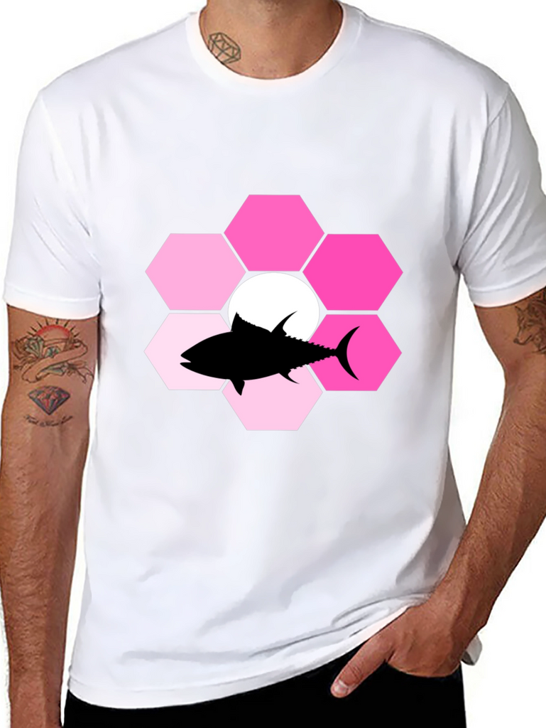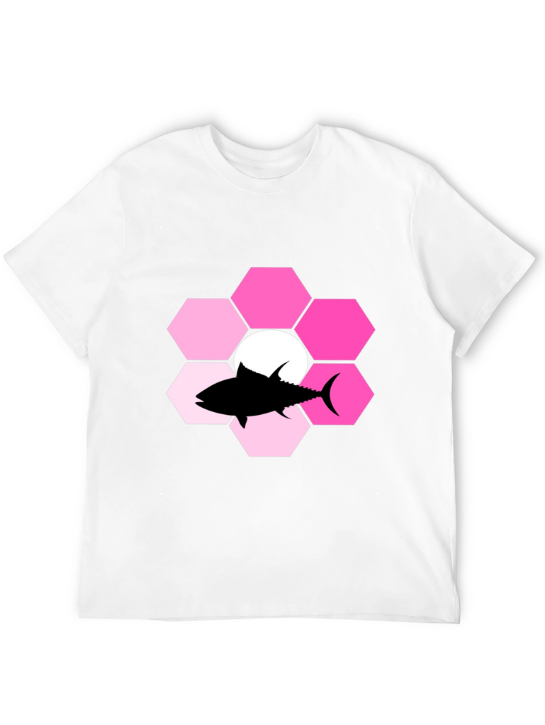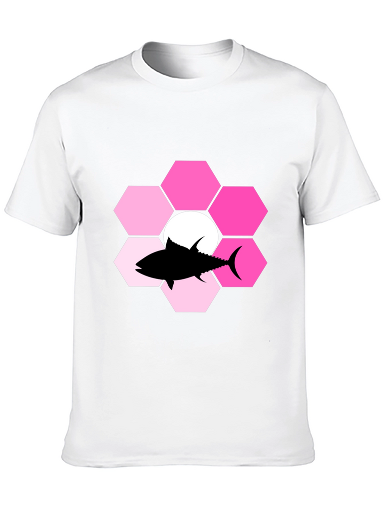 This eye-catching black t-shirt features a unique design of a tuna silhouette overlaid on a hexagon flower pattern. The flower petals are colored in shades of pink, surrounding a white circle that creates a modern and stylish aesthetic. Crafted from comfortable, breathable fabric, this tee is perfect for casual wear. The bold graphic makes it a standout piece, ideal for expressing individuality. Wear it on a day out or as a statement piece at your next social gathering. This unique tee combines art and comfort, making it a must-have for any wardrobe. This t-shirt would make a great gift for anyone who enjoys fishing or just likes a unique t-shirt.