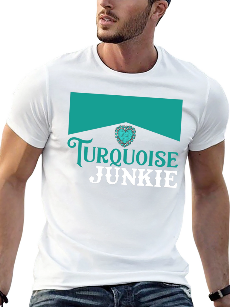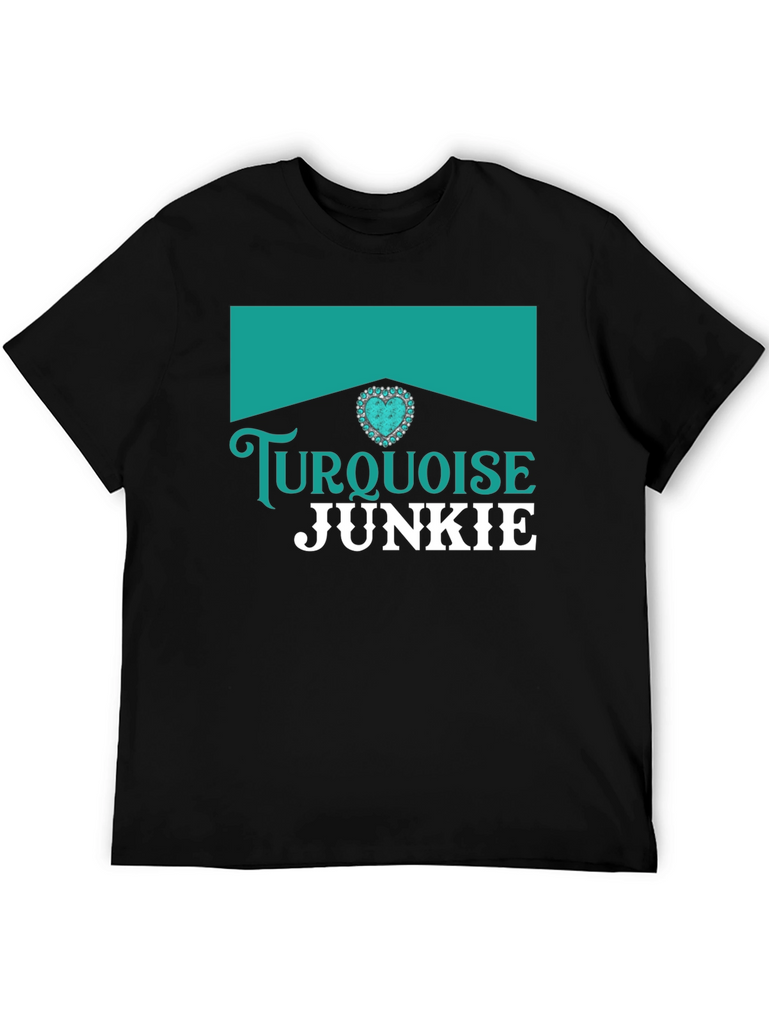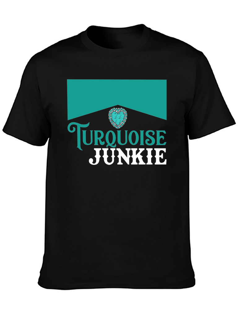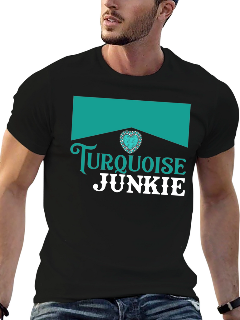 Show your love for turquoise with this eye-catching t-shirt. The design features the words "Turquoise Junkie" in a stylized font with a turquoise-colored background and a sparkling heart accent. Made from comfortable and breathable black material, this tee is perfect for everyday wear. Its unique design makes it a great conversation starter and a perfect gift for turquoise enthusiasts. Wear it casually with jeans, or dress it up with a jacket, the possibilities are endless. This tee is a must-have addition to any turquoise lover's wardrobe.