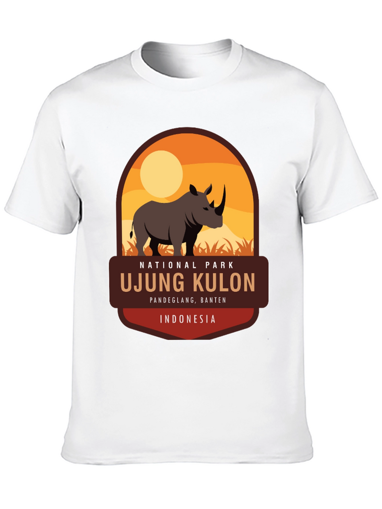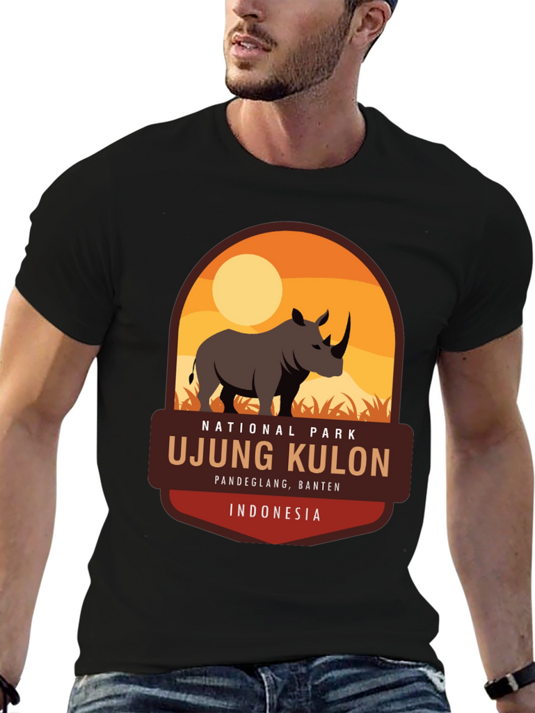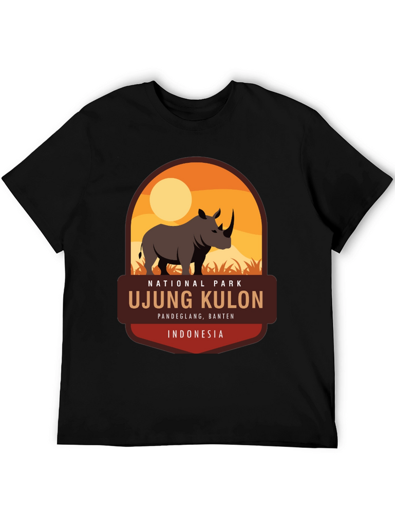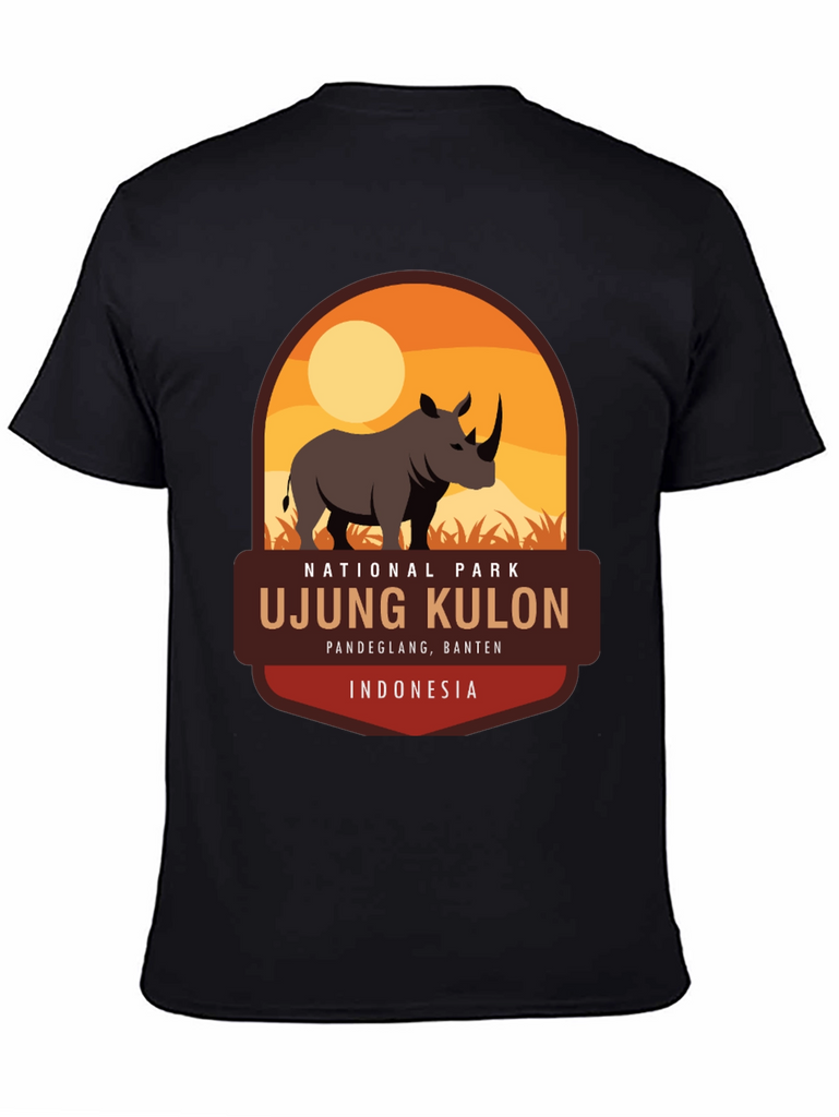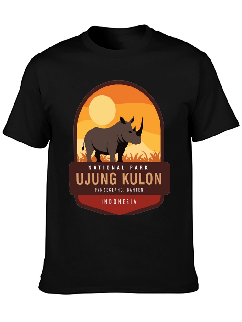Show your love for wildlife and Indonesian national parks with this stylish black graphic tee. The shirt features a striking design of a rhinoceros against a sunset backdrop, encapsulated in a vintage-style badge. Above the rhino, "NATIONAL PARK" is printed, with "UJUNG KULON" in a bolder font underneath. Further down, you will see "PANDEGLANG, BANTEN" and "INDONESIA". Made from comfortable, breathable fabric, this t-shirt is perfect for casual wear, outdoor adventures, or as a souvenir to remember your trip to Ujung Kulon. A unique and eye-catching addition to any wardrobe.