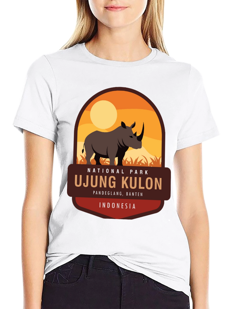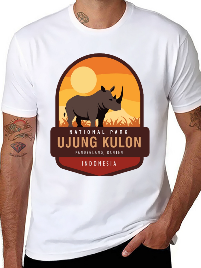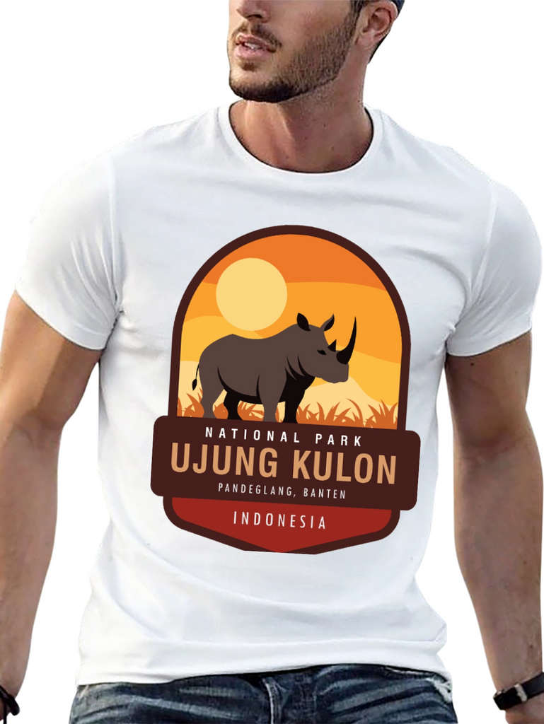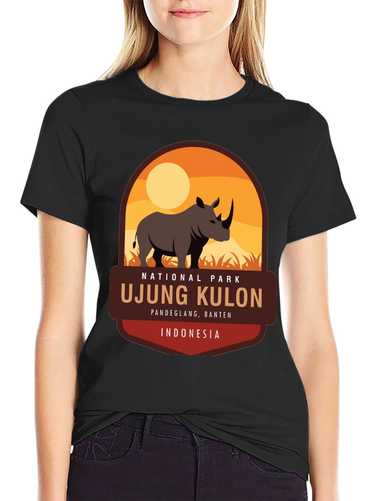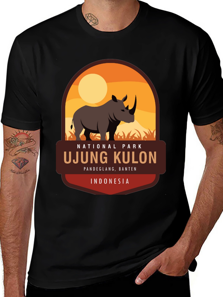 Show your love for wildlife and Indonesian national parks with this stylish black graphic tee. The shirt features a striking design of a rhinoceros against a sunset backdrop, encapsulated in a vintage-style badge. Above the rhino, "NATIONAL PARK" is printed, with "UJUNG KULON" in a bolder font underneath. Further down, you will see "PANDEGLANG, BANTEN" and "INDONESIA". Made from comfortable, breathable fabric, this t-shirt is perfect for casual wear, outdoor adventures, or as a souvenir to remember your trip to Ujung Kulon. A unique and eye-catching addition to any wardrobe.