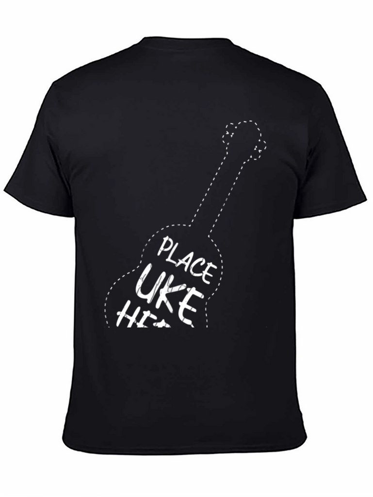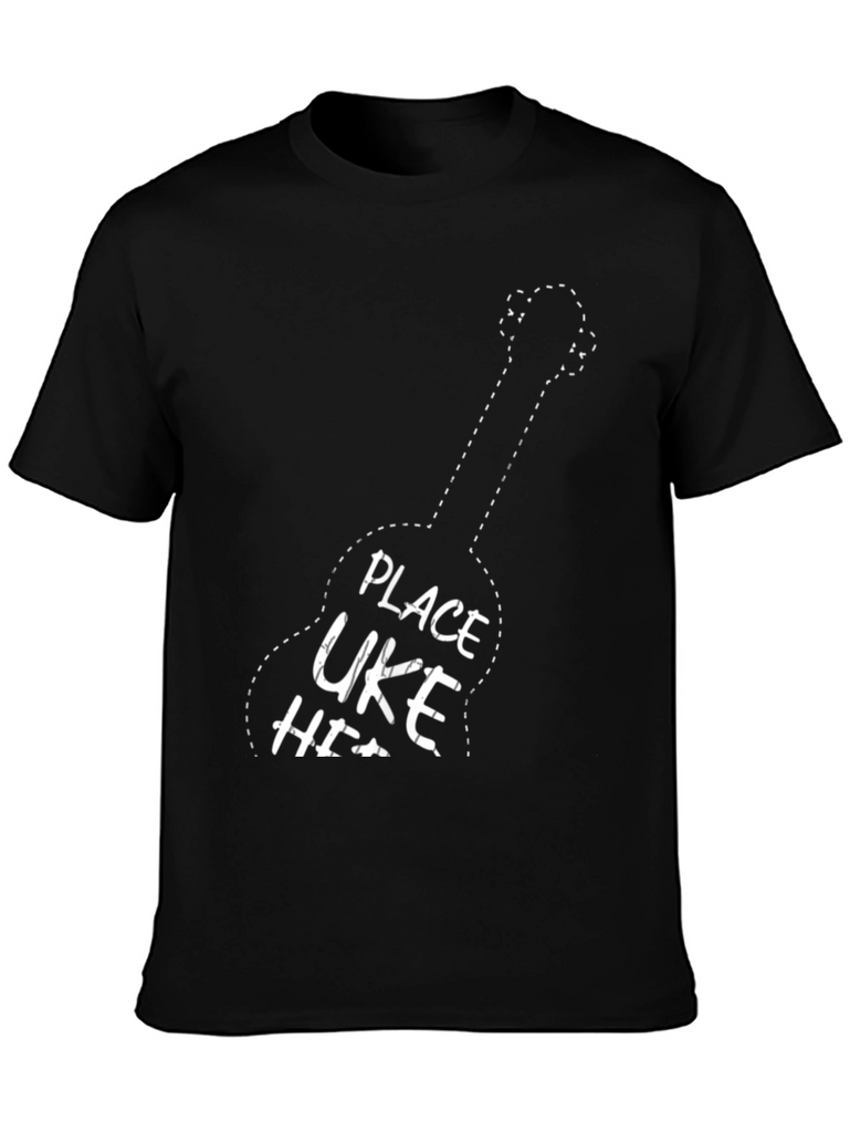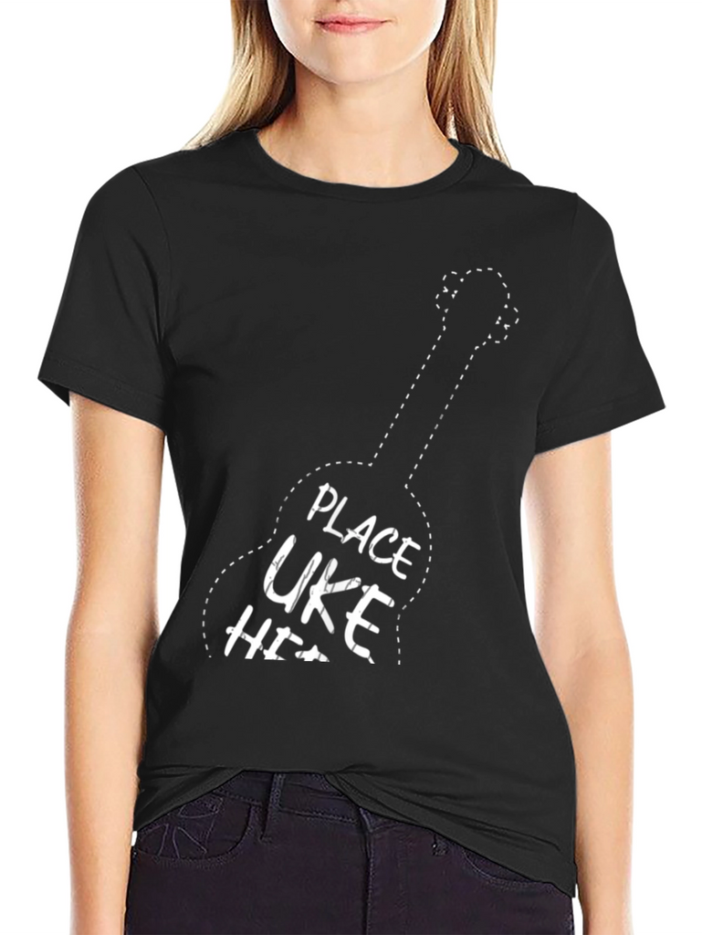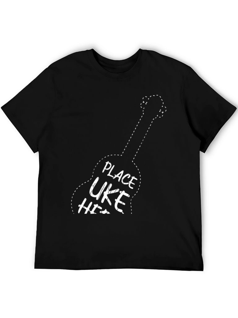 Show off your love for ukulele music with this unique graphic t-shirt. This black tee features a creative ukulele-shaped outline on the front, with the text "PLACE UKE HERE" inside, adding a playful touch. Perfect for musicians, music lovers, or anyone who enjoys a fun and quirky design. Made from comfortable materials, this shirt is ideal for casual wear, concerts, jam sessions, or simply expressing your passion for music. Get yours today and let the world know where your heart lies - with the ukulele!