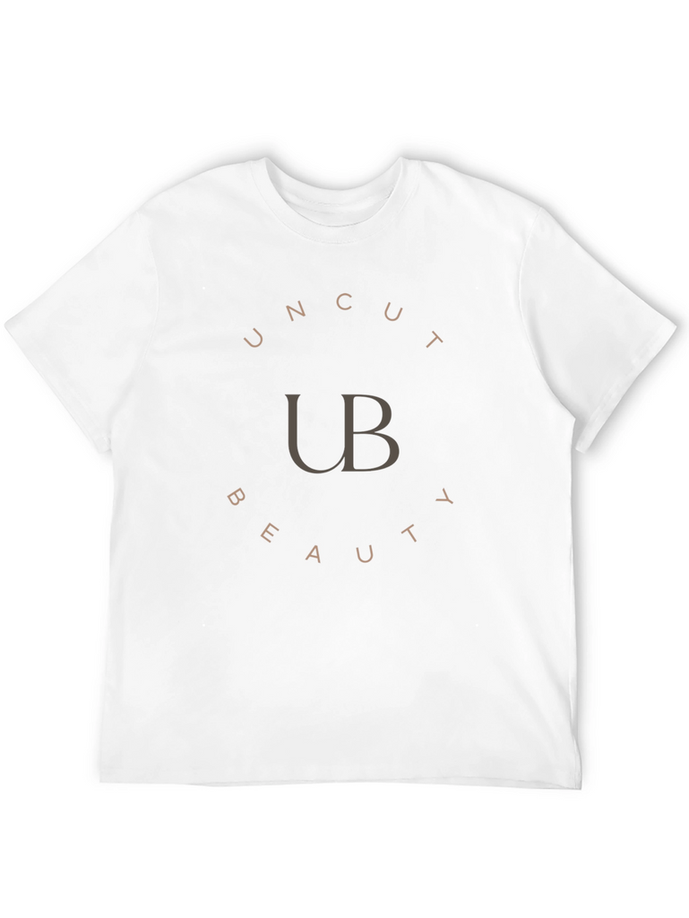 This stylish black t-shirt features a unique "Uncut Beauty" logo design with the letters "UB" prominently displayed. The circular layout of the brand name adds a modern touch. Made from a soft-looking fabric, this tee offers both comfort and style. Its classic fit makes it versatile for everyday wear, perfect for casual outings, lounging at home, or layering under a jacket. Show off your unique style with this must-have wardrobe staple.