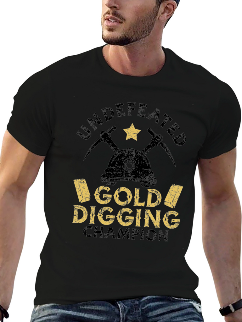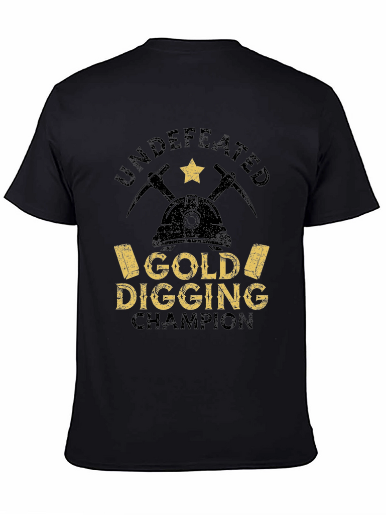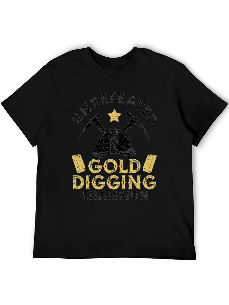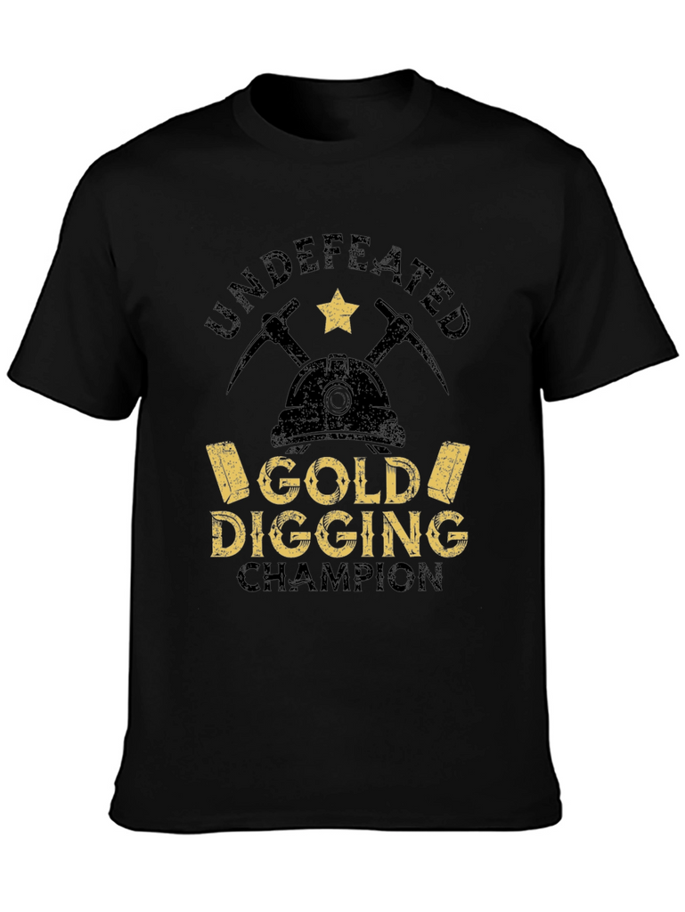 Show off your winning spirit with this striking black t-shirt! Featuring a bold "Undefeated Gold Digging Champion" graphic, complete with crossed pickaxes, a miner's helmet, and gold bar accents, this shirt is perfect for those who love a bit of fun. The design has a cool distressed look, adding to its vintage appeal. Made from comfortable, breathable fabric, this tee is ideal for casual wear, mining enthusiasts, or anyone who enjoys making a statement. Gear up and let everyone know you're a champion with this unique and eye-catching t-shirt!