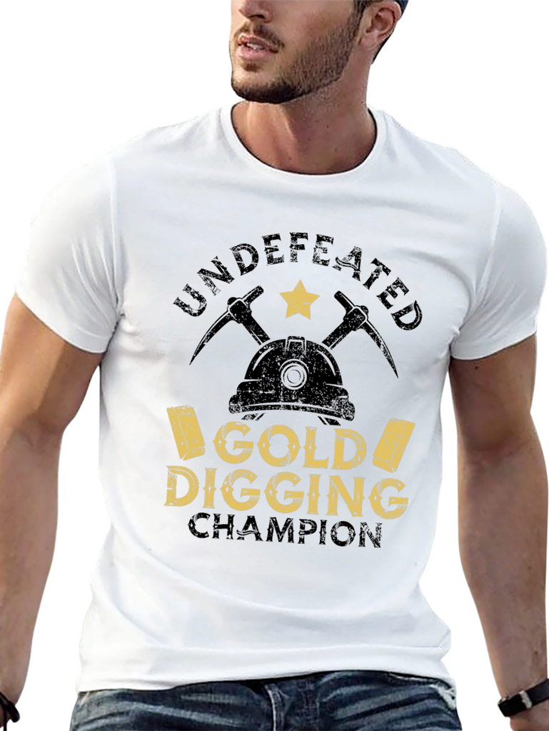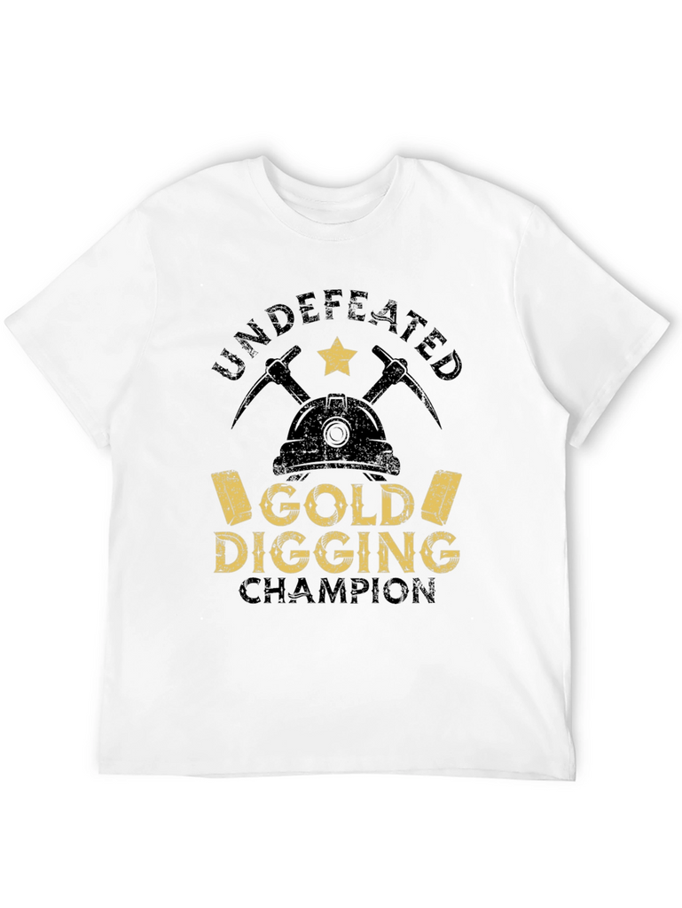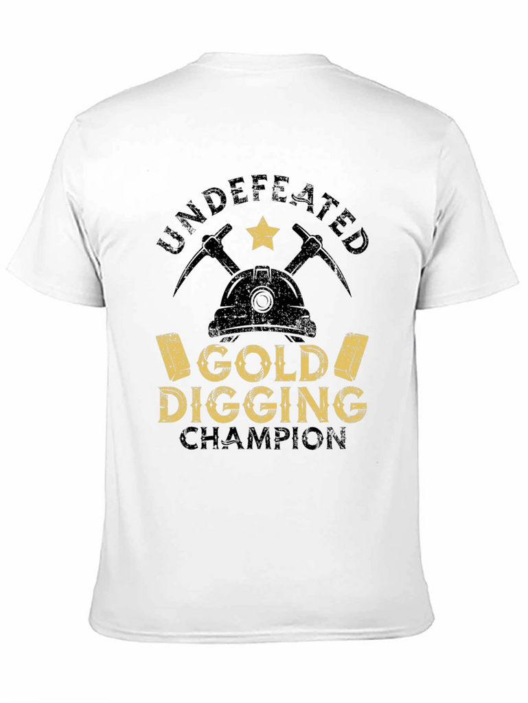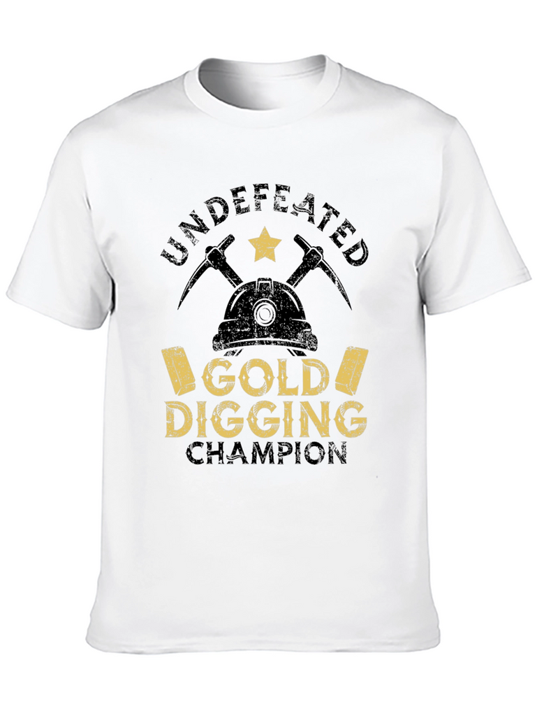 Show off your winning spirit with this striking black t-shirt! Featuring a bold "Undefeated Gold Digging Champion" graphic, complete with crossed pickaxes, a miner's helmet, and gold bar accents, this shirt is perfect for those who love a bit of fun. The design has a cool distressed look, adding to its vintage appeal. Made from comfortable, breathable fabric, this tee is ideal for casual wear, mining enthusiasts, or anyone who enjoys making a statement. Gear up and let everyone know you're a champion with this unique and eye-catching t-shirt!