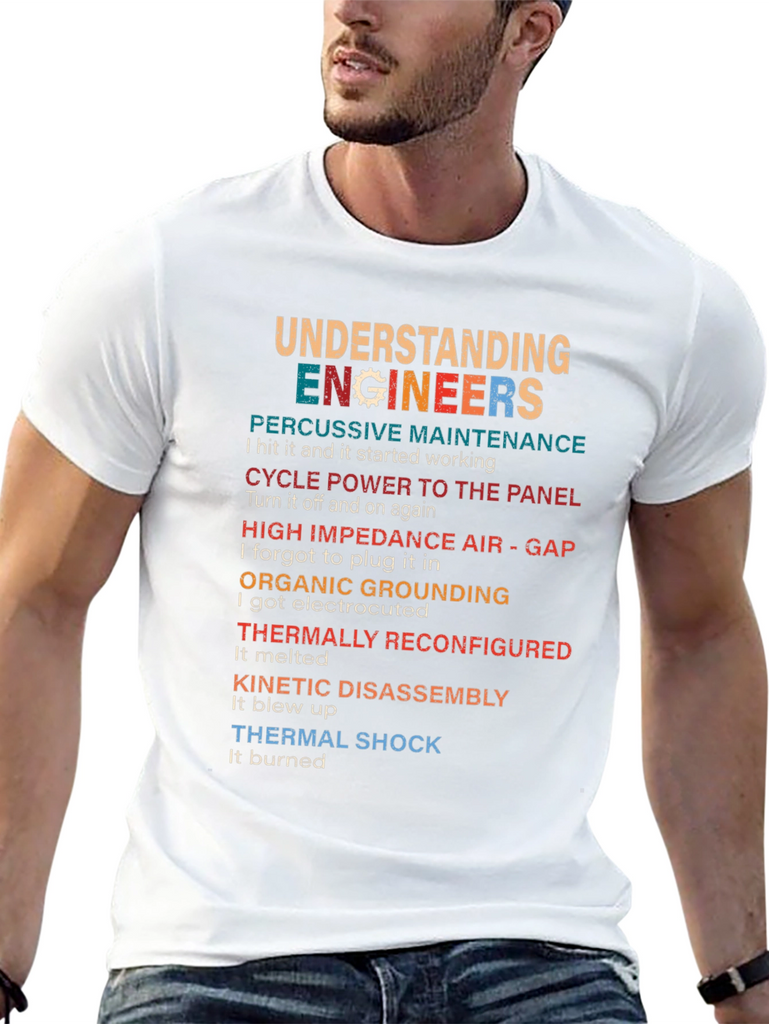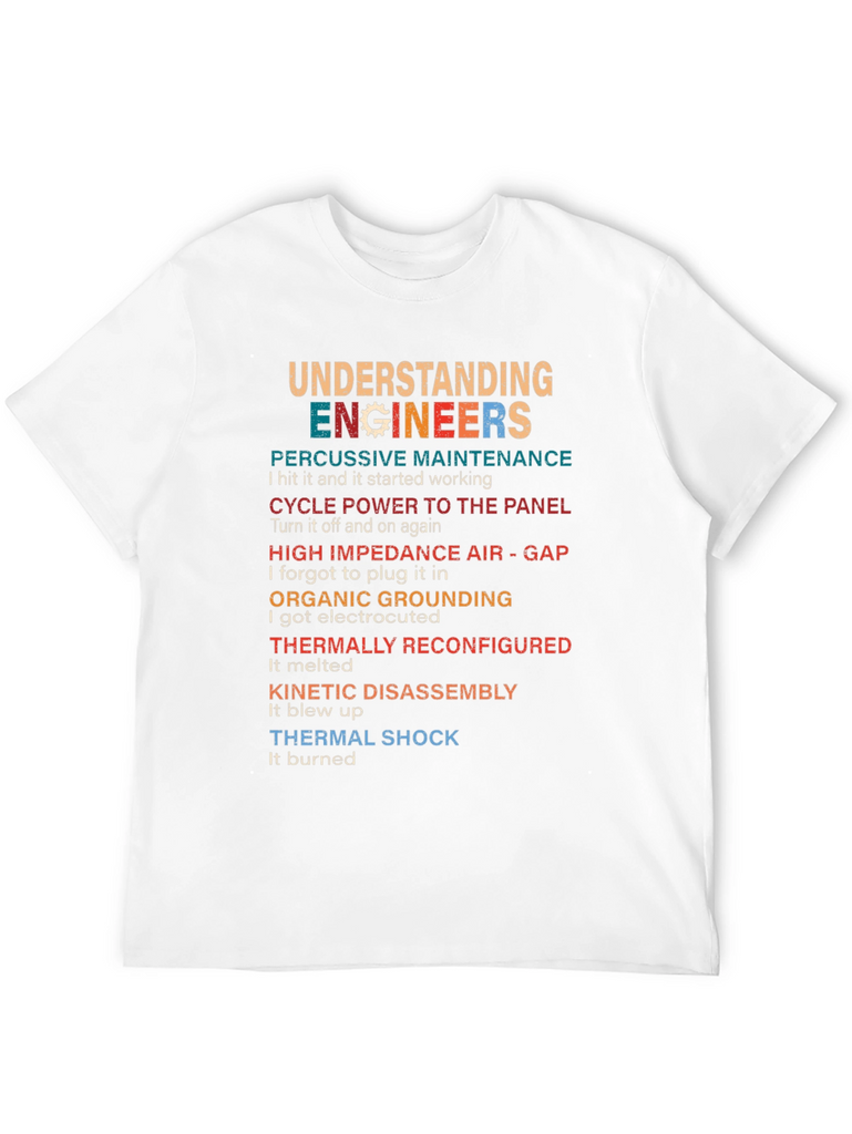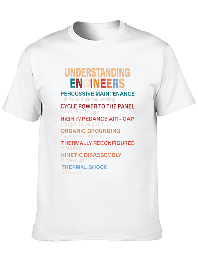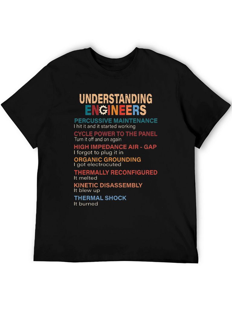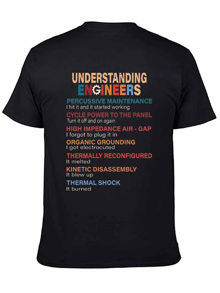 This black t-shirt features a humorous take on engineering solutions. The design showcases a list of unconventional methods with comical descriptions. Made from a comfortable fabric, this tee is perfect for engineers with a sense of humor or anyone who appreciates a clever design. Wear it casually or gift it to your favorite engineer. Guaranteed to spark conversations and laughter, it's a unique way to show your appreciation for the world of engineering. It's a perfect shirt to celebrate the innovative and quirky side of problem-solving!