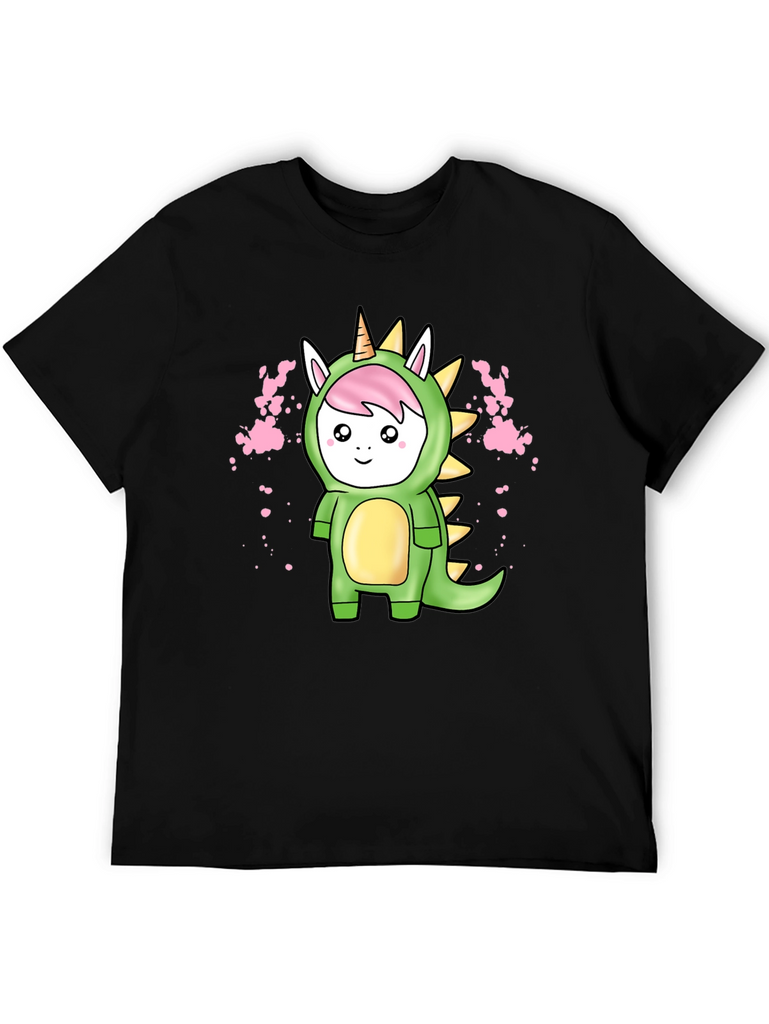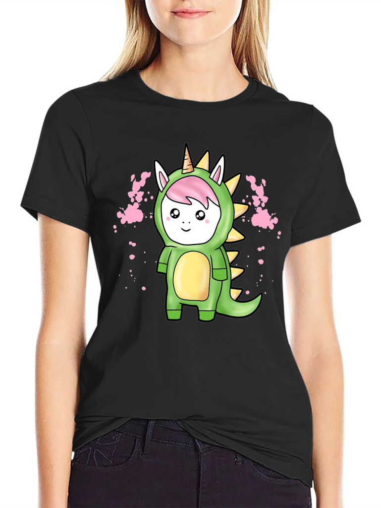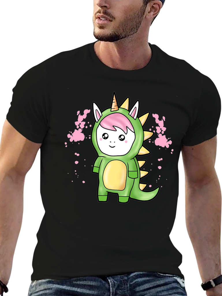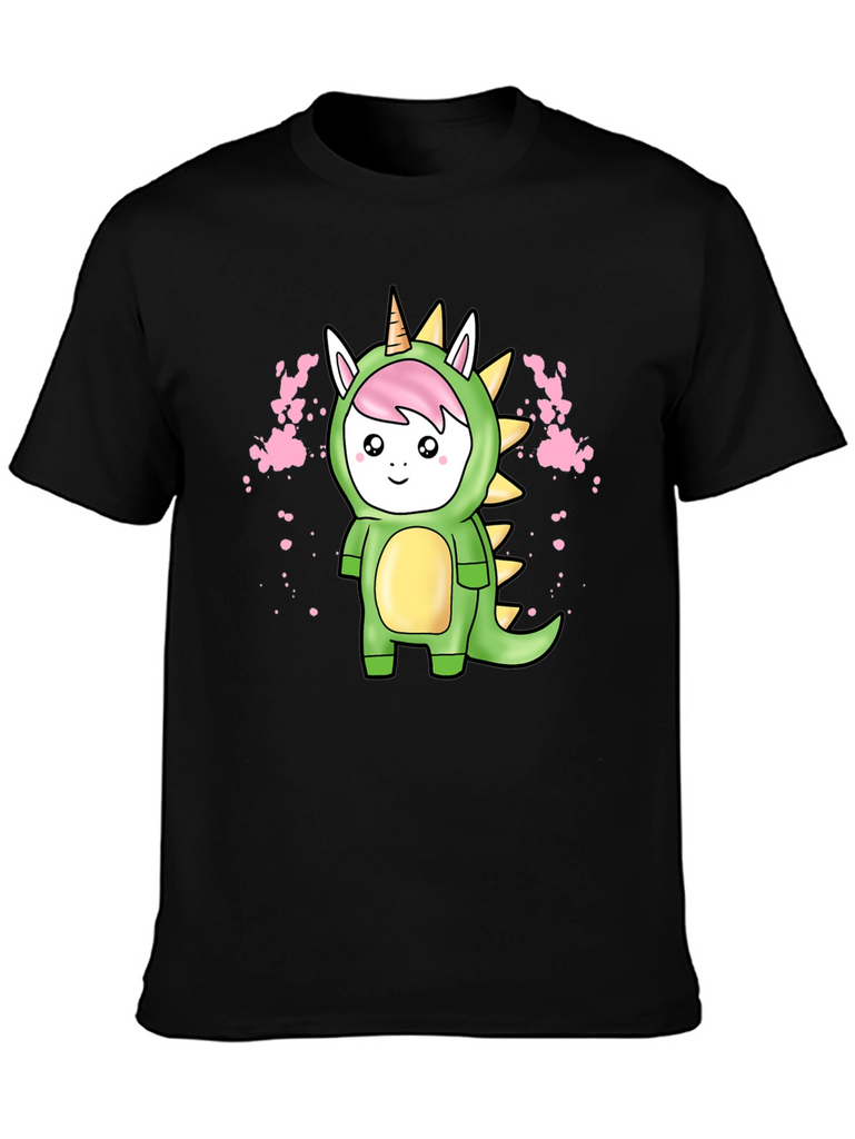 This eye-catching black t-shirt features a cute and quirky unicorn dinosaur design. The cartoon character is dressed in a green dinosaur costume with yellow accents, complete with a unicorn horn and pastel pink hair. Pink watercolor-style splashes surround the image, adding a playful touch. Made from comfortable material, this tee is perfect for casual wear, themed parties, or as a fun gift for anyone who loves fantasy creatures and unique apparel. Stand out with this one-of-a-kind design that blends the magic of unicorns with the prehistoric charm of dinosaurs.