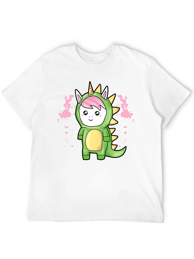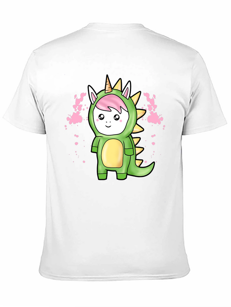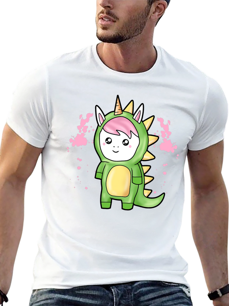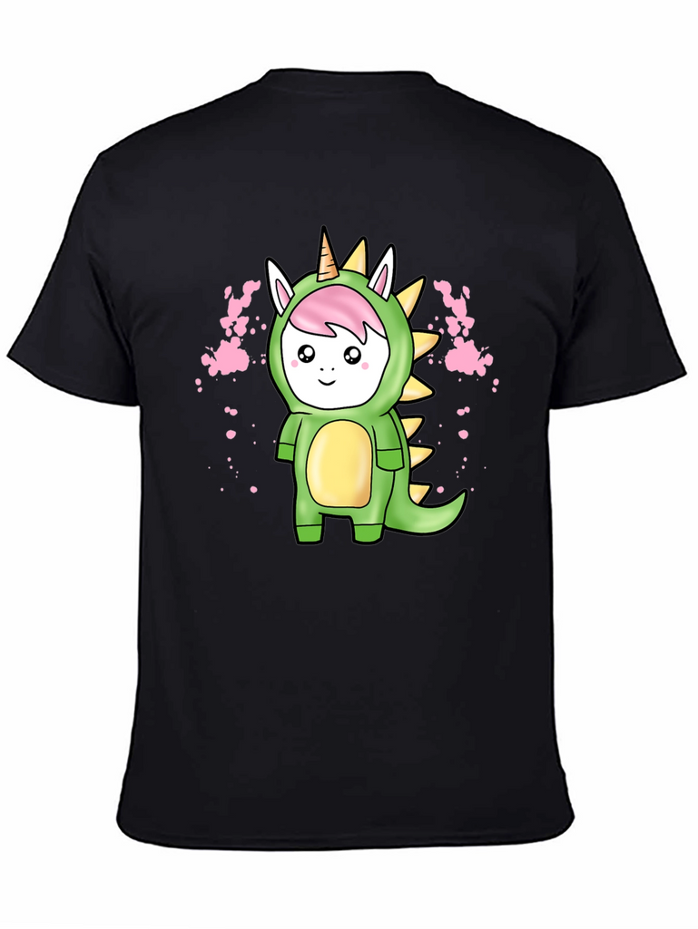 This eye-catching black t-shirt features a cute and quirky unicorn dinosaur design. The cartoon character is dressed in a green dinosaur costume with yellow accents, complete with a unicorn horn and pastel pink hair. Pink watercolor-style splashes surround the image, adding a playful touch. Made from comfortable material, this tee is perfect for casual wear, themed parties, or as a fun gift for anyone who loves fantasy creatures and unique apparel. Stand out with this one-of-a-kind design that blends the magic of unicorns with the prehistoric charm of dinosaurs.