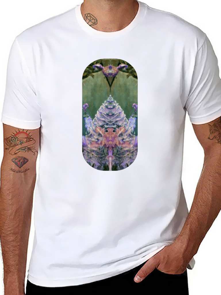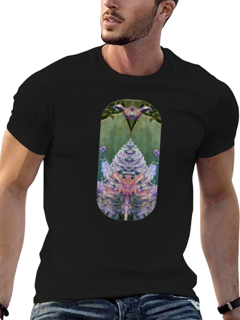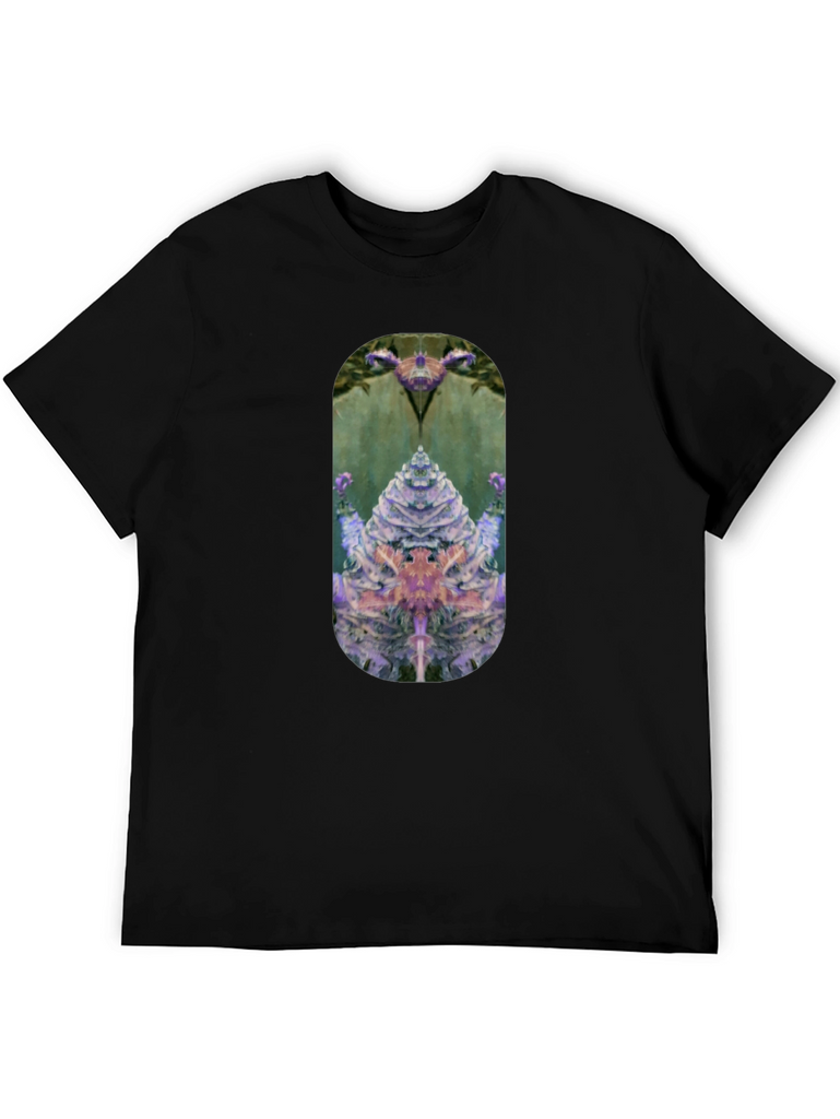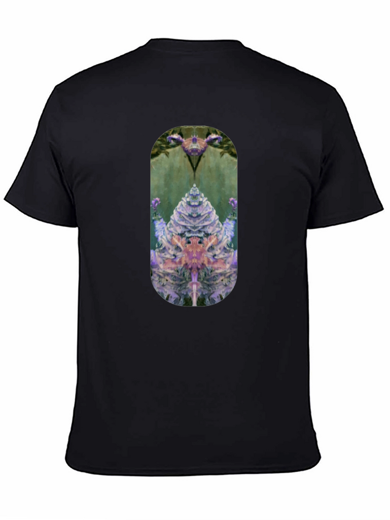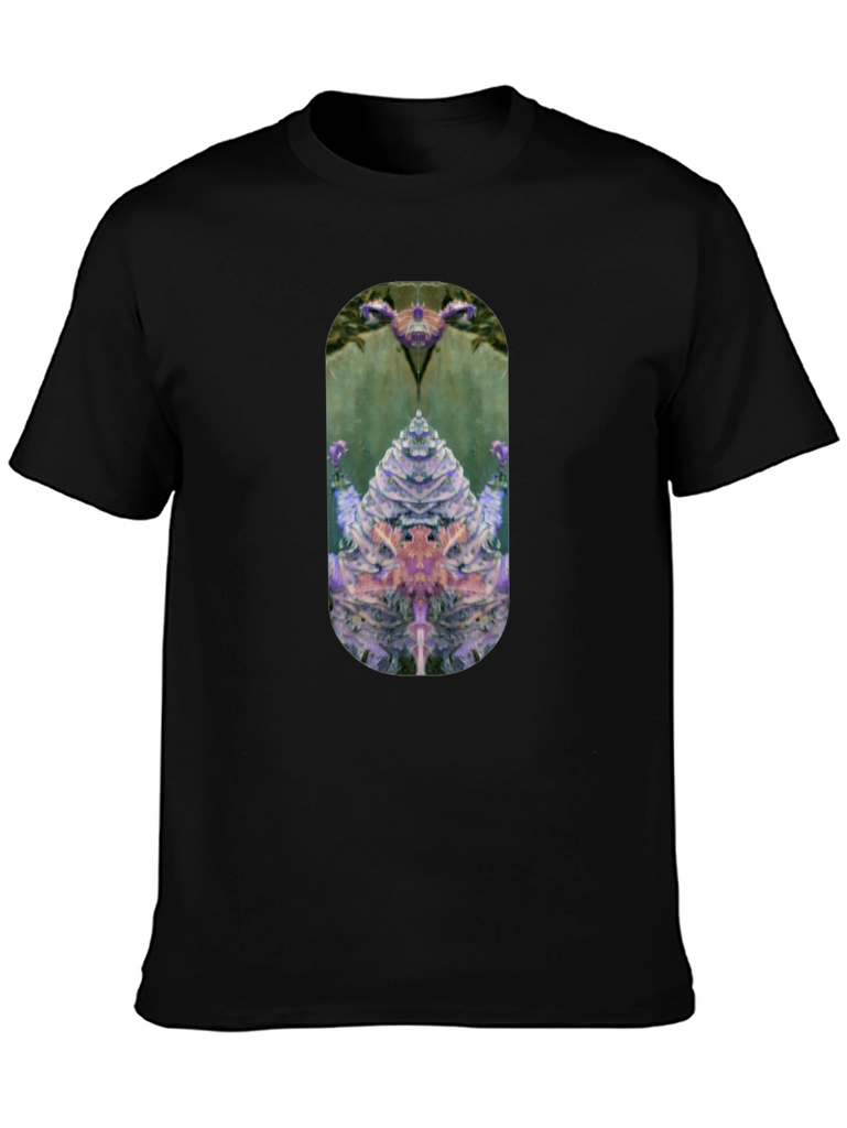 Showcase your style with this unique black t-shirt, featuring a striking botanical print. The design is a mirrored abstract of violet, green, and white shades. This tee is made of what appears to be soft, breathable cotton. Its short sleeves and classic fit make it a versatile choice for casual wear. Stand out from the crowd and express your love for nature with this wearable art piece. Ideal for everyday wear or as a statement piece.