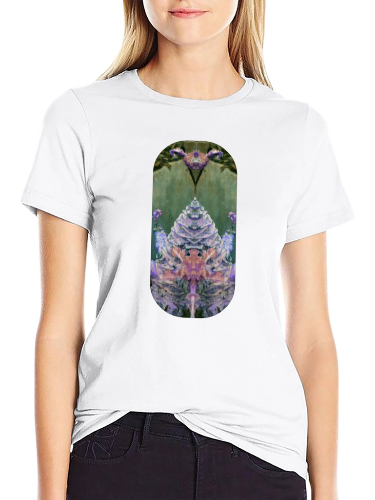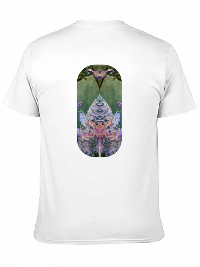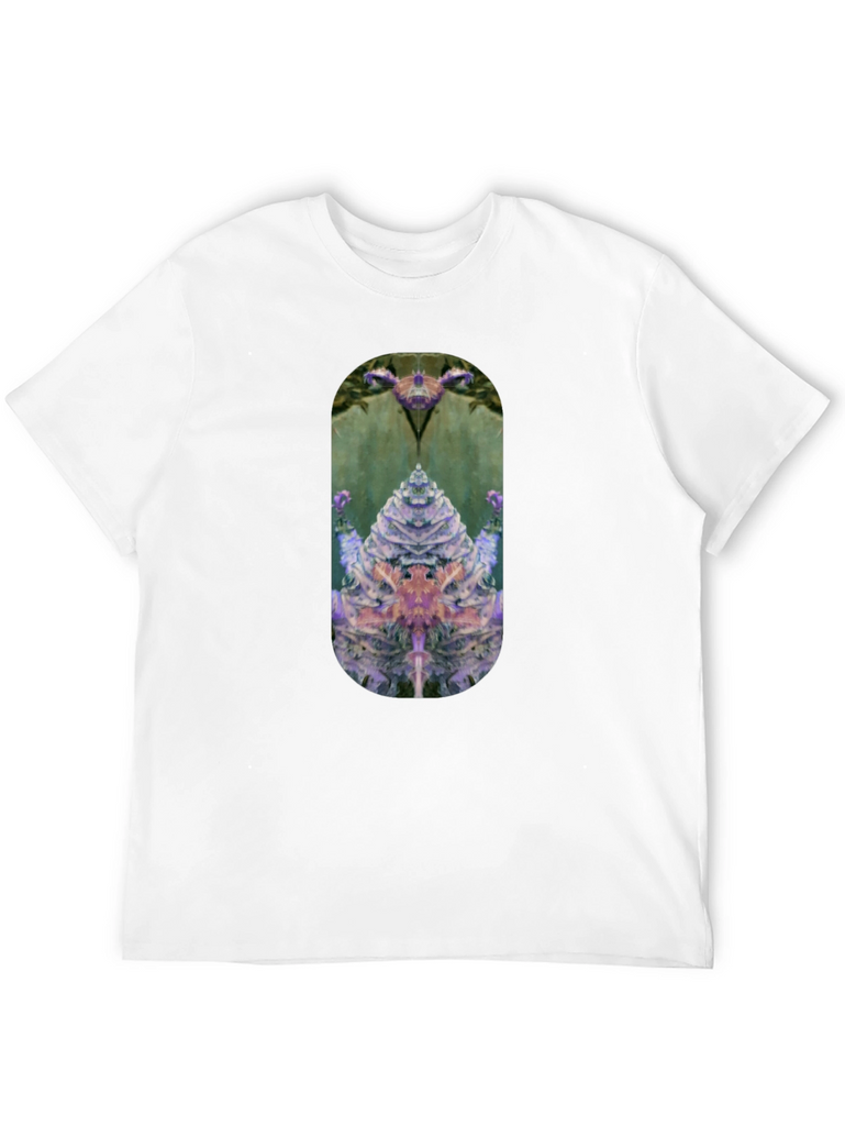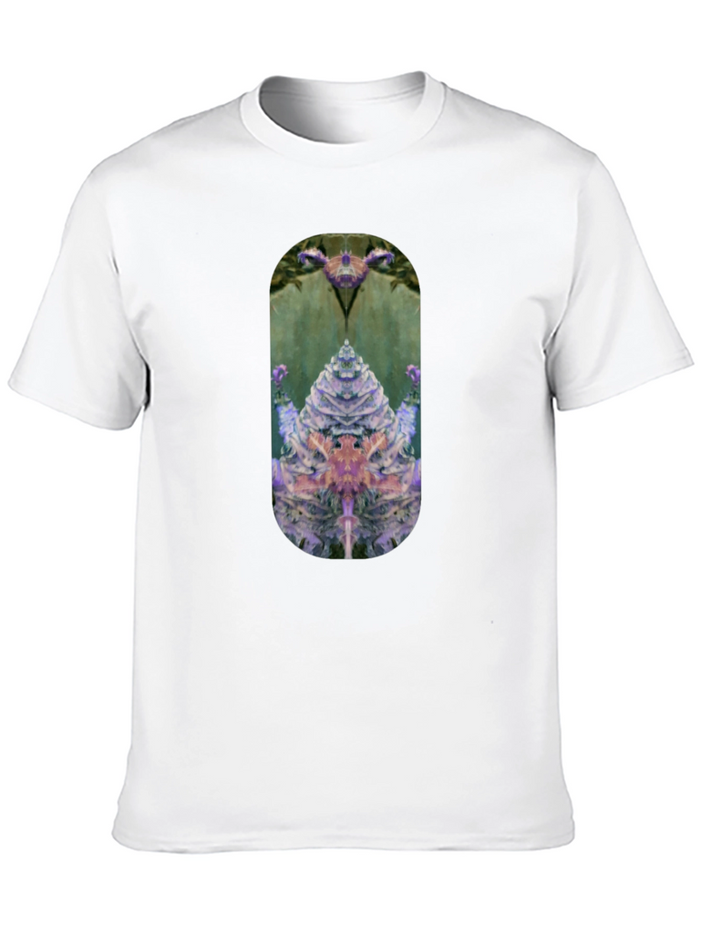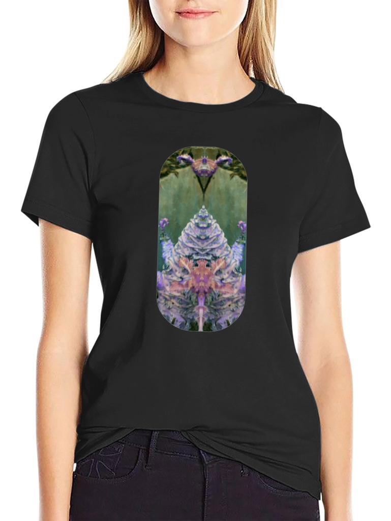 Showcase your style with this unique black t-shirt, featuring a striking botanical print. The design is a mirrored abstract of violet, green, and white shades. This tee is made of what appears to be soft, breathable cotton. Its short sleeves and classic fit make it a versatile choice for casual wear. Stand out from the crowd and express your love for nature with this wearable art piece. Ideal for everyday wear or as a statement piece.
