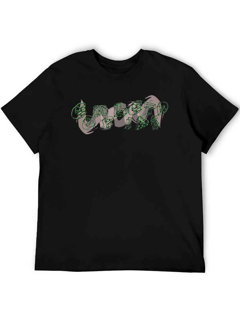 Elevate your casual wardrobe with this eye-catching black T-shirt. The tee features a unique graphic design in shades of green and grey, adding a modern edge to a classic style. Made from what appears to be a soft, comfortable fabric, this T-shirt offers a relaxed fit for all-day wear. The short sleeves and crew neck make it a versatile piece that can be styled in many ways. Perfect for expressing your individuality. Pair this tee with jeans or shorts for a laid-back look, or dress it up with a blazer for a more fashionable ensemble. This is a must-have for anyone who wants to make a style statement.