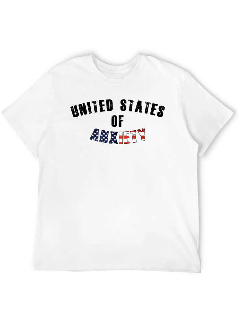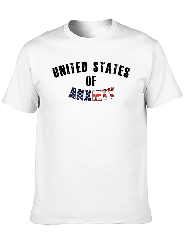 Show your feelings in this unique tee. This T-shirt features "UNITED STATES OF" printed in bold black letters on the front, with "ANXIETY" written below using the colors of the American flag. The shirt has a classic crew neck and short sleeves. It is made of soft fabric that will keep you comfortable all day long. Perfect for expressing yourself, this T-shirt is ideal for casual wear. Get yours today!
