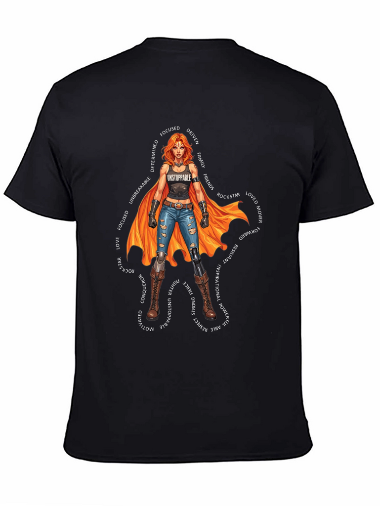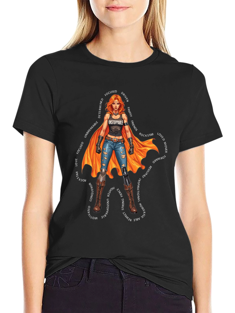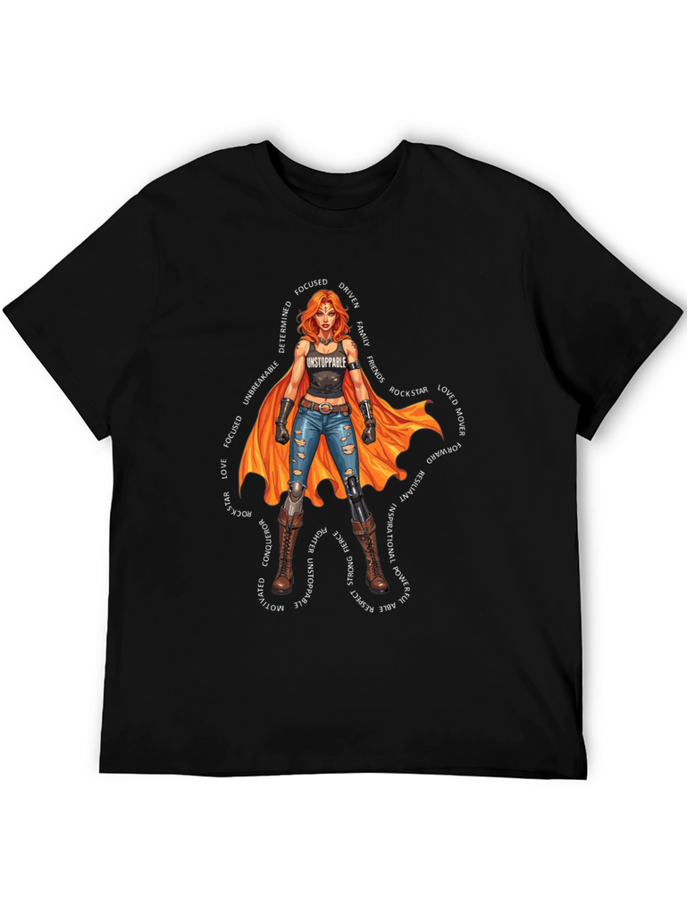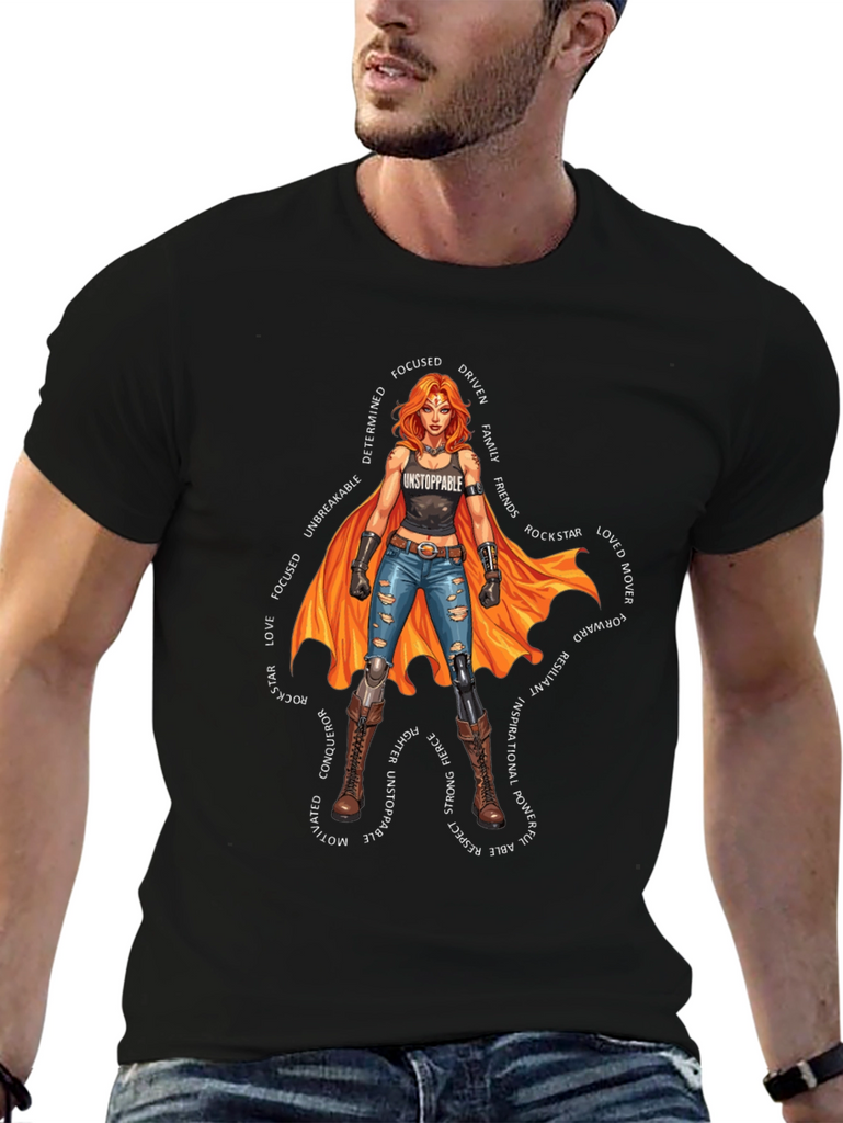 This black t-shirt features a vibrant graphic of a determined woman, depicted as a modern-day superhero. She's dressed in jeans, boots, and a cape, with the word "Unstoppable" emblazoned across her chest. Surrounding the central figure are empowering words like "Focused," "Driven," "Resilient," and "Inspirational", forming a halo of positive affirmations. The shirt's design promotes confidence, strength, and the idea of overcoming obstacles. It's a stylish and meaningful addition to any wardrobe, perfect for expressing your inner power and inspiring those around you. Made with comfortable fabric, this tee is ideal for casual wear or as a statement piece.