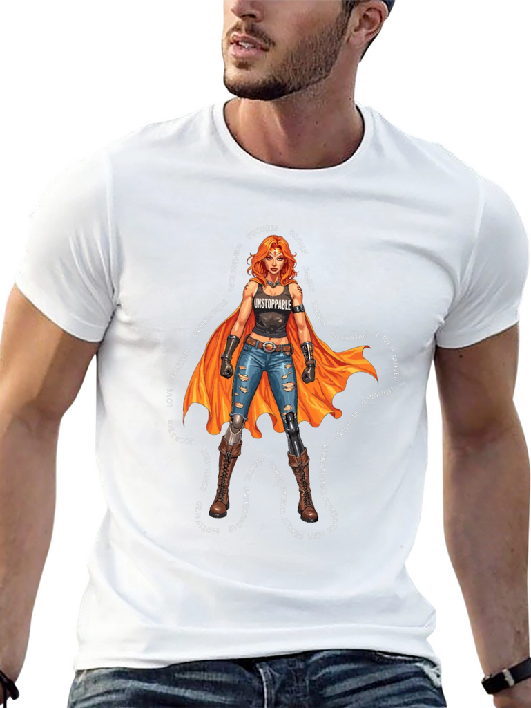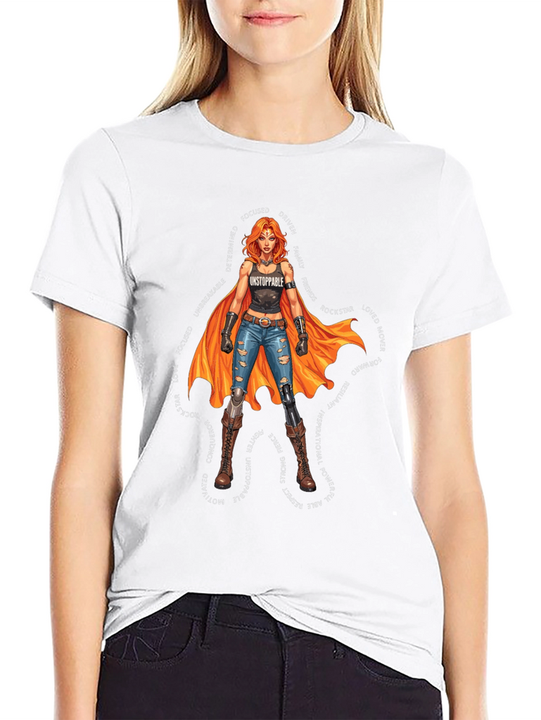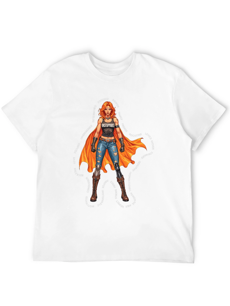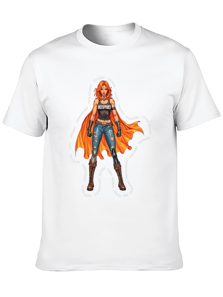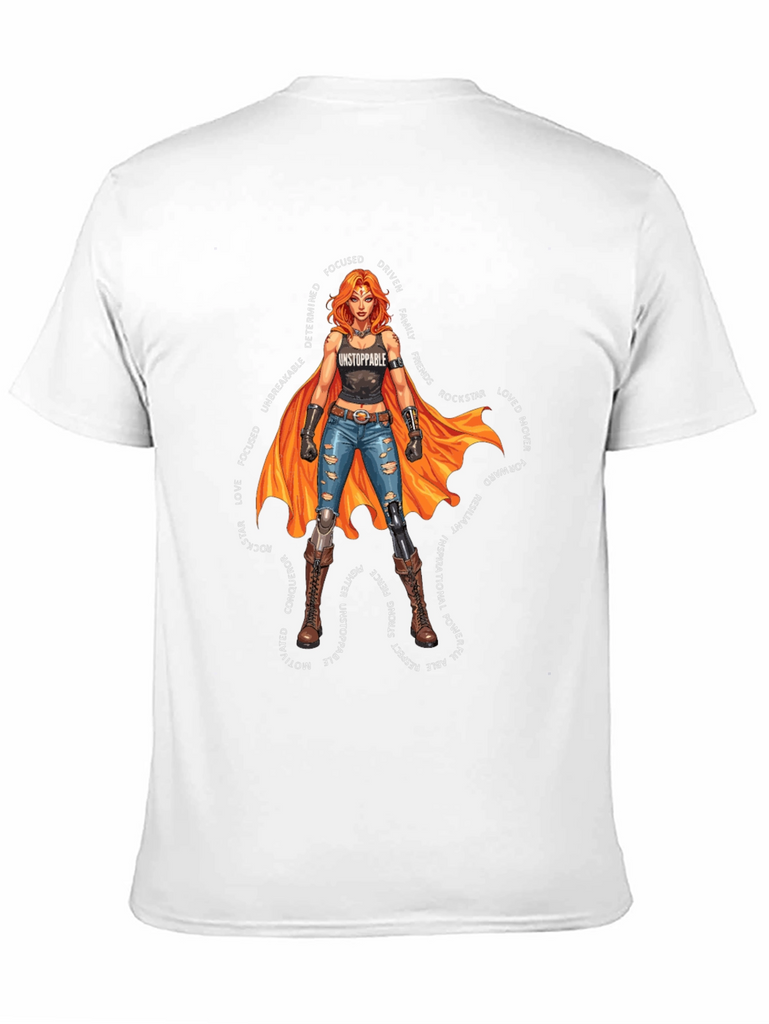 This black t-shirt features a vibrant graphic of a determined woman, depicted as a modern-day superhero. She's dressed in jeans, boots, and a cape, with the word "Unstoppable" emblazoned across her chest. Surrounding the central figure are empowering words like "Focused," "Driven," "Resilient," and "Inspirational", forming a halo of positive affirmations. The shirt's design promotes confidence, strength, and the idea of overcoming obstacles. It's a stylish and meaningful addition to any wardrobe, perfect for expressing your inner power and inspiring those around you. Made with comfortable fabric, this tee is ideal for casual wear or as a statement piece.