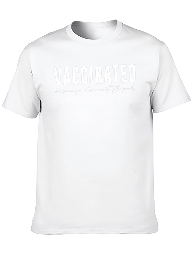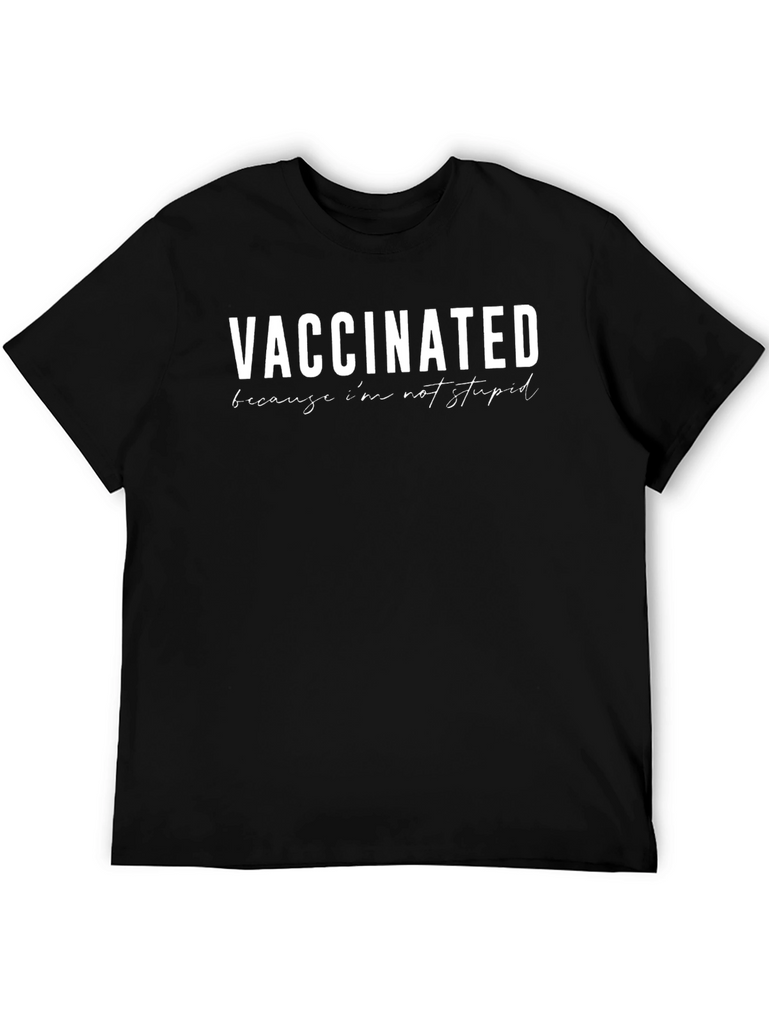 Show your stance with this bold statement t-shirt. The black tee features the text "Vaccinated" in bold white lettering, followed by "because I'm not stupid" in a stylish script font. Made from a comfortable-looking fabric, this tee is perfect for everyday wear, rallies, or casual outings. Wear it to voice your support for vaccination while adding a touch of humor to your wardrobe. This tee combines comfort, style, and a clear message, making it a must-have for anyone who wants to make a statement.