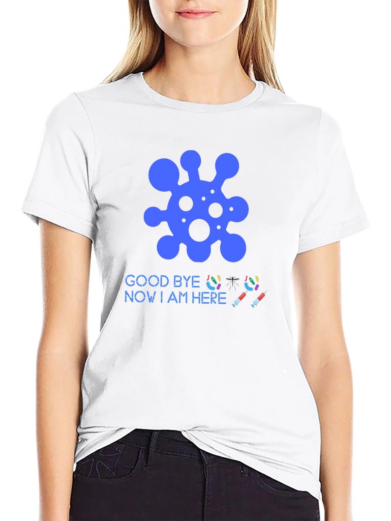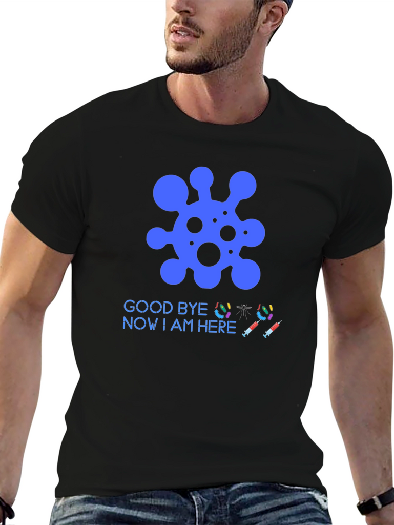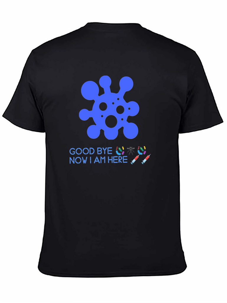 Show off your enthusiasm for vaccines with this unique black t-shirt. The design features a stylized blue virus graphic above a witty message: "GOOD BYE, NOW I AM HERE" with two vaccine syringe graphics. Made from comfortable, breathable fabric, this shirt is perfect for everyday wear, casual outings, or showing your support for science and vaccination. The high-quality print ensures lasting vibrancy, so you can spread the message of hope and immunity in style. Stand out and make a statement!