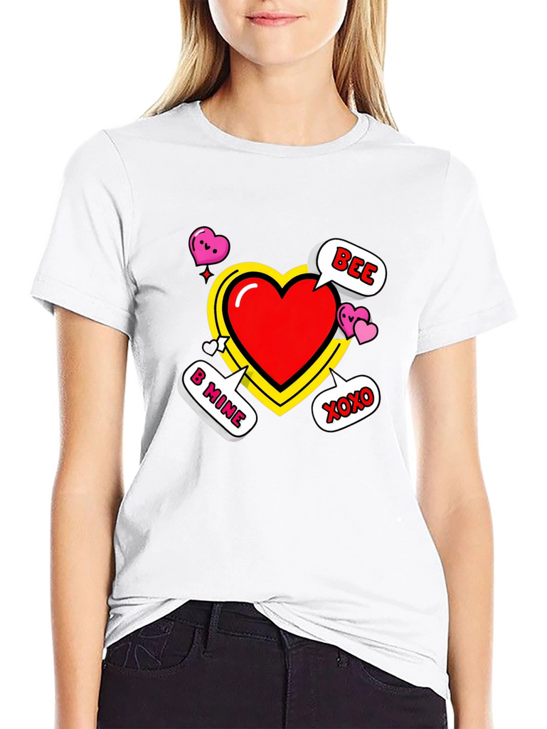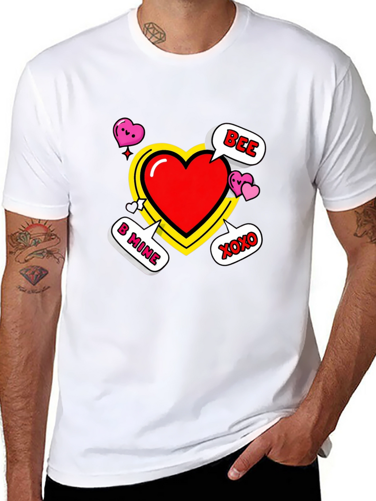 Show your love with this unique Valentine's Day t-shirt! The black tee features a vibrant graphic of a red heart outlined in yellow, surrounded by playful speech bubbles with sweet messages like 'B Mine,' 'Bee,' and 'XOXO.' Perfect for expressing your affection in a fun and stylish way. Made from a comfortable material, this shirt is ideal for casual wear, Valentine's Day dates, or as a thoughtful gift for your loved one. Grab this eye-catching shirt and spread the love this season!
