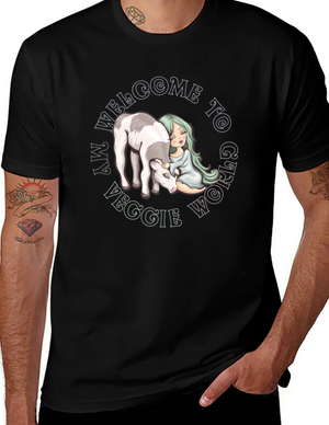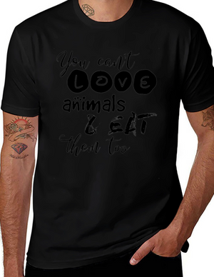 This black t-shirt features a vintage-style graphic that playfully defines the word 'Vegan.' The design includes the word "VEGAN" in bold, multi-colored lettering (red, orange, yellow, blue), accented with horizontal stripes above and below. Below the word, it provides a humorous definition, referring to the common question vegans receive about protein sources. Made from a soft-looking fabric, this tee offers both comfort and style. It's perfect for everyday wear, casual outings, or as a conversation starter to express your vegan lifestyle with a touch of humor. Ideal for vegans and animal lovers.