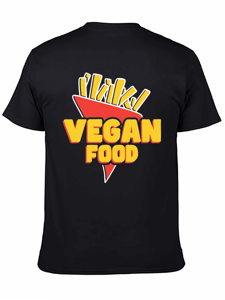 Show off your plant-based pride with this bold black graphic tee. Featuring a playful "Vegan Food" design with vibrant yellow lettering outlined in contrasting shades, paired with french fry-esque icons above. Perfect for casual wear, vegan festivals, or making a statement. The soft, breathable fabric ensures all-day comfort, while the classic fit makes it a versatile addition to any wardrobe. Spread the vegan message with style and comfort!